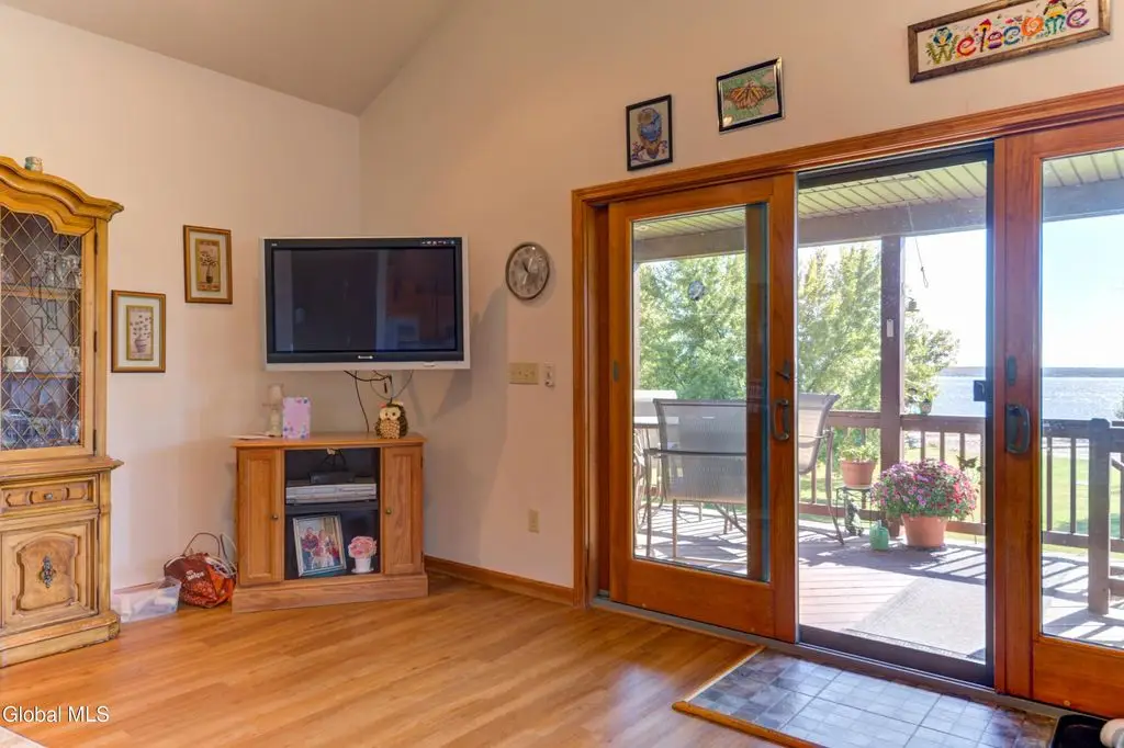 Embrace lakeside living at its best with this spacious 7-bedroom, 4-bath home on the shores of Great Sacandaga Lake. Perfectly positioned on a quiet dead-end road in Mayfield, this 3,798 sq ft retreat boasts 120' of direct waterfront with a sandy beach, private dock, and sweeping panoramic views that sparkle from sunrise to sunset. The main residence offers 4 bedrooms and 2.5 baths, highlighted by a first-floor en-suite and a sun-filled open layout where the kitchen, dining, and living areas flow together around a cozy stone-hearth fireplace. Step through sliding glass doors to a generous deck designed for taking in lake breezes, morning coffee with a view, or evenings by the water. Upstairs, two additional bedrooms and a full bath provide space for family and friends, while a two-car garage adds convenience. For extended family or guests, the in-law apartment is a private haven with its own entrance up a flight of stairs, covered balcony overlooking the lake, 3 bedrooms, full bath, open living/kitchen/dining area, laundry, separate utilities, and even its own garage - perfect for hosting.A partially finished basement with wood stove and workshop adds flexibility, while outside the fun continues with a sprawling lawn, sandy beach, and dock ready for swimming, boating, and endless summer gatherings. With parking for 8, a paved drive, and close access to dining and amenities, this one-of-a-kind lakefront property invites you to live, play, and make lasting memories all year long.