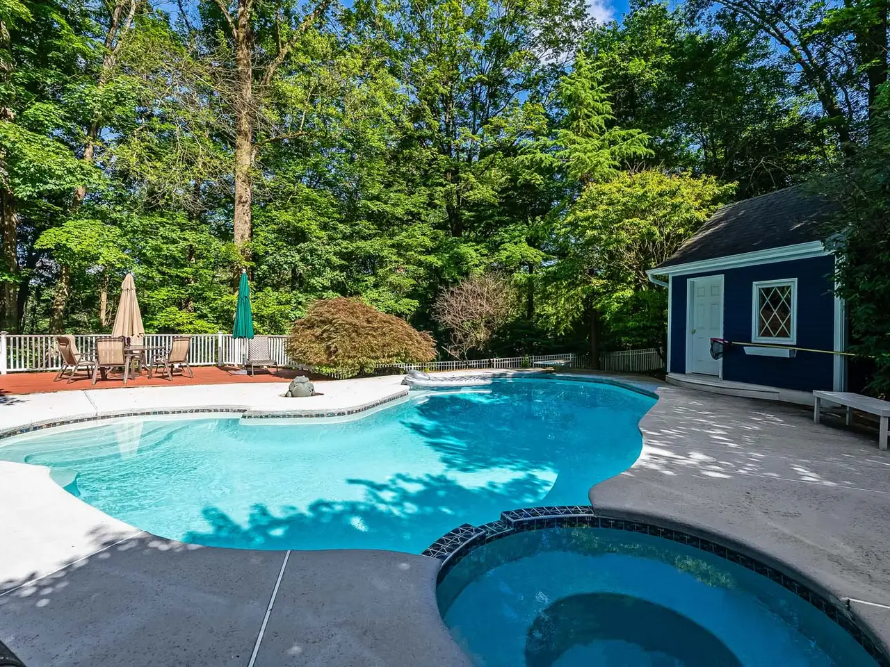 Welcome to this breathtaking ranch-style retreat, ideally situated on a quiet, private cul-de-sac in desirable Mendham Township. Step into the grand foyer, where soaring ceilings, exposed wood beams, and floor-to-ceiling windows flood the space with natural light, setting the tone for this expansive and inviting home. Designed for both tranquility and functionality, this 4-bedroom ranch offers the ease of single-level living with luxurious touches throughout. Enjoy the custom gourmet kitchen outfitted with high-end stainless steel appliances, flowing seamlessly into a dramatic dining room, perfect for hosting gatherings. Just beyond, a charming side porch offers peaceful views of the lush, tree-lined backyard. At the heart of the home is the living room, featuring striking wood beams, oversized windows, and a cozy fireplace, making it the perfect space to relax or entertain. The main level includes three spacious bedrooms with a serene primary suite and spa-inspired bath. Downstairs, the walk-out lower level offers exceptional versatility with a large billiards room, a home gym, private office, fourth bedroom and a fully equipped in-law suite with a kitchenette and its own entrance. Step outside to enjoy the beautifully landscaped grounds, complete with a bluestone patio and a sparkling pool surrounded by nature creating a true resort-like atmosphere in your own backyard. Located on the east side of town with direct access to Patriot's Path, this home combines convenient one-floor living, a peaceful setting, and a premier location. A rare opportunity not to be missed.