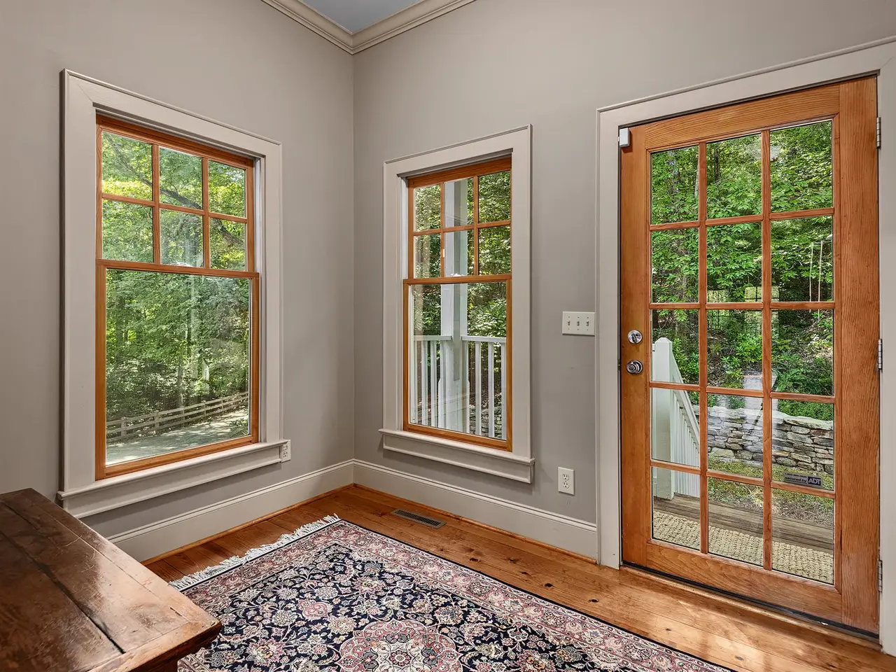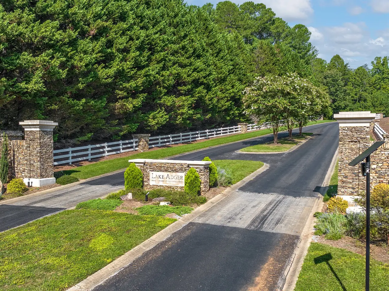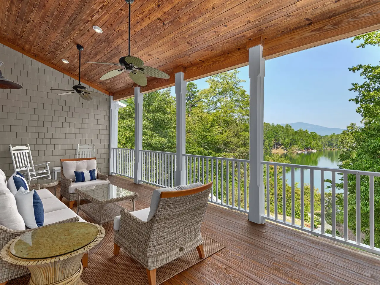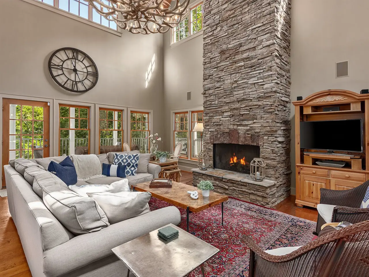 Idyllic lakefront home tucked in a private cove on Lake Adger is the perfect mountain getaway! Featuring year-round lake and mountain views, this home sits close to the water and has a gentle sloped yard with stone pathway to the lake and your own floating dock. This home checks all the boxes including an open floor plan, a large versatile kitchen, warm pine wood floors, and a marvelous great room with a dramatic two-story stacked stone fireplace and vaulted wood ceilings. The rooms are spacious, and the ceilings are almost 10' tall throughout. Relax and listen to the splashing creek from the wraparound covered porch or terrace level patio. Create the ultimate home office on the second level loft. Invite all of your friends because there is plenty of room including a terrace level family room with entertainment kitchenette, a large bunk room, and bonus rooms throughout. Loads of storage, and an attached tandem garage with plenty of room to store your water toys. This is the lake life!