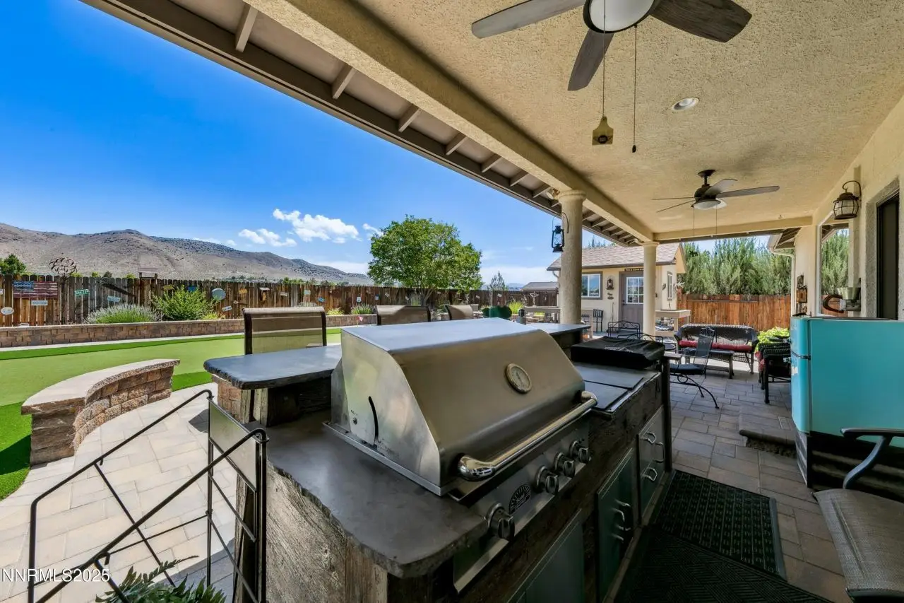 Beautifully Maintained Home with Outdoor Entertainer's Dream! Situated on a spacious 0.33-acre lot, this immaculate home features a beautifully remodeled kitchen and primary bathroom, laminate flooring throughout, and elegant plantation shutters. The stunning backyard and front yard boasts two serene water features, a fully equipped outdoor kitchen, putting green, and a man cave in the outdoor shed. Enjoy access to open space and nearby trails, plus RV parking and a newly epoxied garage floor. A perfect blend of comfort, style, and outdoor fun-ideal for entertaining!