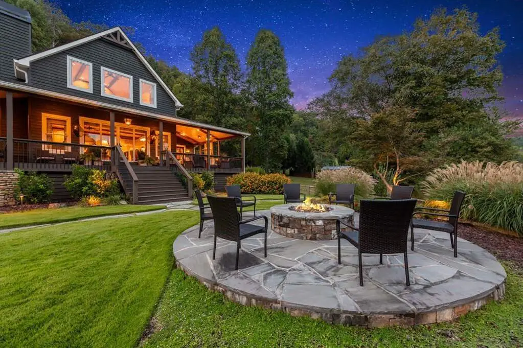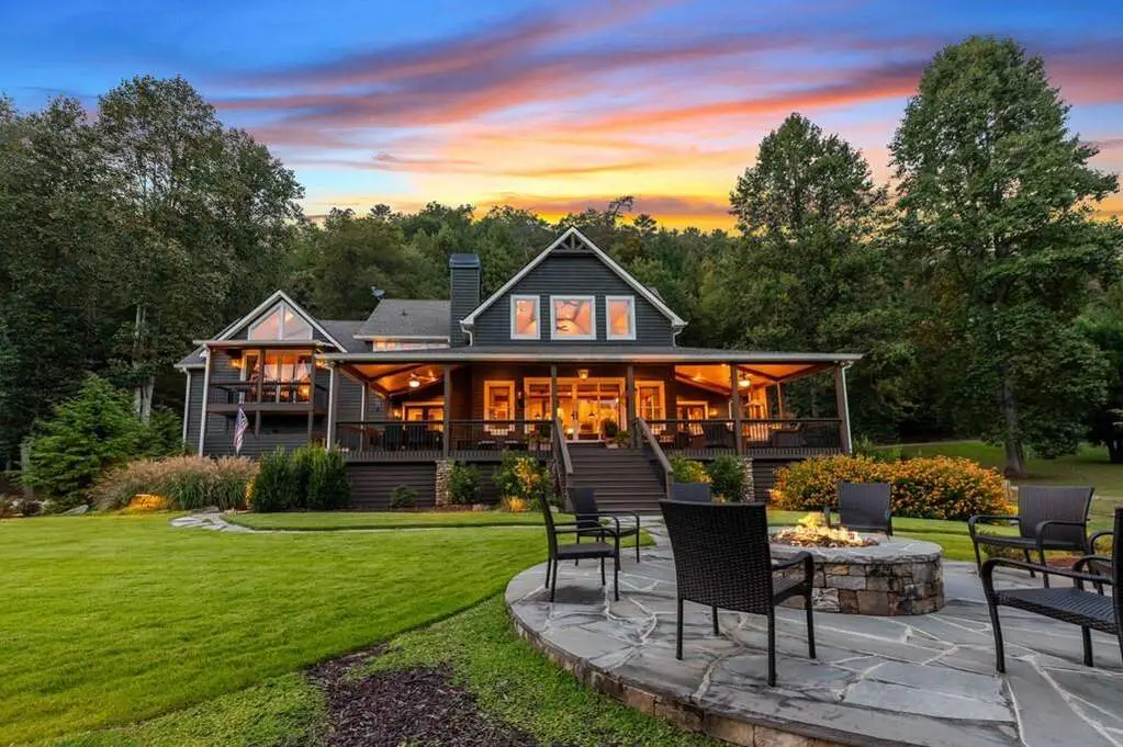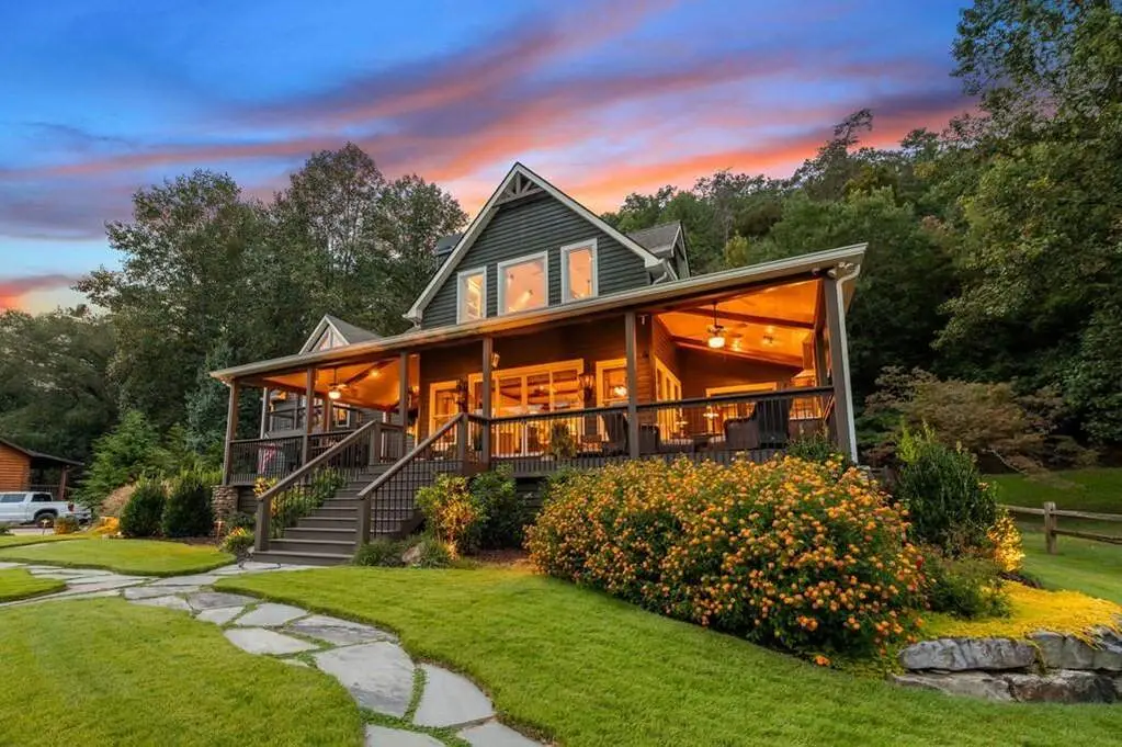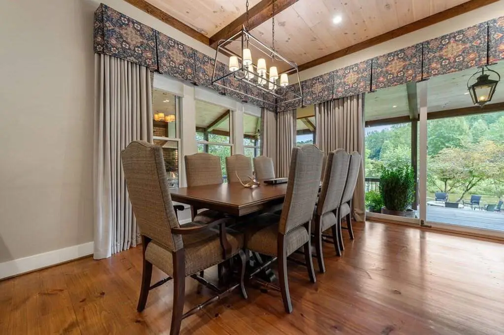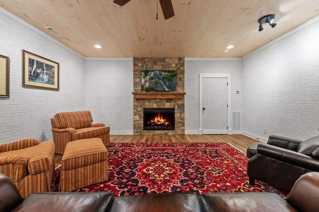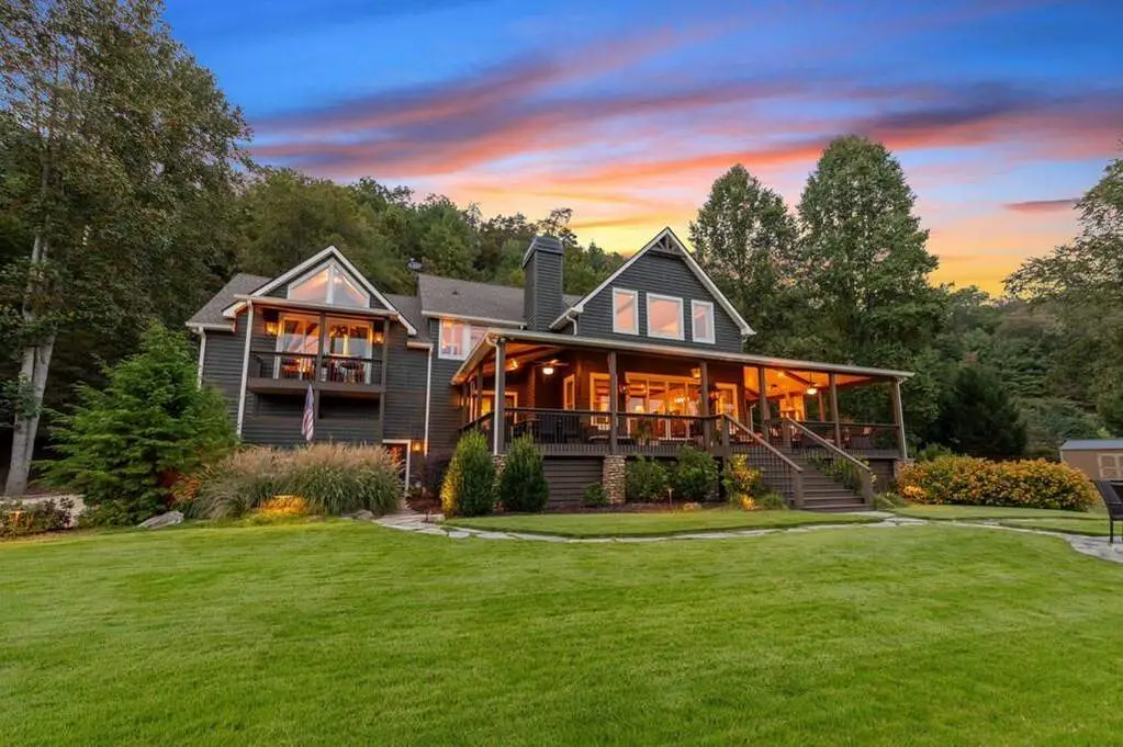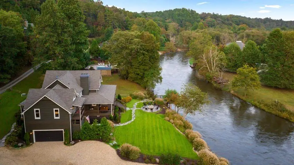 River's Edge is a 6-bedroom, 5-bathroom, fully furnished home with 114' of Toccoa River frontage. It underwent a complete remodel and landscape transformation in 2020, interior designed by Cindy Trimble of Studio Trimble Design of Blue Ridge, GA. The home has 5643 (+/-) heated and cooled sq. ft., 1,400 sq. ft. of front porch, 1,600 sq. ft. of porch facing the river, 16x16 deck extending over the river, a hot tub, and rock firepit with two sets of rock steps leading to the river. The kitchen, living, and dining areas are all open with lots of counter space for cooking and entertaining. Beautiful wide-plank eastern pine floors are featured throughout, with Persian rugs and tasteful dcor that provide a sophisticated lodge feel. The home has three master suites, two on the main floor and one on the second floor. The second-floor master suite features three closets, double vanity sinks, large walk-in shower with separate soaker tub, and heated floors. The second floor also has a bedroom with three single beds and one double bed, plus a full bathroom. The basement has a large living area; two bedrooms, one with a queen bed, and one with four full beds; a full bathroom with double sinks, and walk-in shower. There are four Tennessee fieldstone fireplaces in the home. Located above the garage is a bonus/billiards room with vaulted ceiling, bar, and private balcony. The back porch overlooking the river features a cooking area with a built-in grill and bar fridge along with a sitting area and custom-made dining table that seats eight. The professionally landscaped yard features Zeon Zosia grass, underground drainage, irrigation system, outdoor accent lighting, and camera system. With access to two fish weirs, and a fish feeder that feeds trout daily, it offers some of the best fishing on the tailwater! The attention to detail in this home is something to see and appreciate.