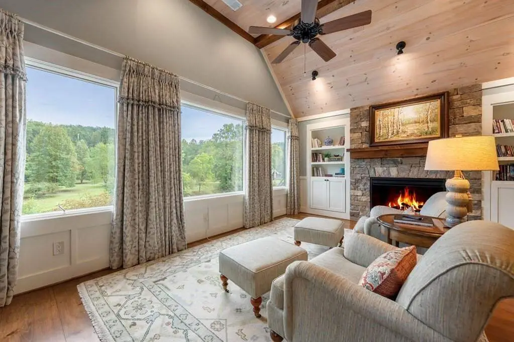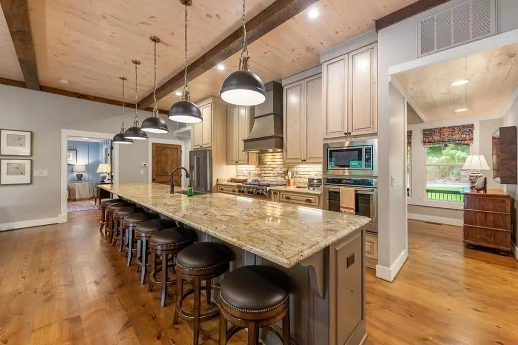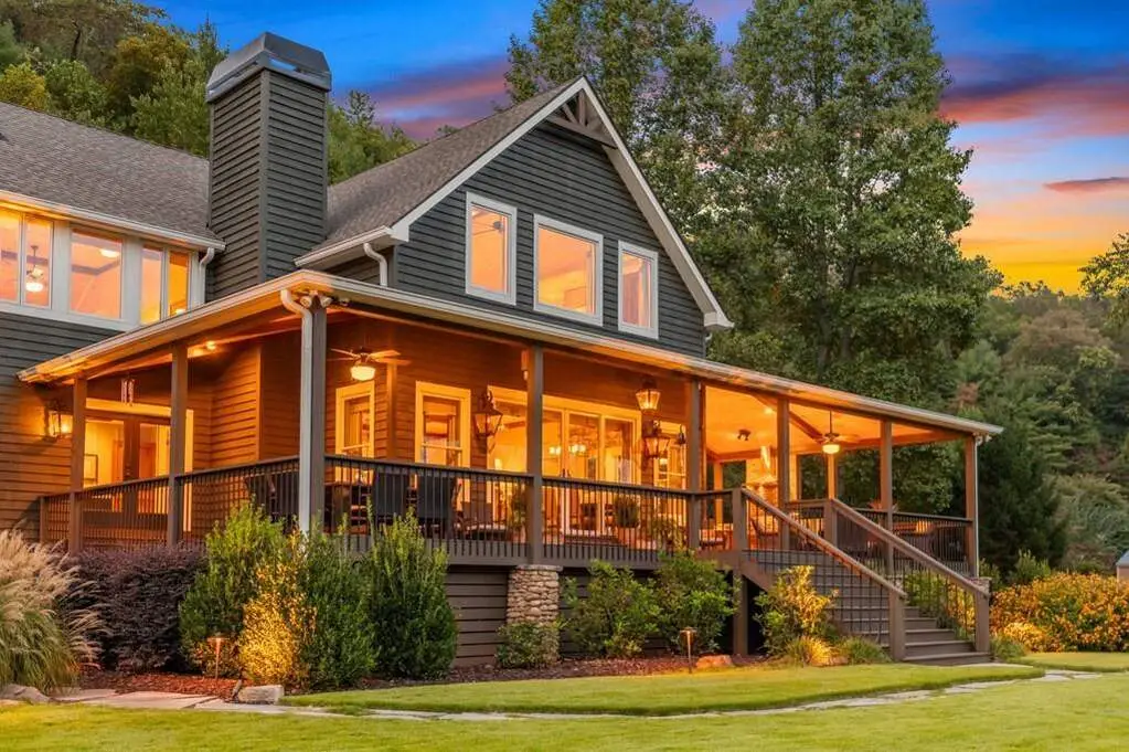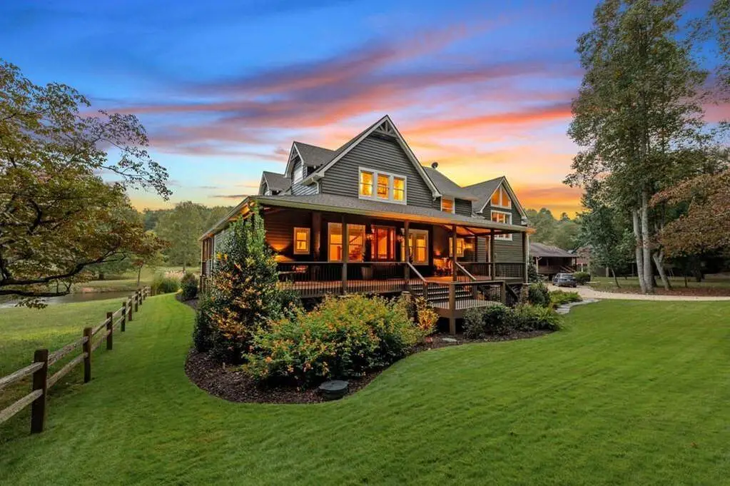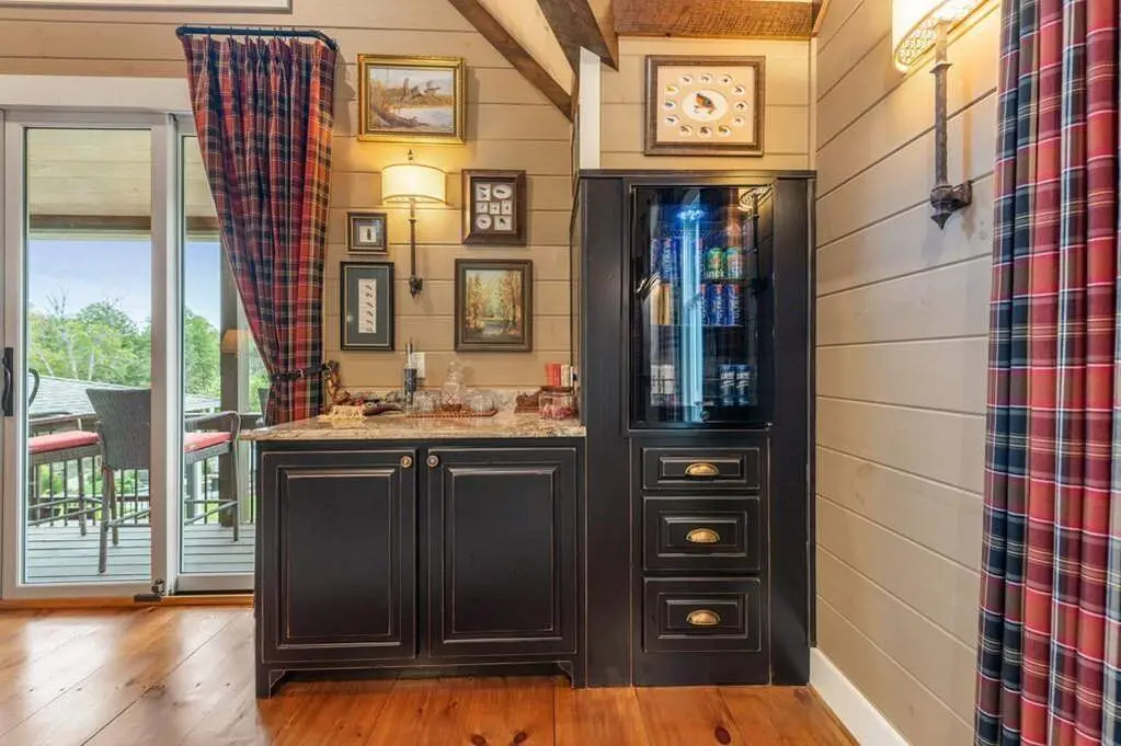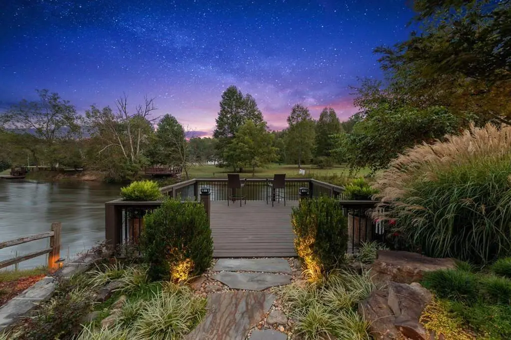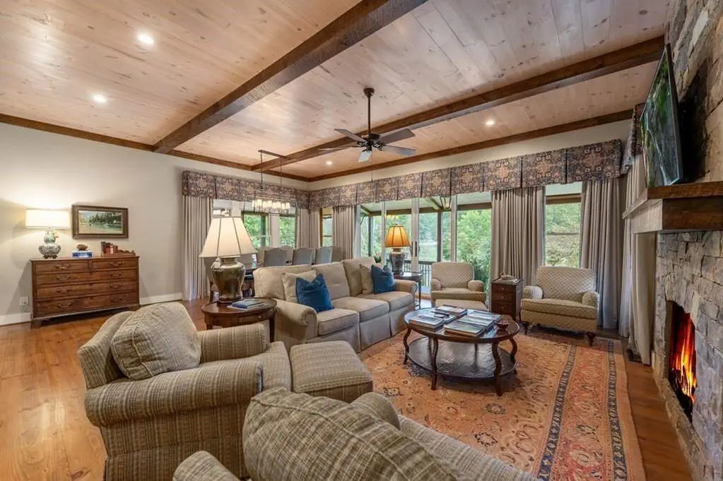 River's Edge is a 6-bedroom, 5-bathroom, fully furnished home with 114' of Toccoa River frontage. It underwent a complete remodel and landscape transformation in 2020, interior designed by Cindy Trimble of Studio Trimble Design of Blue Ridge, GA. The home has 5643 (+/-) heated and cooled sq. ft., 1,400 sq. ft. of front porch, 1,600 sq. ft. of porch facing the river, 16x16 deck extending over the river, a hot tub, and rock firepit with two sets of rock steps leading to the river. The kitchen, living, and dining areas are all open with lots of counter space for cooking and entertaining. Beautiful wide-plank eastern pine floors are featured throughout, with Persian rugs and tasteful dcor that provide a sophisticated lodge feel. The home has three master suites, two on the main floor and one on the second floor. The second-floor master suite features three closets, double vanity sinks, large walk-in shower with separate soaker tub, and heated floors. The second floor also has a bedroom with three single beds and one double bed, plus a full bathroom. The basement has a large living area; two bedrooms, one with a queen bed, and one with four full beds; a full bathroom with double sinks, and walk-in shower. There are four Tennessee fieldstone fireplaces in the home. Located above the garage is a bonus/billiards room with vaulted ceiling, bar, and private balcony. The back porch overlooking the river features a cooking area with a built-in grill and bar fridge along with a sitting area and custom-made dining table that seats eight. The professionally landscaped yard features Zeon Zosia grass, underground drainage, irrigation system, outdoor accent lighting, and camera system. With access to two fish weirs, and a fish feeder that feeds trout daily, it offers some of the best fishing on the tailwater! The attention to detail in this home is something to see and appreciate.