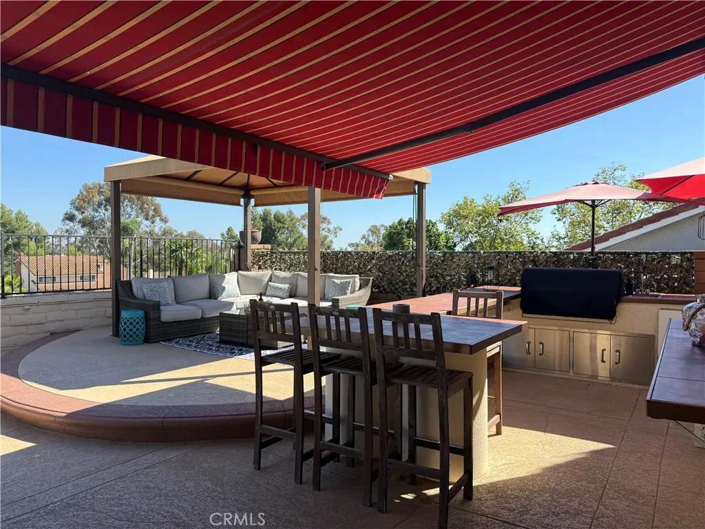 Outdoor living space with built-in BBQ, awnings, and gazebo