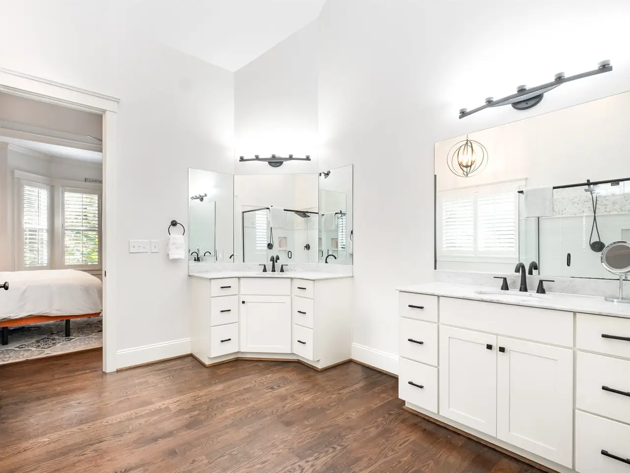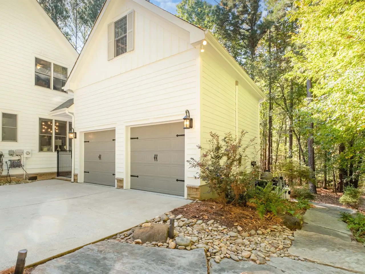 This modern luxury estate in The Farms offers true resort living on 2.1 private acres. Bordered by protected water-company land and community greenway, it's one of the most private homes in the neighborhood. The 4BR/3.5BA main home features soaring ceilings, hardwoods throughout (no carpet), designer lighting, neutral paint, and a newly built-in bar. The chef's kitchen includes a 48" gas range with double ovens, drawer microwave, and custom cabinet pantry. A double-sided fireplace opens to a screened deck overlooking the 40' heated saltwater pool with 7' depth, swim-up bar, and 8+ person spa. Outdoor features include stone walkways, bonfire pit. One of the few properties in The Farms with a carriage house, the detached carriage house offers a studio-style space with kitchenette, bath, washer/dryer hookups, and dual-zone mini-split that also temp-controls the garage. Main home has two HVAC units and two hot water tanks, plus a third serving the carriage house. Both garages feature lift-ready ceilings. The Farms amenities include clubhouse, pool, tennis, pickleball, soccer fields, holiday events, and boat/RV storage available. Lake Norman access is just minutes away.