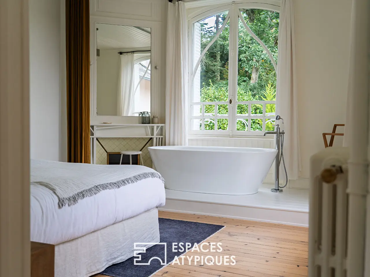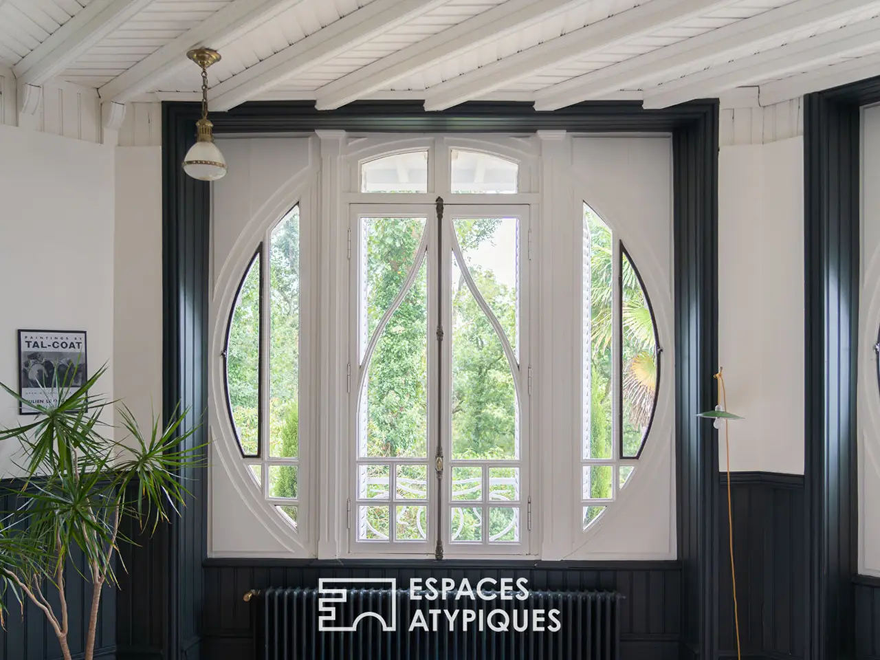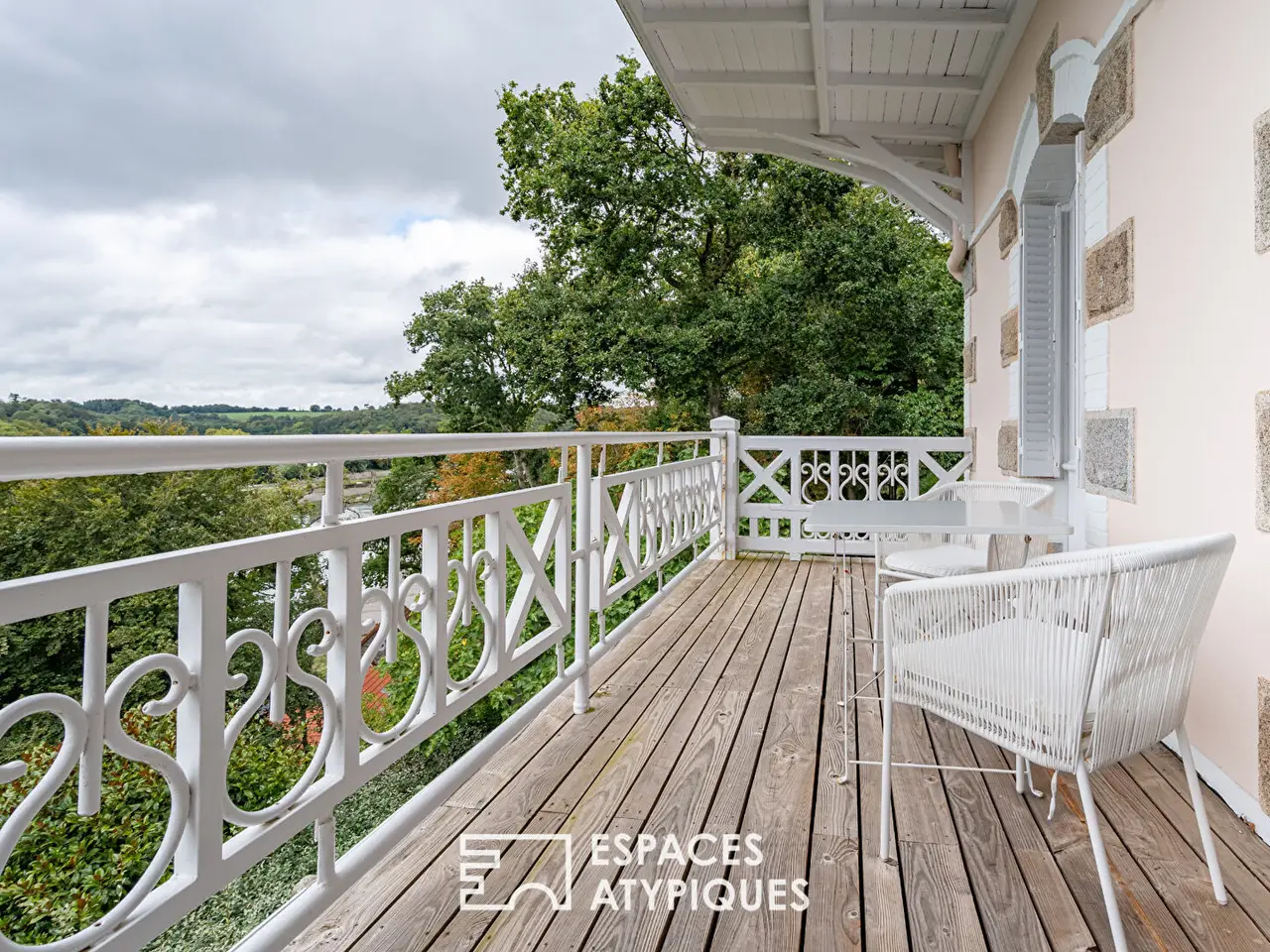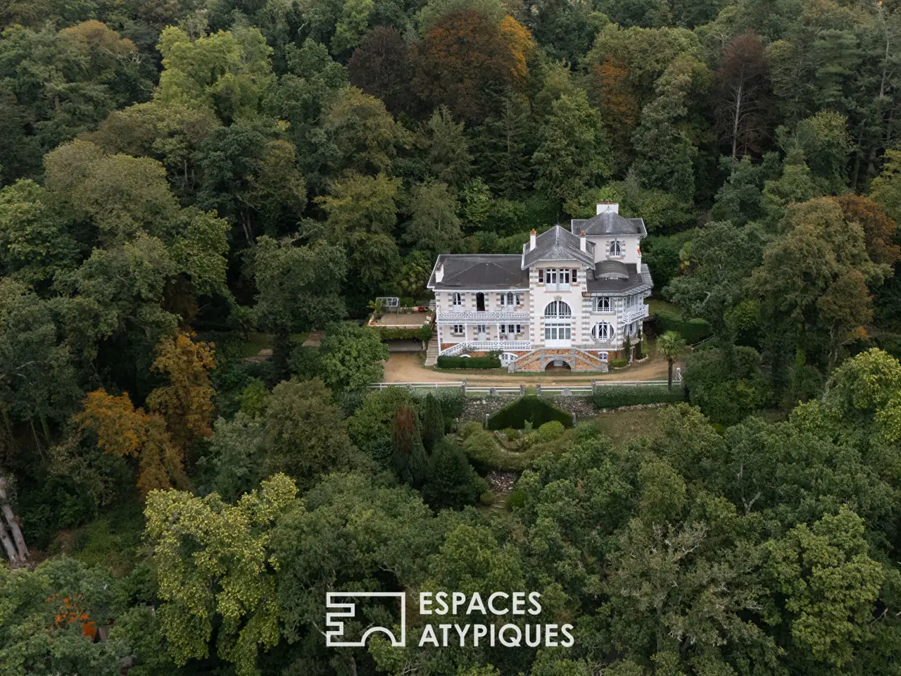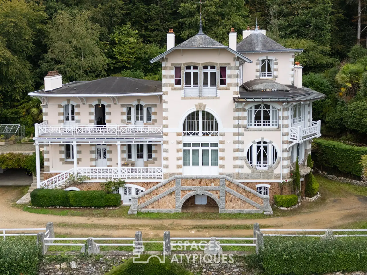 A rare residence, which must be explored and experienced to grasp all its beauty and unique soul. Nestled in the Bay of Morlaix, on the heights of the river, this unique residence embodies the creative effervescence of the early 20th century. Built in 1910 by the architect Charles Croissant, it deploys the flamboyant codes of Art Nouveau, the artistic movement that brought nature and curves into architecture. Its harmonious silhouette, punctuated by light stones, horseshoe-arched bays, and delicate ironwork, tells the story of an era where decorative refinement combined with technical innovation. A rare example of this style in Finistere, it was also the home of the couturier Nina Ricci for thirty years, giving this exceptional place a timeless prestige. Overlooking the river, the property is set in the heart of a park of more than two hectares, a true natural setting. Rhythmic facades, covered galleries, and monumental staircases are revealed like the sculptural features of a belvedere. The terraced gardens, punctuated by paths and groves, create a setting that changes with the seasons. Here, architecture and landscape are in constant dialogue, enhanced by the shifting light of the Bay of Morlaix. Entirely renovated according to the rules of the art, the residence today combines heritage authenticity and modern comfort. The hall, magnified by its high French ceilings, illustrates this subtle alliance between architectural rigor and the softness of a respectful restoration. The main entrance is reached by a stone staircase that runs along the terrace. From the moment you cross the threshold, the tone is set: generous volumes, abundant light, and decorative details typical of Art Nouveau. The vestibule introduces a refined universe where each element seems designed as a work of art. To the right of the vestibule, the bar-smoking room retains the cozy atmosphere of receptions of yesteryear, conducive to exchanges and special moments. Behind its walls clad in deep tones, the space combines elegance and intimacy. Its copper counter, woodwork, coffered ceiling, and play of light create a warm, refined and friendly atmosphere. A truly confidential setting, it embodies the art of hosting in a unique atmosphere. Continuing on, a majestic room unfolds, the true heart of the house. Its ceiling height of over 6.30 meters is immediately impressive and gives the space an almost theatrical dimension. The tall arched windows sculpt the light, flooding the space with a soft, changing brightness, while the finely crafted door frames emphasize its verticality. The staircase banister with sculptural arabesques, a masterpiece of decorative art, seems to animate the room with a fluid and aerial movement. This exceptional room opens onto the backyard, naturally extending the interior volumes to the outdoors. A more intimate living room, doubled as a library, then extends the discovery. The large Art Nouveau windows, with their organic shapes, create veritable tableaux of greenery and diffuse a generous light. The patinated parquet flooring and dark woodwork reinforce the elegance of the place. Its centerpiece is the monumental ceramic fireplace, nicknamed Scarabees, a masterpiece by Gentil and Bourdet and presented at the Salon des Artistes francais in 1904. A true decorative manifesto, it alone embodies the prestige of the era and the singularity of the residence. On this level, the kitchen and its scullery combine functionality and conviviality. They benefit from direct access to the terrace, thus extending the moments of life to the outdoors. A separate linen room completes the ensemble, adding a touch of practicality without altering the harmony of the volumes. The upper floors feature five bedrooms, all designed as suites with their own private shower room or bathroom. Four of them are distinguished by their refinement and comfort: some have a bathtub, others a contemporary shower, all offering generous volumes and an elegant atmosphere, some
