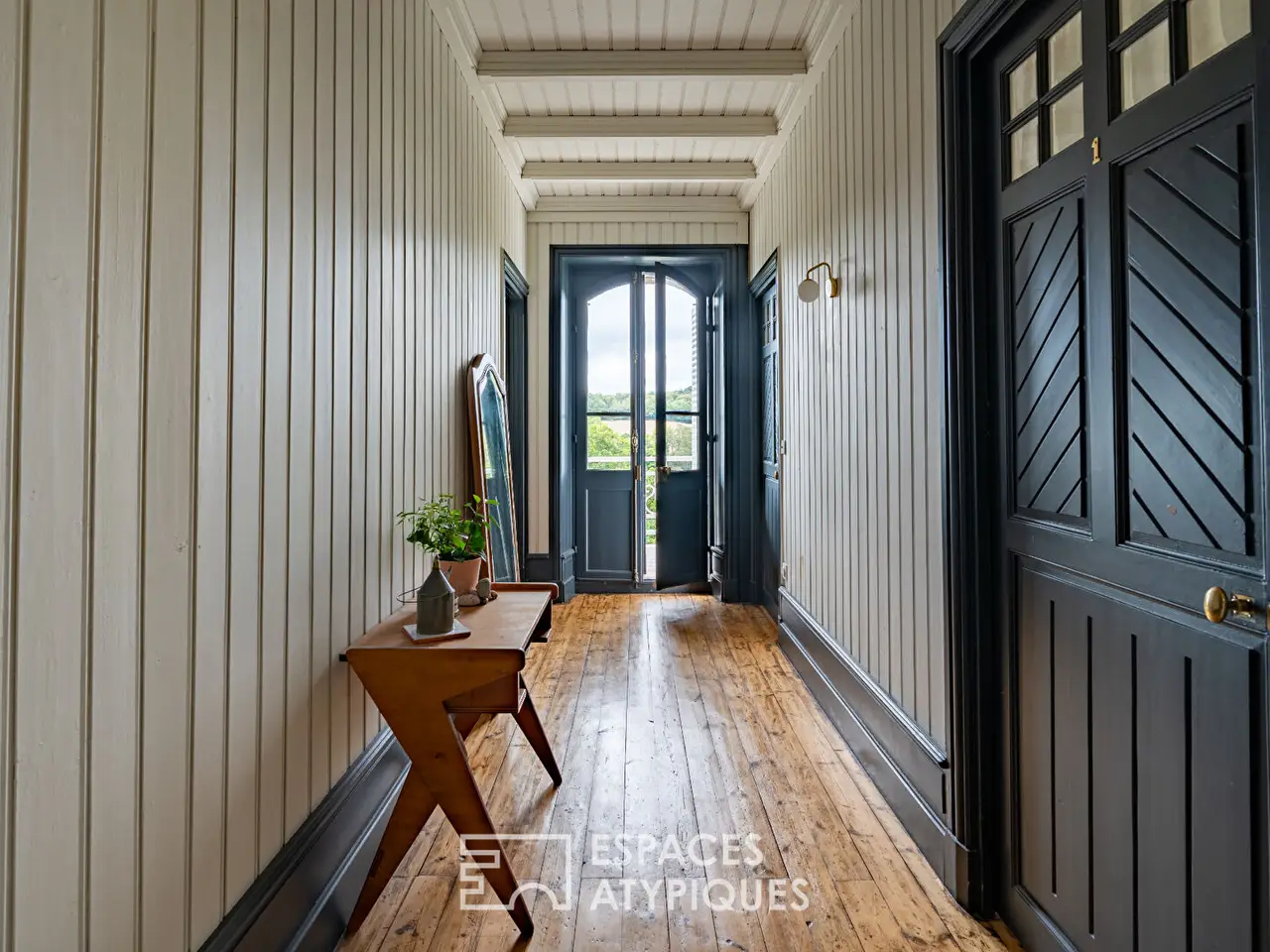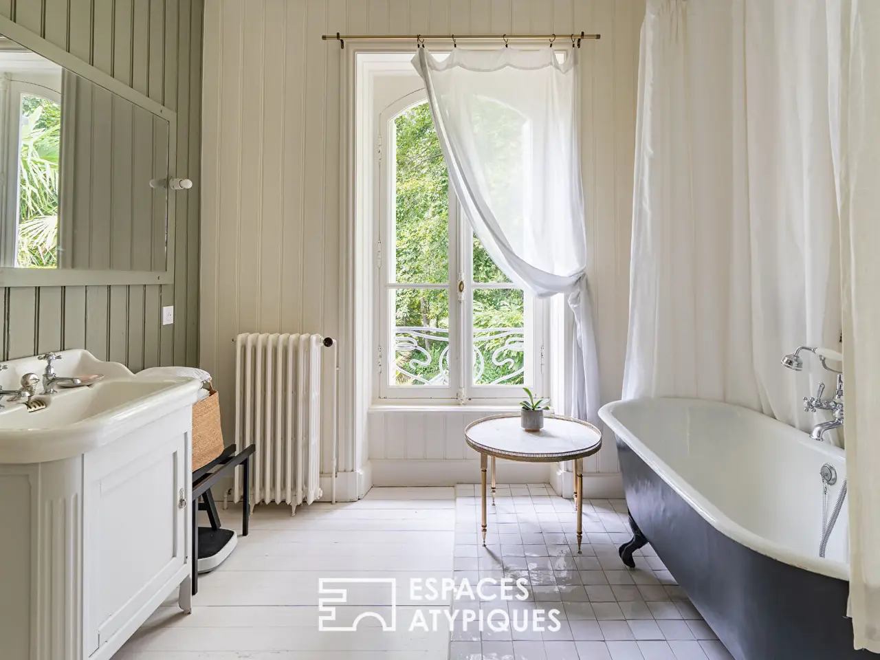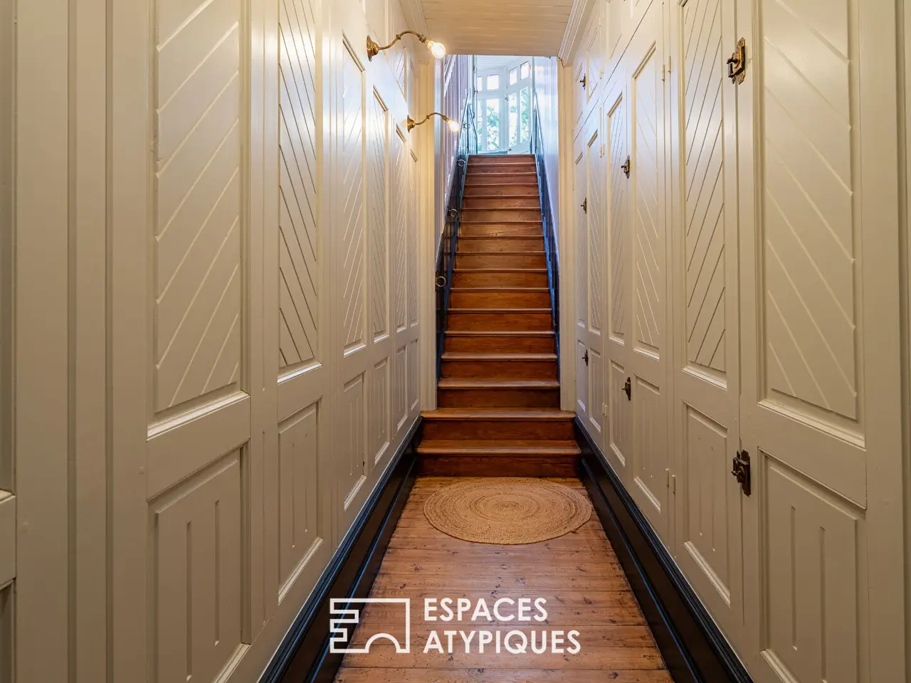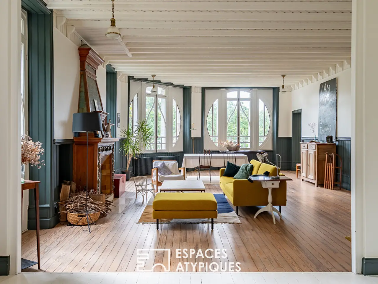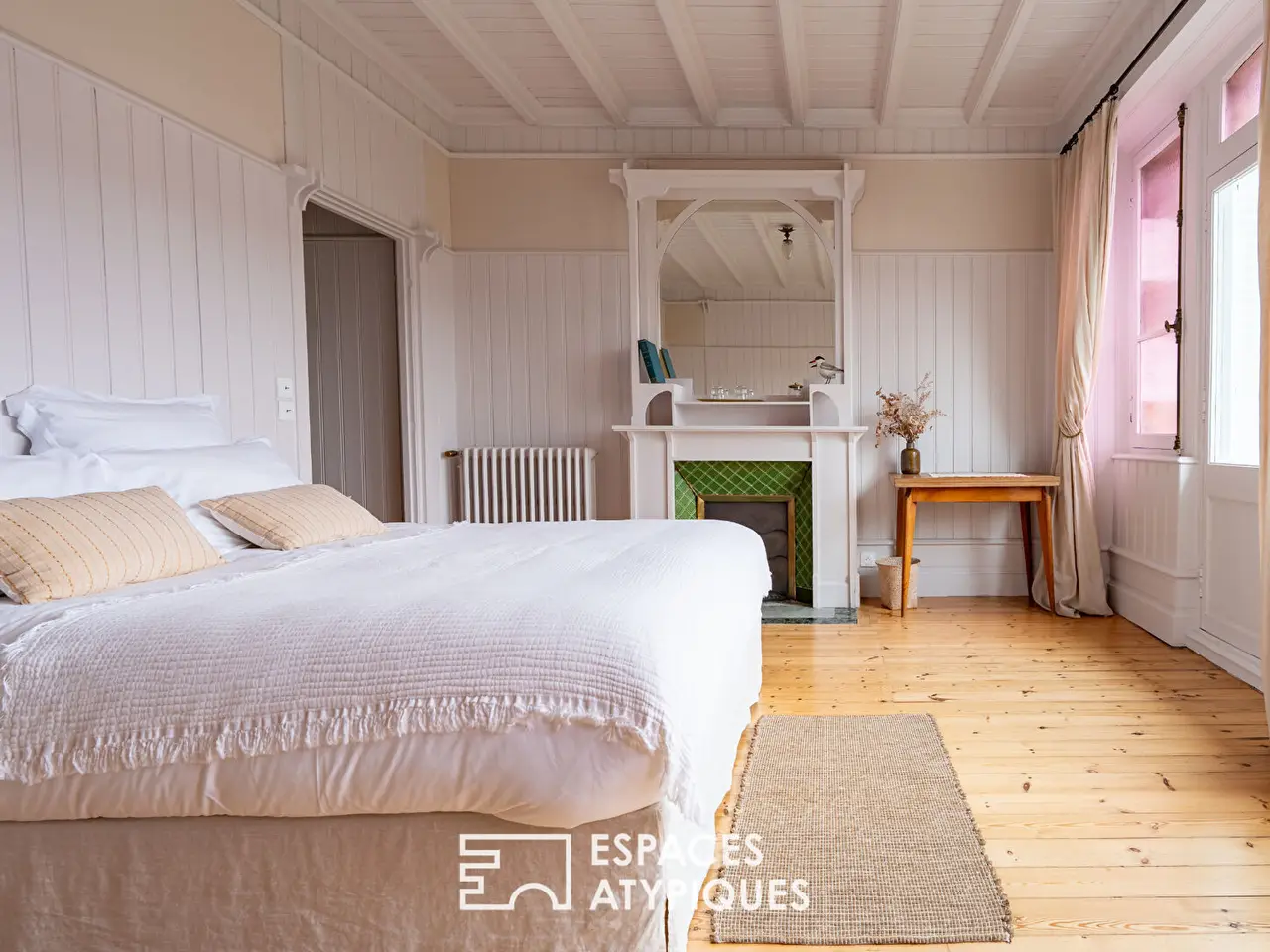 A rare residence, which must be explored and experienced to grasp all its beauty and unique soul. Nestled in the Bay of Morlaix, on the heights of the river, this unique residence embodies the creative effervescence of the early 20th century. Built in 1910 by the architect Charles Croissant, it deploys the flamboyant codes of Art Nouveau, the artistic movement that brought nature and curves into architecture. Its harmonious silhouette, punctuated by light stones, horseshoe-arched bays, and delicate ironwork, tells the story of an era where decorative refinement combined with technical innovation. A rare example of this style in Finistere, it was also the home of the couturier Nina Ricci for thirty years, giving this exceptional place a timeless prestige. Overlooking the river, the property is set in the heart of a park of more than two hectares, a true natural setting. Rhythmic facades, covered galleries, and monumental staircases are revealed like the sculptural features of a belvedere. The terraced gardens, punctuated by paths and groves, create a setting that changes with the seasons. Here, architecture and landscape are in constant dialogue, enhanced by the shifting light of the Bay of Morlaix. Entirely renovated according to the rules of the art, the residence today combines heritage authenticity and modern comfort. The hall, magnified by its high French ceilings, illustrates this subtle alliance between architectural rigor and the softness of a respectful restoration. The main entrance is reached by a stone staircase that runs along the terrace. From the moment you cross the threshold, the tone is set: generous volumes, abundant light, and decorative details typical of Art Nouveau. The vestibule introduces a refined universe where each element seems designed as a work of art. To the right of the vestibule, the bar-smoking room retains the cozy atmosphere of receptions of yesteryear, conducive to exchanges and special moments. Behind its walls clad in deep tones, the space combines elegance and intimacy. Its copper counter, woodwork, coffered ceiling, and play of light create a warm, refined and friendly atmosphere. A truly confidential setting, it embodies the art of hosting in a unique atmosphere. Continuing on, a majestic room unfolds, the true heart of the house. Its ceiling height of over 6.30 meters is immediately impressive and gives the space an almost theatrical dimension. The tall arched windows sculpt the light, flooding the space with a soft, changing brightness, while the finely crafted door frames emphasize its verticality. The staircase banister with sculptural arabesques, a masterpiece of decorative art, seems to animate the room with a fluid and aerial movement. This exceptional room opens onto the backyard, naturally extending the interior volumes to the outdoors. A more intimate living room, doubled as a library, then extends the discovery. The large Art Nouveau windows, with their organic shapes, create veritable tableaux of greenery and diffuse a generous light. The patinated parquet flooring and dark woodwork reinforce the elegance of the place. Its centerpiece is the monumental ceramic fireplace, nicknamed Scarabees, a masterpiece by Gentil and Bourdet and presented at the Salon des Artistes francais in 1904. A true decorative manifesto, it alone embodies the prestige of the era and the singularity of the residence. On this level, the kitchen and its scullery combine functionality and conviviality. They benefit from direct access to the terrace, thus extending the moments of life to the outdoors. A separate linen room completes the ensemble, adding a touch of practicality without altering the harmony of the volumes. The upper floors feature five bedrooms, all designed as suites with their own private shower room or bathroom. Four of them are distinguished by their refinement and comfort: some have a bathtub, others a contemporary shower, all offering generous volumes and an elegant atmosphere, some