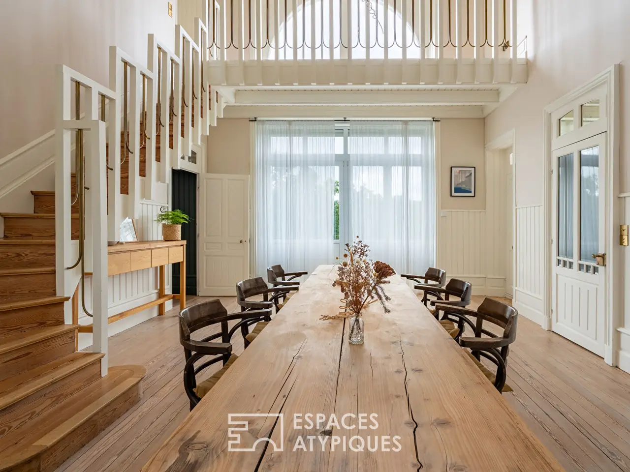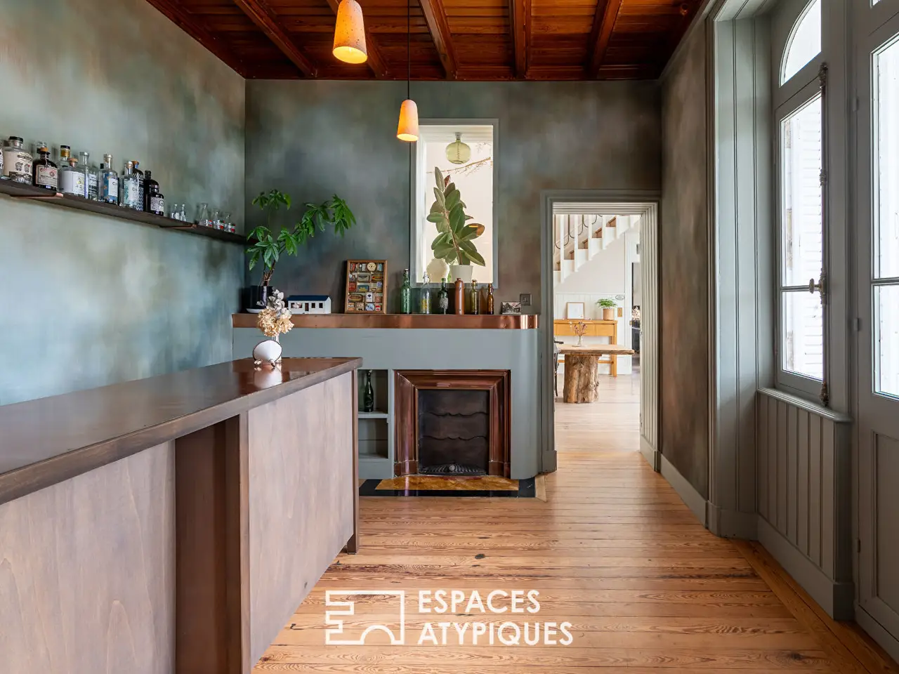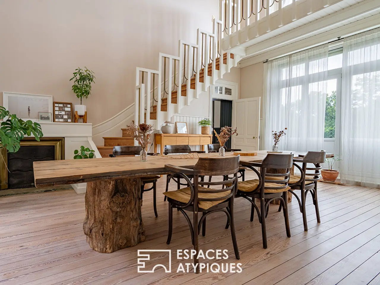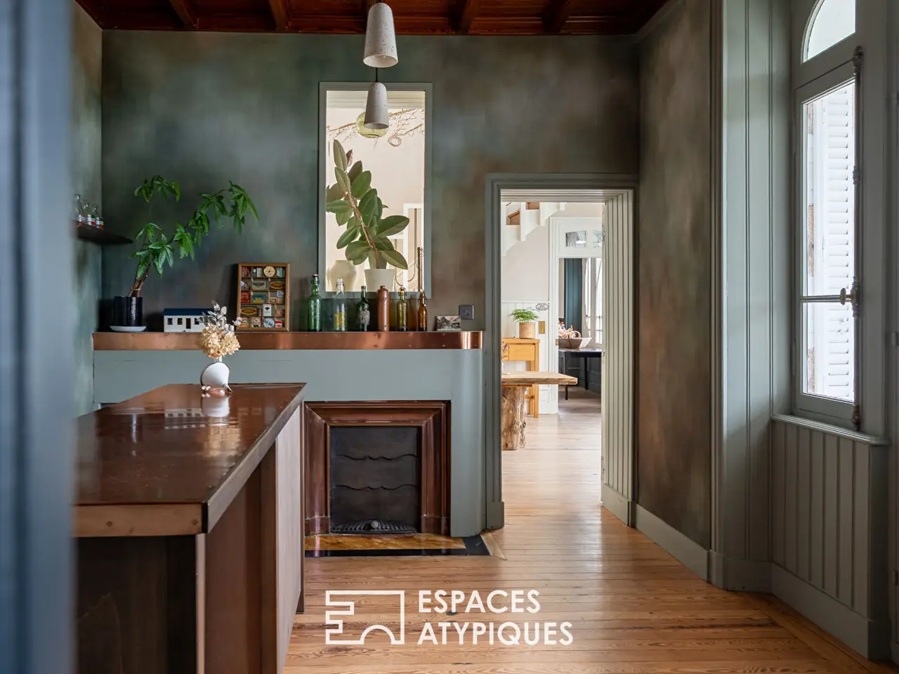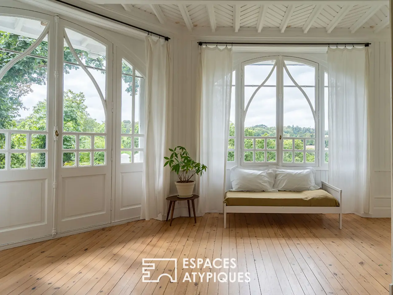 A rare residence, which must be explored and experienced to grasp all its beauty and unique soul. Nestled in the Bay of Morlaix, on the heights of the river, this unique residence embodies the creative effervescence of the early 20th century. Built in 1910 by the architect Charles Croissant, it deploys the flamboyant codes of Art Nouveau, the artistic movement that brought nature and curves into architecture. Its harmonious silhouette, punctuated by light stones, horseshoe-arched bays, and delicate ironwork, tells the story of an era where decorative refinement combined with technical innovation. A rare example of this style in Finistere, it was also the home of the couturier Nina Ricci for thirty years, giving this exceptional place a timeless prestige. Overlooking the river, the property is set in the heart of a park of more than two hectares, a true natural setting. Rhythmic facades, covered galleries, and monumental staircases are revealed like the sculptural features of a belvedere. The terraced gardens, punctuated by paths and groves, create a setting that changes with the seasons. Here, architecture and landscape are in constant dialogue, enhanced by the shifting light of the Bay of Morlaix. Entirely renovated according to the rules of the art, the residence today combines heritage authenticity and modern comfort. The hall, magnified by its high French ceilings, illustrates this subtle alliance between architectural rigor and the softness of a respectful restoration. The main entrance is reached by a stone staircase that runs along the terrace. From the moment you cross the threshold, the tone is set: generous volumes, abundant light, and decorative details typical of Art Nouveau. The vestibule introduces a refined universe where each element seems designed as a work of art. To the right of the vestibule, the bar-smoking room retains the cozy atmosphere of receptions of yesteryear, conducive to exchanges and special moments. Behind its walls clad in deep tones, the space combines elegance and intimacy. Its copper counter, woodwork, coffered ceiling, and play of light create a warm, refined and friendly atmosphere. A truly confidential setting, it embodies the art of hosting in a unique atmosphere. Continuing on, a majestic room unfolds, the true heart of the house. Its ceiling height of over 6.30 meters is immediately impressive and gives the space an almost theatrical dimension. The tall arched windows sculpt the light, flooding the space with a soft, changing brightness, while the finely crafted door frames emphasize its verticality. The staircase banister with sculptural arabesques, a masterpiece of decorative art, seems to animate the room with a fluid and aerial movement. This exceptional room opens onto the backyard, naturally extending the interior volumes to the outdoors. A more intimate living room, doubled as a library, then extends the discovery. The large Art Nouveau windows, with their organic shapes, create veritable tableaux of greenery and diffuse a generous light. The patinated parquet flooring and dark woodwork reinforce the elegance of the place. Its centerpiece is the monumental ceramic fireplace, nicknamed Scarabees, a masterpiece by Gentil and Bourdet and presented at the Salon des Artistes francais in 1904. A true decorative manifesto, it alone embodies the prestige of the era and the singularity of the residence. On this level, the kitchen and its scullery combine functionality and conviviality. They benefit from direct access to the terrace, thus extending the moments of life to the outdoors. A separate linen room completes the ensemble, adding a touch of practicality without altering the harmony of the volumes. The upper floors feature five bedrooms, all designed as suites with their own private shower room or bathroom. Four of them are distinguished by their refinement and comfort: some have a bathtub, others a contemporary shower, all offering generous volumes and an elegant atmosphere, some