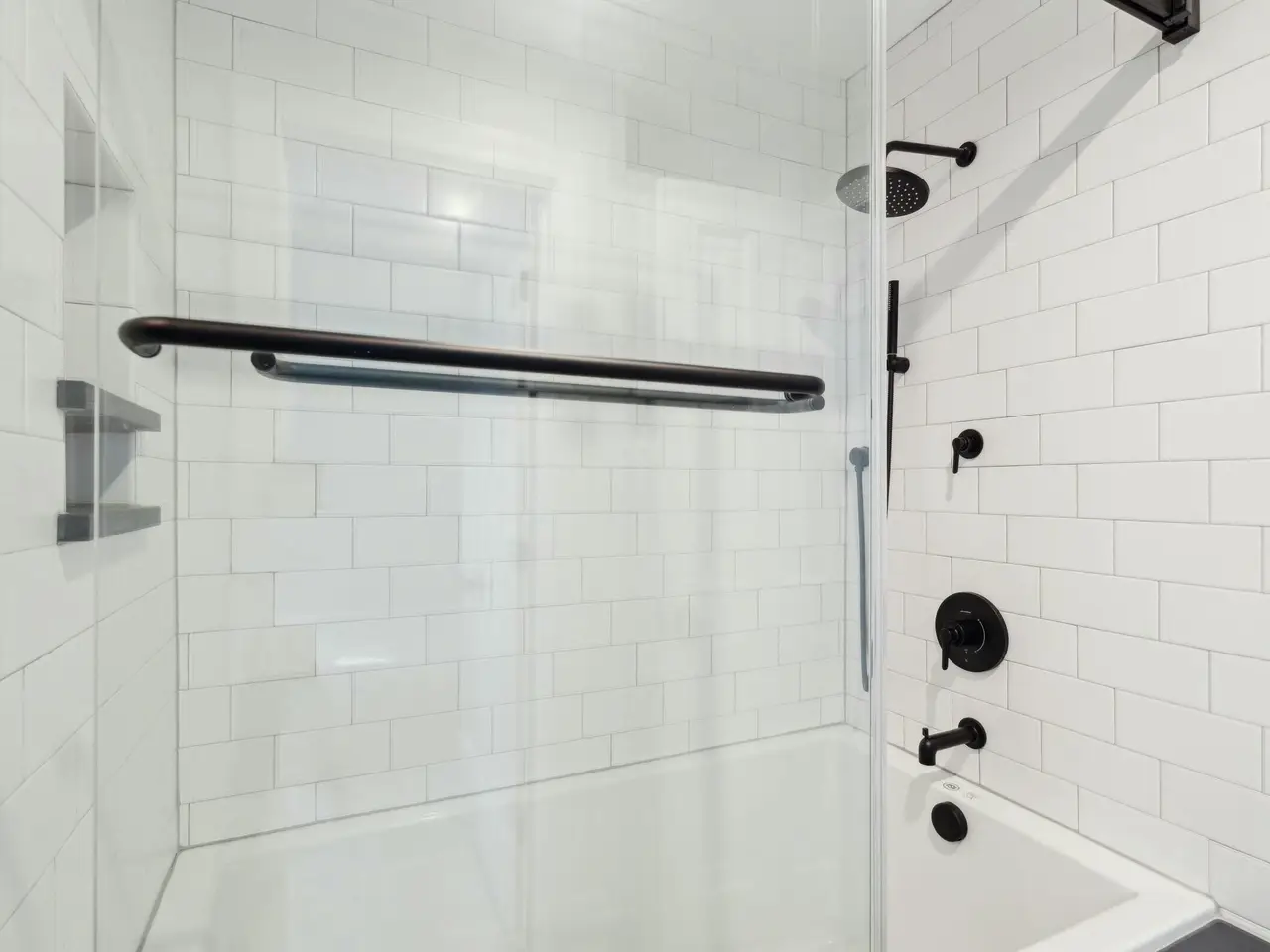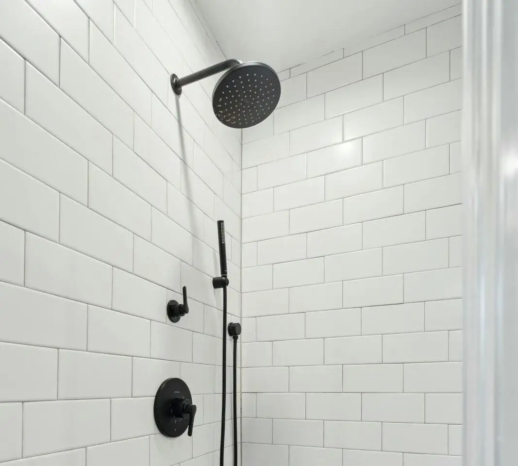 Custom Sapele wood fireplace mantel with ceramic tile surround