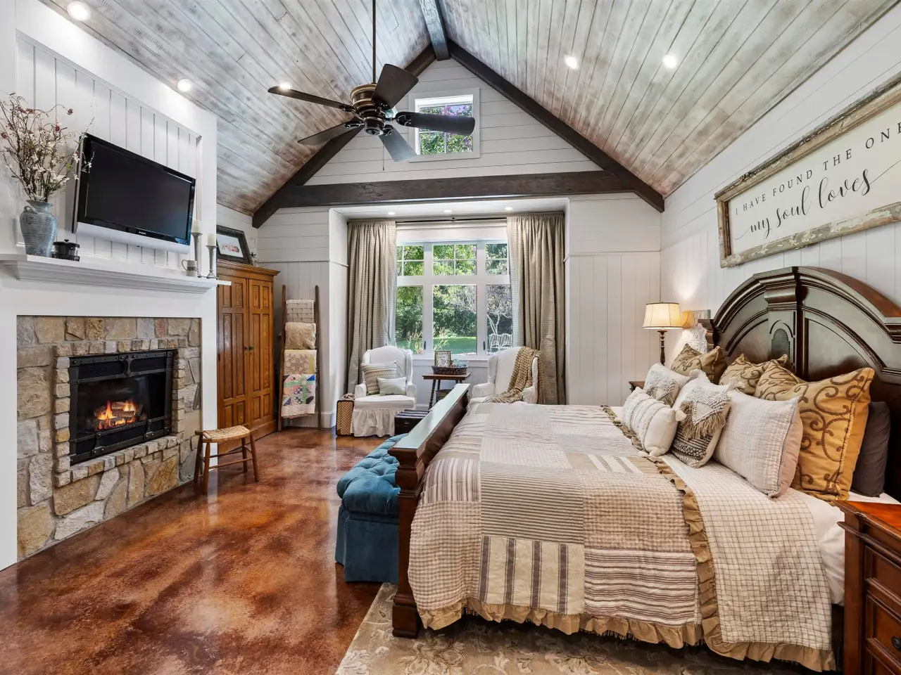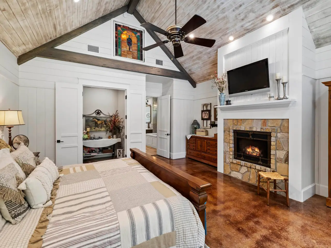 Primary suite with stone fireplace and luxurious ensuite bath