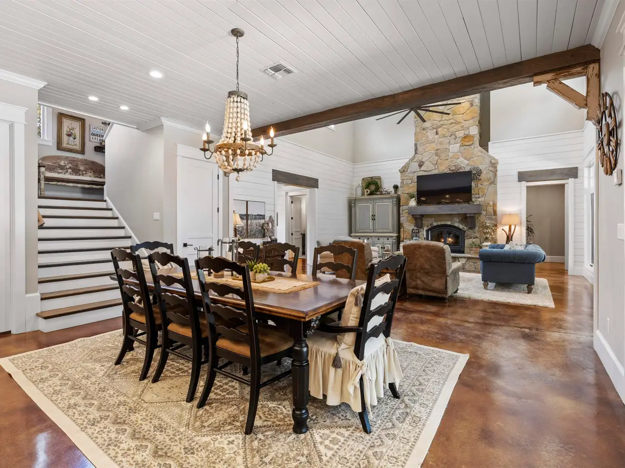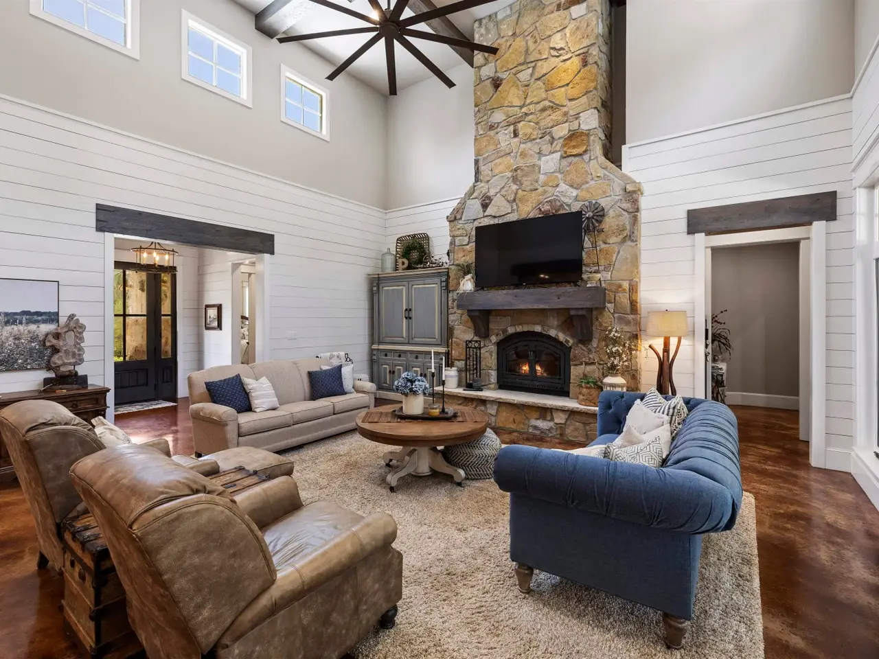 Vaulted ceilings with floor-to-ceiling stone fireplace