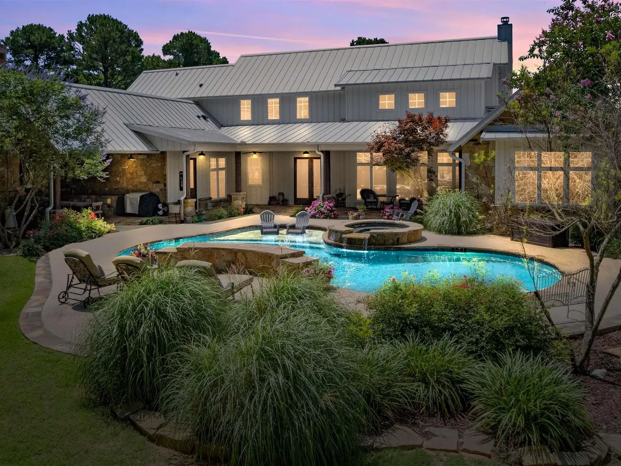 Located midway between Dallas & Texarkana and within minutes of beautiful Lake Cypress Springs and Lake Bob Sandlin, this thoughtfully designed, custom built home is set on 41 mostly wooded acres--tailor made for recreation, hunting or grazing a small herd. A winding drive brings you to the charming façade of this ultimate modern farmhouse. Step inside to a soaring great room crowned by a vaulted ceiling and anchored by a floor to ceiling stone fireplace with a wall of windows overlooking the resort-style pool. The heart of the home is a chef's kitchen outfitted with two sinks, a massive prep island, built-in professional appliances and a walk-in pantry that keeps everything organized for large-scale entertaining. Just beyond the main living area, an expansive covered patio and complete outdoor kitchen extends your living/entertaining space. Indoors, two separate living areas allow everyone to spread out. The game room, with a kitchenette and a half bath, makes movie night and game day effortless and provides easy access to and from the pool. The spacious primary suite is located on the main level and features a sitting area, vaulted ceiling and stone fireplace. The ensuite bath boasts separate vanities, a walk-in shower, soaking tub, water closet and a large walk-in closet, all accented with beautiful tile and fixtures. The lower level is complete with 2 additional guest bedrooms and 2 full bath rooms, a large utility room, mudroom and office. A second suite located on the upper level could easily be converted to a bunk room, perfect for weekend guests or multigenerational living. The three-car garage includes extra room for storage as well as a built in safe room. This property also features a 40 x 60 foot metal building with 4 overhead doors, a full bath and RV electrical and direct sewer hook ups. This property truly has something for everyone!! Call today to schedule your private showing of this amazing home.