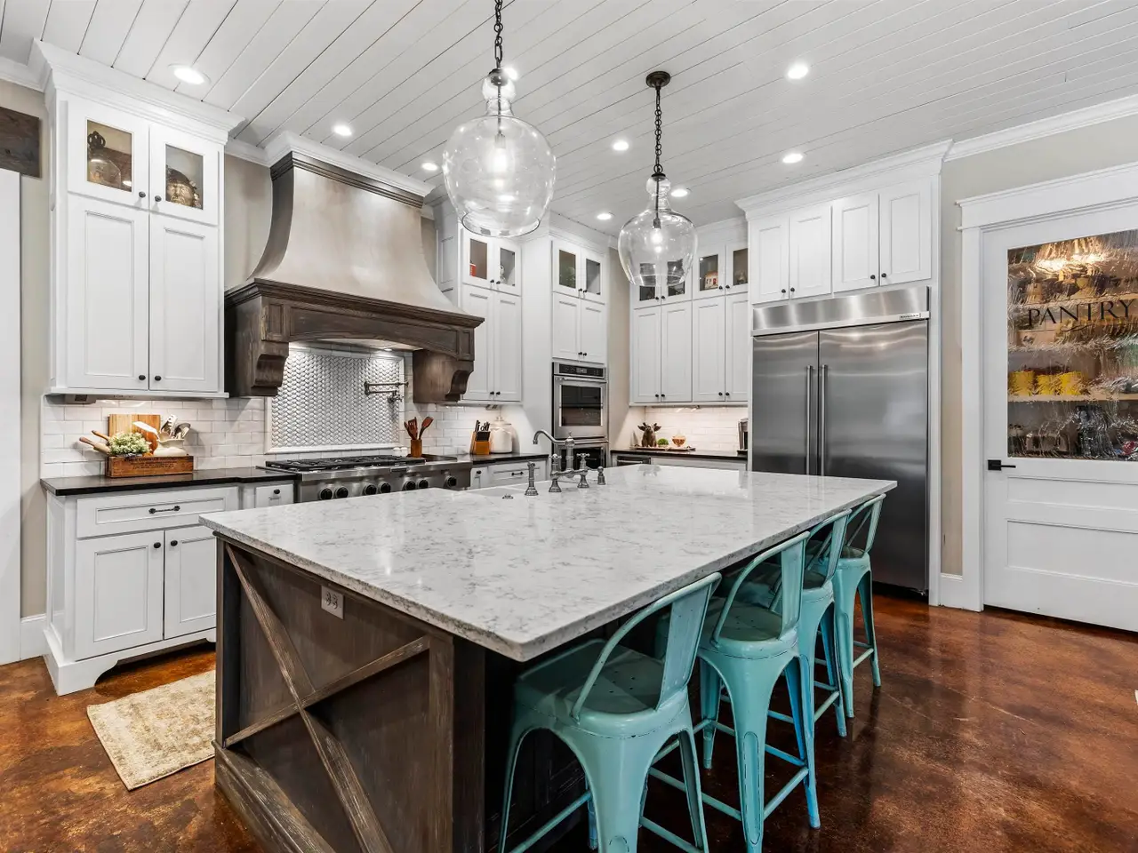Chef's kitchen with professional appliances and walk-in pantry
