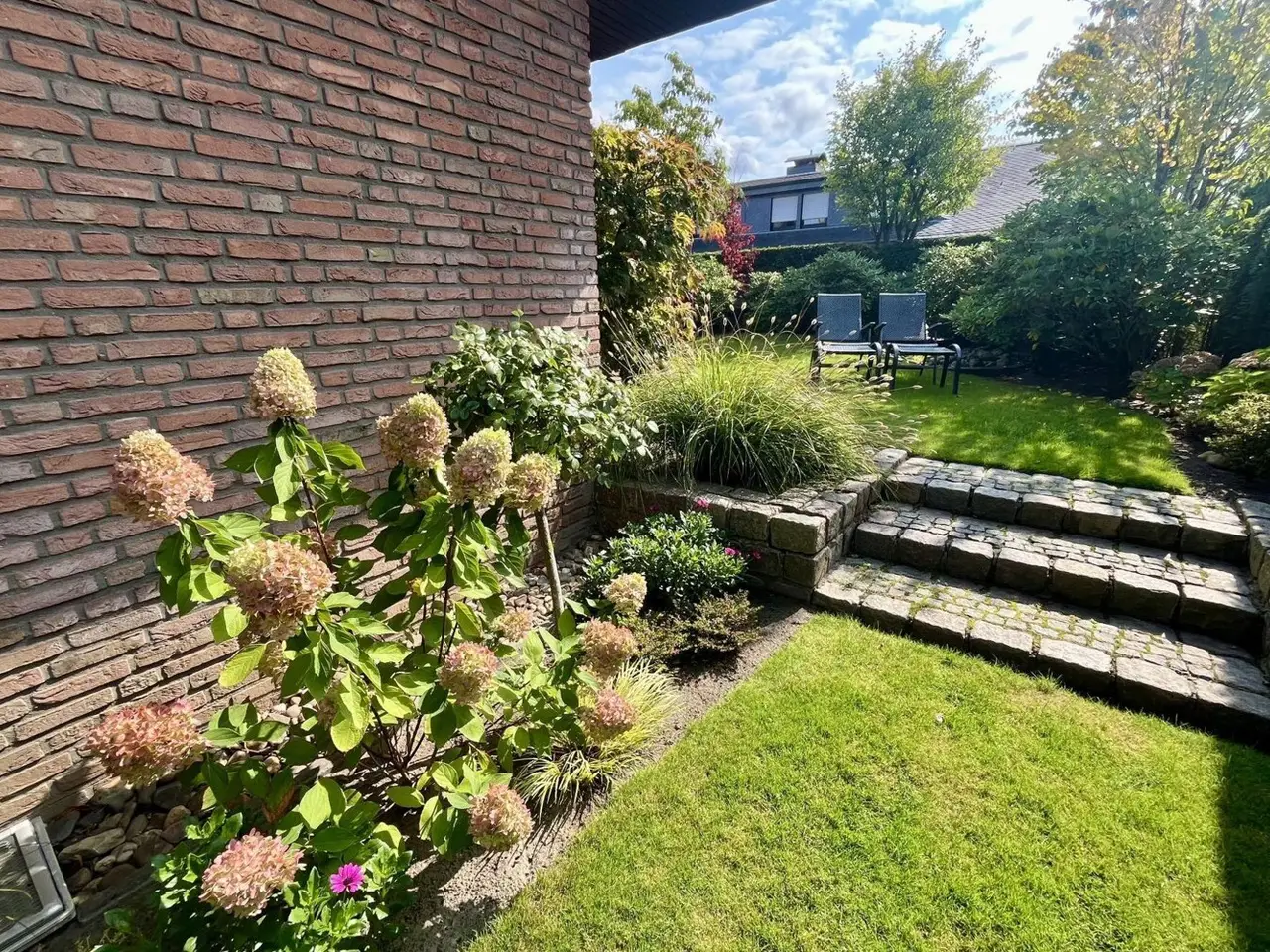 Here, your dream of owning your own property on a large plot in a mature residential environment can soon come true. This beautiful detached house in a reddish clinker brick look with a pitched roof is characterized by a functional floor plan and a selection of high-quality materials. The impressive aluminum entrance door will delight lovers of quality. The entrance hall features a hallway area with checkroom and guest WC, designed with high-quality, light-colored tiles. Timeless "Indian White" granite has been laid throughout the first floor, including in the attractive and neat L-shaped kitchen with "Star Galaxy" granite worktop and kitchen appliances from renowned manufacturers. The dining area for a small breakfast has also found its place here. A storage room and a pantry are the perfect complement to the kitchen. There is plenty of space for seating and cupboards in the open-plan dining and living area. The wood and aluminum windows with double glazing, some of which are floor-to-ceiling, give this area a great atmosphere. Underfloor heating has also been installed on the first floor. The roller shutters can be operated electrically. The patio door provides access to the front terrace with its stylish tiled flooring. Here you can spend relaxing hours with your family, surrounded by a well-tended lawn, taller shrubs and bushes as well as low perennials. In addition to rhododendrons, hydrangeas, cherry laurel and buxus, a cinnamon maple has also found its place in the garden. A beautiful water feature underlines the feel-good atmosphere. There is already an outdoor wood store for the fireplace so that the next winter can come. An open and short spiral staircase with solid oak treads leads from the entrance to the charming top floor with three possible bedrooms. The exclusive bathroom with shower, two washbasins, WC and built-in cupboard, designed with white tiles, dark floor tiles and high-quality white sanitary ceramics, has been very tastefully created and takes the functional aspect into account with the floor-to-ceiling shower. The very bright basement rooms can be accessed via an external staircase as well as an internal staircase. A utility room, a technical room, an oil storage room and a pantry are used for general and technical equipment. Two further rooms, which receive a great deal of light due to an embankment on the plot, meet the highest demands. A further cellar room is available as a utility room with a water connection. An additional cellar room could be optimally used as a hobby or work room. If this description has aroused your interest, please do not hesitate to contact us by phone or email so that we can present this beautiful property to you. We look forward to seeing you!
