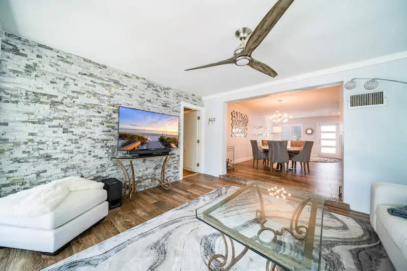 Gorgeous curb appeal!! This absolutely charming 3-bedroom, 2-bath ranch-style home in the desirable Lake Park neighborhood boasts stunning curb appeal with a freshly painted white exterior, bold black trim, main roof is asphalt shingles, metal lanai roof, and tasteful wood detailing accents. The inviting front porch, new light fixtures, and paver driveway with governors circle driveway for extra cars enhance the welcoming aesthetic. The beautifully landscaped yard is framed by newer white PVC privacy fencing and a gated rear yard. Decorative metal rain gutter downspouts add a touch of sophistication, creating a Santa Barbara-inspired exterior that feels crisp and contemporary. Inside, the open-concept layout is modernized with seamless "wood-look" tile plank flooring throughout, the kitchen features lighter creamy cabinetry, a tiled backsplash, breakfast bar, and high-end appliances including a WOLF electric cooktop and oven, BOSCH dishwasher, and French door refrigerator/freezer. The owner's suite offers an en-suite bath and dual closets, while the guest suite opens to a paver patio overlooking the private backyard. The renovated guest bathroom includes white tiled shower walls accented with mosaic bands, a floating double-sink vanity, and extra storage. A glass-enclosed family room with tile plank floors, a stone accent wall, and a ceiling fan provides additional living space, while the screen-enclosed porch with epoxy flooring and string lights is perfect for relaxing or entertaining. The oversized 1.5 garage features built-in storage rack and the enclosed laundry room is equipped with Samsung front-loading washer and dryer. With its lushly landscaped and private backyard, proximity to top-rated schools, trendy restaurants, and Naples' sunny beaches, this home offers a perfect blend of classic charm and modern living in a highly sought-after walking community.
