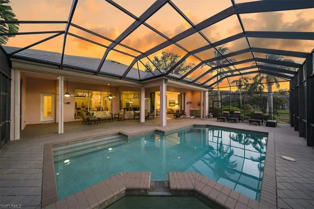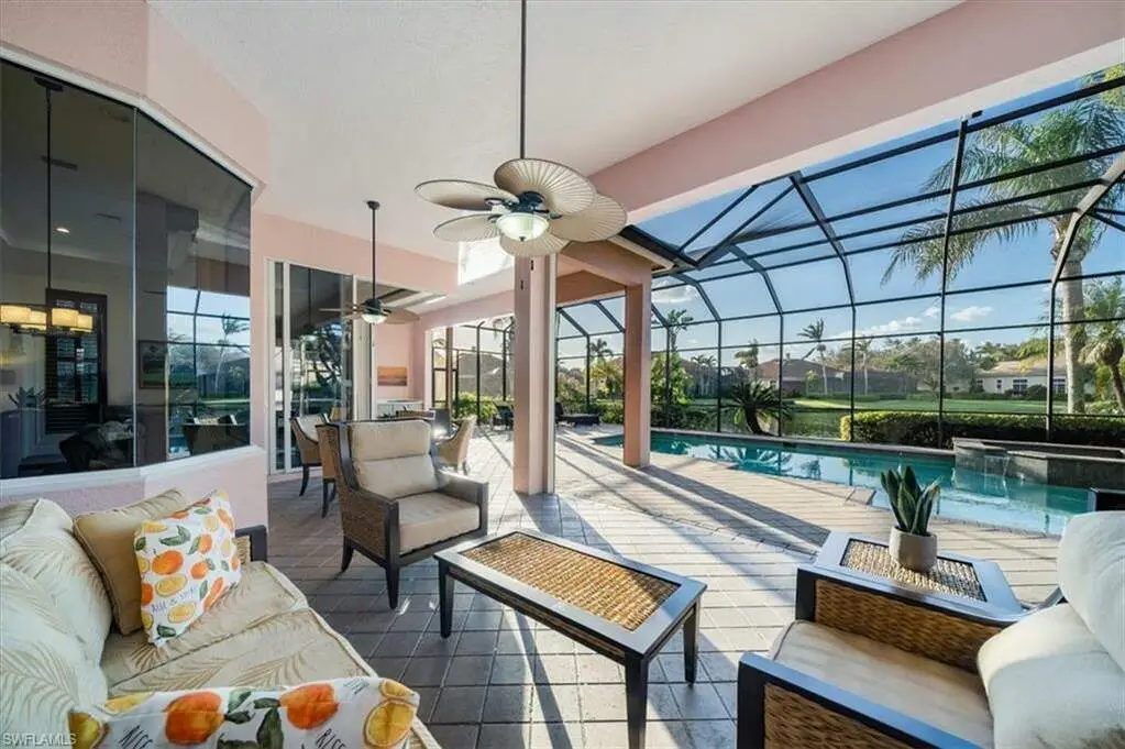 Nestled behind the gates of the prestigious Vineyards Country Club, this custom-built residence is a rare gem that showcases exceptional craftsmanship, thoughtful design, and a host of luxury upgrades that set it apart. December 2023 NEW ROOF!! Nestled behind the gates of the prestigious Vineyards Country Club, this custom-built residence is a rare gem that showcases exceptional craftsmanship, thoughtful design, and a host of luxury upgrades that set it apart. Designed by a discerning builder for personal use, the home offers numerous high-end extras not commonly found, including soaring ceilings that create a grand sense of space and scale, extensive custom millwork, and refined architectural details throughout. From the moment you arrive, the curb appeal is striking-with a stately governor's paver driveway, side-entry 3-car garage, and lush, mature landscaping enhanced by fresh mulch, all situated on a quiet, oversized cul-de-sac lot offering unmatched privacy and picturesque lake views. Inside, the elegant marble-floored foyer opens to a gracious living room with coffered ceilings and seamless flow to the expansive screened lanai, ideal for indoor-outdoor living. The home's layout is both functional and inviting, with formal and casual dining areas, an updated white kitchen with solid-surface countertops, a breakfast bar, and a glass-enclosed breakfast room bathed in natural light. The oversized family room and outdoor summer kitchen make entertaining effortless. Each guest suite is a private retreat, with luxury vinyl "wood look" flooring, custom double closets, and individual bath access that have been remodeled and updated. The owner's wing is a sanctuary, offering two walk-in closets, lanai access, and a spa-inspired bathroom with a walk-through shower and dual vanities. An additional flexible space serves as a fourth bedroom or office, and the third garage bay has been transformed into an air-conditioned bonus room, ideal as a game room, gym, or "mancave." A prime location within one of Naples' most established and amenity-rich communities, this residence is the perfect blend of elegance, comfort, and thoughtful upgrades.