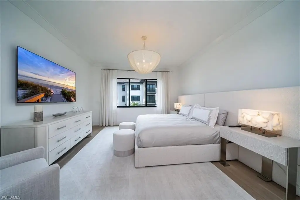 Welcome to residence 404 at Quattro, which showcases the elegant "Bianca" open floor plan, featuring 4 bedrooms, a den, and 4.5 baths. Rarely lived in, this residence is the largest available, offering 3,437 square feet of air-conditioned space, a 438-square-foot balcony, and soaring 10-foot ceilings. The expansive 36-foot balcony faces east, providing stunning views of the meticulously landscaped courtyard and resort-style pool. Furnished with custom high-end pieces and designer lighting curated by a New York interior designer, no detail has been overlooked. The home boasts rich wide-plank hardwood floors, impact-resistant doors and windows, and a chef's dream kitchen complete with a large quartz island, wet bar with wine cooler, and professional-grade Sub-Zero, Miele, and Wolf appliances, including natural gas cooking. Additional features include two deeded parking spaces in the gated garage, EV charging capabilities, and a climate-controlled storage unit. Quattro's amenities are second to none, with a heated pool and spa, fire pit, outdoor pavilion with gas grills, a state-of-the-art fitness center, and a stylish clubroom equipped with a bar, terrace, large-screen TV, and billiards room. Located in the heart of Naples' Design District, Quattro offers unparalleled access to Fifth Avenue South, Third Street South, and the pristine sugar-sand beaches. The vibrant Bayfront area with its restaurants and shops is just across the street, and the upcoming Gulfshore Playhouse is within walking distance. A masterpiece of British West Indies and Coastal Contemporary architecture, designed by the renowned MHK Architecture & Planning, Quattro is the crown jewel of Naples Square.