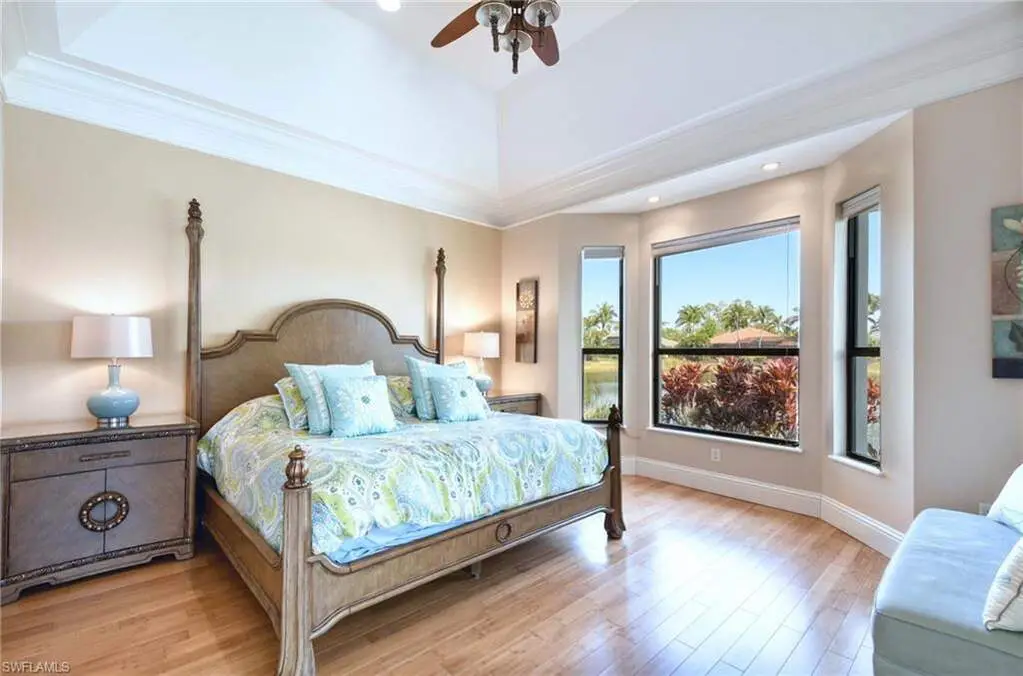 This exquisite estate in Da Vinci Estates at Olde Cypress boasts a new roof and gutters, a fabulous and rare FIVE CAR garage (set up as 3 and 2 on the courtyard), and ample space for family enjoyment. This home is a creation for making lasting family memories for multi-generations. Recently painted, the home features an impressive second floor with a movie theater, billiard room with bar, and half bath. The expansive primary bedroom includes sliders to the lanai, an oversized walk-in closet, and a sitting room, gym or second office space. With newly installed HVACs in 2025, stunning lake views and water feature from multiple rooms, and lightly lived-in, this property is perfect for both extended family gatherings and a serene primary residence for a family living in a vibrant community. The pool has a grotto spa with a cascading waterfall sure to delight the children. The cabana has resplendent views of the lake and an entrance to the lanai, full bath and mini bar. Guests will feel the expansiveness of the guest accommodations measuring 16'9" x 14'7" and 15'4"" x 14'0". The Cabana bedroom measures 15'1" x 15'3". The Den could be used as a fifth bedroom (13'2" x 27'7") with an ample closet. The Primary bedroom encompass the entire east wing of the home and measures 16'7" x 27' with a closet 14'2" x 10'7". The tub room is oversized and the shower room is a separate room. Two commode rooms in the primary bath suite. The oversized laundry room is 14'5 x 10'7". As the discerning buyer would expect, the home has extensive millwork and solid wood doors throughout. For those appreciating privacy, this home enjoys 140 feet of frontage at the street. DaVinci Estates has an additional gated entrance. The Club is a well respected PB Dye course that many golfers that do not reside in the community join for its challenge. It has had consistent renovations with the fastest drying greens in the county. Social membership is required for residents, with no initiation fees. Tennis, pickleball, bocci and fitness center with club house dining is all included in the social membership. (no minimums!) ONLY 550 homes in this community and all are single family homes makes for a neighborhood feel that is very social and FUN. Check out The Club at Olde Cypress Facebook page to see all of the social events. NEW expansion plans UNDERWAY for the clubhouse, With NO Assessments. NO CDD. Note where the guard gate is here. It is on the other side of the clubhouse. During reciprocal season, many golf communities have guests in and out of the residential streets--not the case here where only registered guests enter the residential streets of Olde Cypress. Logan's Landing and Founder's Square are close, Mercato is is a short drive. Peace of mind in living east of the gulf, but close enough to enjoy all that it offers, giving you the best of both worlds. Be sure to watch the DRONE VIDEO link of the interior and outside.