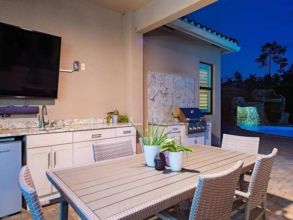 - Outdoor kitchen with Weatherstrong cabinetry and granite counters