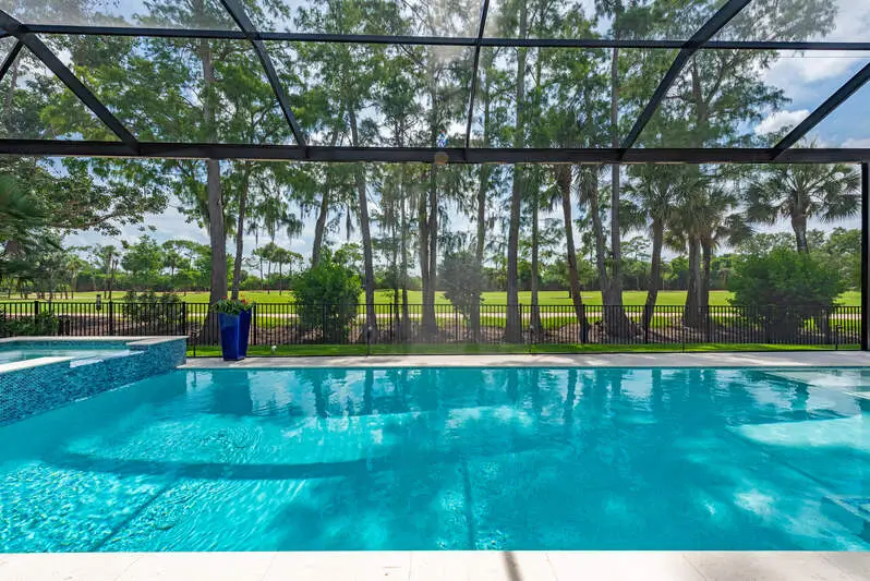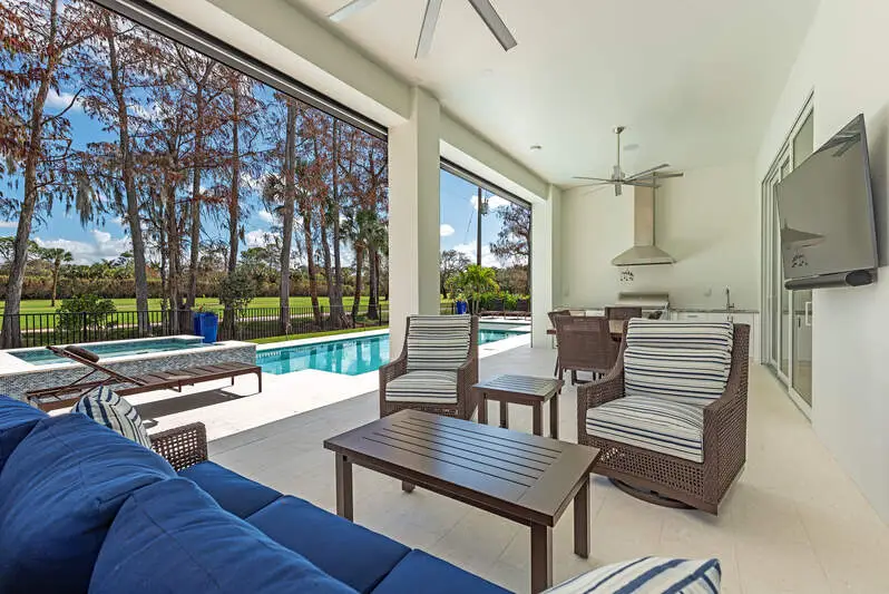 This hidden gem is centered in the heart of Naples within the coveted community of Big Cypress. It's rare to find newer construction just one mile from The Waterside Shops. Impressive ceiling heights and panoramic golf course views welcome you into this recently completed luxury home crafted by Borelli Construction. Inside you'll find the high-end finishes you expect from Borelli including custom closets, extensive trim work, detailed ceilings, as well as beautiful French white oak wood flooring and Anderson impact windows. Exquisite style abounds in this professionally decorated home that has been meticulously designed, painted and enhanced with custom window treatments and tasteful feature walls. The great-room floor plan showcases a living and dining area with beautifully coffered ceilings and luxurious window panels that frame the views onto the expansive lanai. The adjacent and well-designed kitchen is centered around a large island of natural stone. Shaker-style solid wood cabinetry and a separate pantry provide plenty of storage. Premium appliances include SubZero and Wolf, and a dual-zone wine cooler. The master suite features a spacious bedroom with sliding doors to the peaceful outdoor space. Closets are ample and the spa-like bathroom serene. The two guest bedrooms are generously sized with walk in closets and en-suite bathrooms. An additional office space, or bedroom, is located at the front of the home. The lanai is equipped with a full outdoor kitchen and plenty of room for entertaining. The heated salt-water pool and spa with sun-shelf complete the Florida lifestyle. A high-end pool enclosure with picture frame was just installed, framing the unobstructed golf course views. Custom exterior lighting, landscape improvements, a Sonos sound system, improved audio-visual equipment and garage enhancements that include built-in cabinetry, additional refrigerator and specialized flooring round out this stunning home. The community is perfectly situated in the heart of Naples with quick access to all the best in Naples beaches, shopping and dining. Social Awaiting Golf membership is available and allows for access to social activities and limited golf.