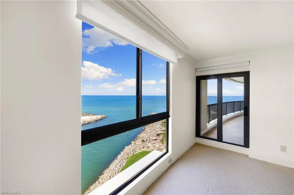 How's that lead off picture for a spot to have your morning coffee or tea to start your day?! VIEWS! Rare, sweeping, direct and full southern coastline views from all living areas and master suite, massive direct unobstructed Gulf views, long City views up Gulfshore Boulevard, direct views of Doctor’s Pass plus views to Moorings Bay from guest bedrooms and den. This residence is a beach-to-bay design, so you have southern, western, eastern and northern views and exposures. SIZE! Nearly 3,000 square feet of air-conditioned living space (was originally a four bedroom and can very easily be that again). LOCATION! At the end of the cul-de-sac with gated entry situated on nearly 10 acres of lushly manicured grounds with two pools, one renovated clubhouse area, and in recent years newly constructed grand clubhouse with fantastic workout facilities, boat docks and kayak storage / launch (subject to availability) - magnificent. Impact glass throughout for all windows and sliders plus extra storm protection from shutters on lanai and balcony areas. This type of residence is for all these reasons and more, authentically so very special, cannot be reproduced along Gulf Shore Boulevard, and offers tremendous value especially compared to the new construction residence costs along Gulf Shore Boulevard. Gorgeous beachfront. So close to any and all the every day-to-day conveniences and amenities you may need or want. This type of incredible setting is simply stunning particularly in a building that is so architecturally distinct in all the best ways. Come take a look and have a visit (it’s even better in person) - you may find your Naples beachfront residence awaits!