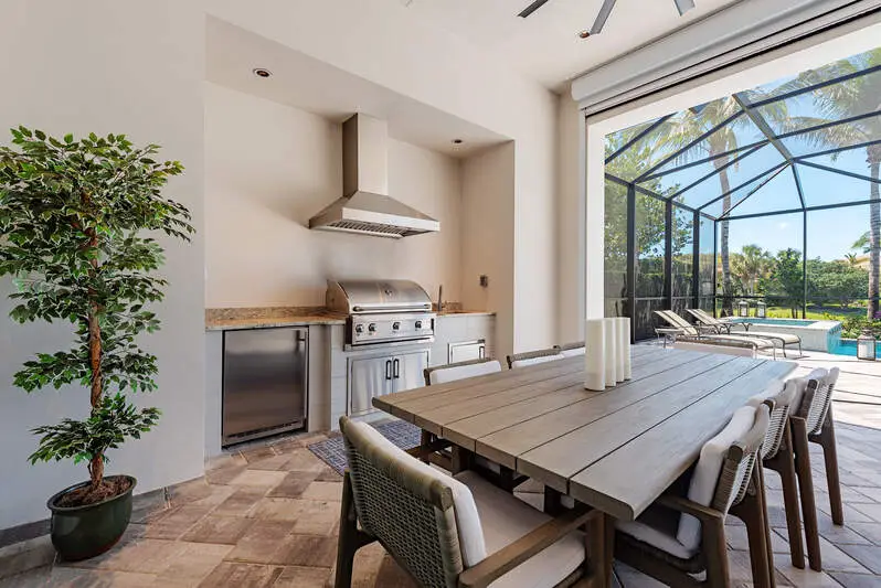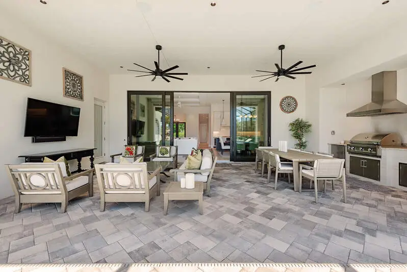 This spectacular resale, that is 5 years young, is a MUST SEE!!! Welcome to 16775 Cabreo Drive in Mediterra. This gorgeous London Bay built "Devonshire Model" with separate guest casita/guest house is one of a kind. Perfectly situated on this western exposure lot with a 3 car attached garage this home has gorgeous curb appeal. Come through the covered front porch, with double door entry, to this amazing open concept floor plan with soaring ceilings and walls of windows allowing all the Florida sunshine to stream in! Wood-look tiled plank flooring throughout the main living areas of the home, custom detailing, and crown molding are just some of the high end finishes you are sure to be looking for! The designer kitchen is perfect with white shaker cabinets on the perimeter and darker cabinets on the oversized island. The tiled backsplash, quartz countertops, high end stainless appliance package, recessed and pendant lighting, and plenty of counter space make this kitchen a Chef's dream. The dining area, adjacent to the kitchen and great room plus outdoor dining and seating make this home a fabulous place to entertain with plenty of seating for everyone. The oversized great room, with TV wall, custom millwork and accents, tray ceiling and large oversized sliders, opens to the lanai. A spacious owner's retreat provides the perfect place to rest peacefully. Two walk-in closets, a large walk-in shower, soaker tub and oversized dual vanities complete the en-suite space. The den is tucked away from the great room to allow for quiet privacy when needed. There are 2 additional guest suites in the main house both with double closets and en-suite baths. The split bedroom floor plan allows for privacy for you and your guests. A separate one bedroom/studio Casita /guest house with en-suite bath and private access can be used for guests or office space - you decide! Outside, under the covered lanai enjoy the western sunset views, a fully equipped outdoor kitchen with refrigerator, sink and built-in grill. A glistening pool and spa await you for relaxing in the Florida sunshine. Fully screened lanai cage and expanded decking provide the perfect spot to watch the sun set and relax after a day of sun-filled activities. Lake views from the lanai and great room and landscaped area at the front of the home, with no other homes across the street, provide the upmost of privacy. A whole home generator, Natural gas community, flat tiled roof, storm protection give you the best in storm protection. Mediterra's world-class amenities include: a Private Beach Club, Tennis, Pickleball, Wellness Center, and two Tom Fazio-designed golf courses! This home offers the perfect blend of luxury, style, and functionality. Mediterra is centrally located minutes from down town Naples and Bonita Springs with fine dining and shopping galore. RSW Airport is a 25 minute drive! Is this the home for you? We invite you to come see for yourself!!