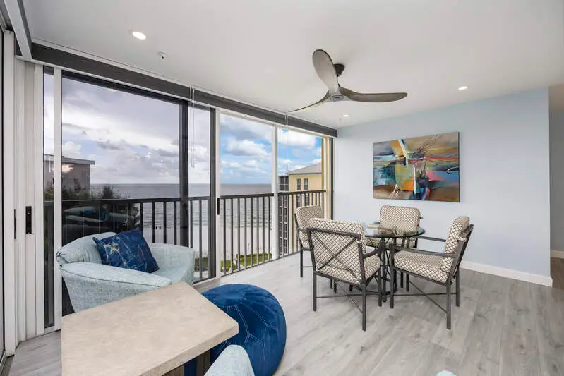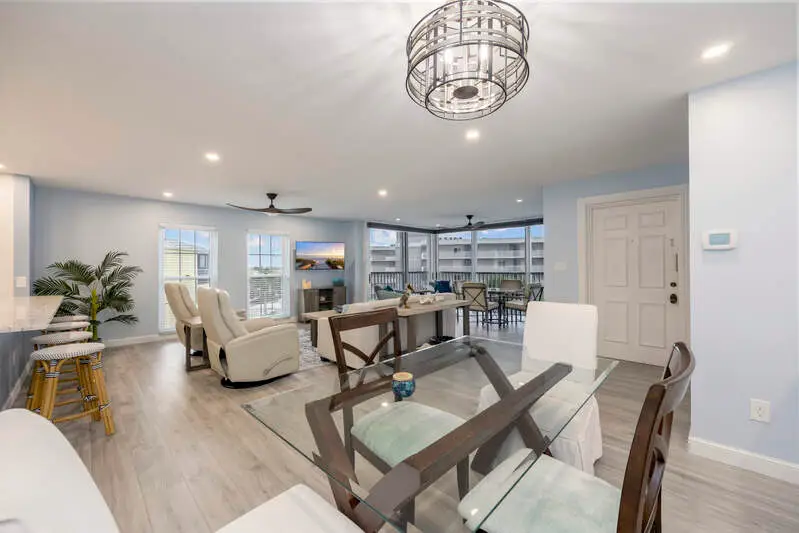 Sweeping Gulf Views in The Moorings! Perched on the top floor of St. Croix Club, this two-bedroom residence captures sunrise-to-sunset views with the soothing sounds of the Gulf just outside your windows. Inside, you'll find a beautifully re-designed open kitchen with quartz countertops, stainless steel appliances, breakfast bar & under-cabinet lighting. An expanded living area with a dry bar makes entertaining easy. The primary bedroom suite offers a cozy office alcove complete with a city view. An in-unit laundry, abundant storage & luxury vinyl flooring throughout are also part of this offering. With only two residences per floor, natural light pours in from three sides. St. Croix Club has completed exciting new amenities, including: a reimagined beachfront pool with extended deck, pergolas & social area, a new fitness center & redesigned social room. Additional conveniences include secured entry, under-building parking, and private storage. All of this is located just moments from the boutique shopping and fine dining of Venetian Village.
