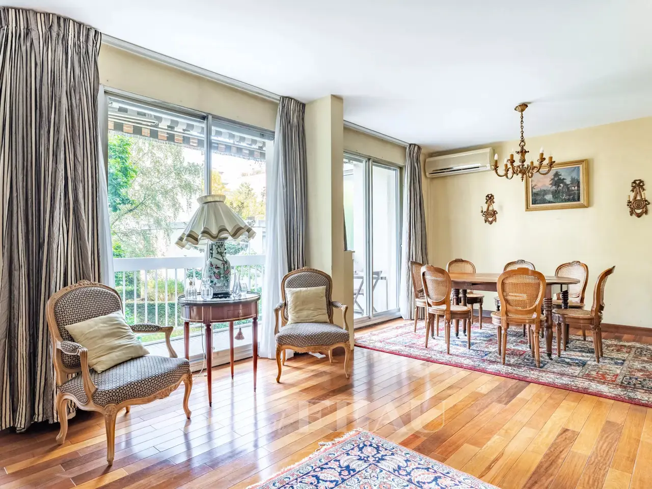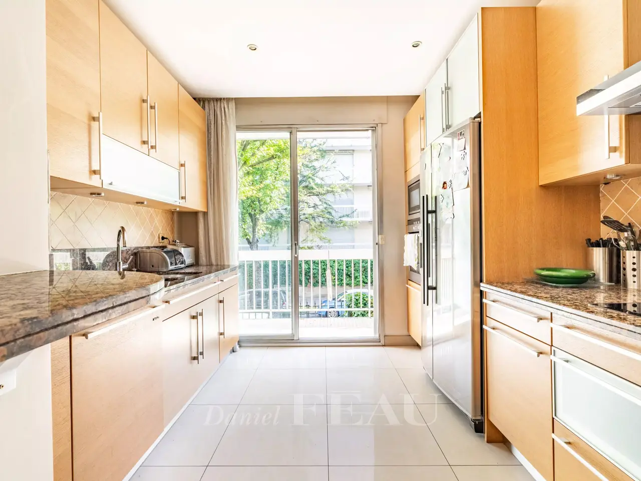 Saussaye neighbourhood. This bright and peaceful family apartment is in a luxurious residence in the immediate vicinity of the shops, the schools and the transport networks. It includes a spacious double living/reception room opening onto a wide balcony overlooking the residence’s leafy gardens, a kitchen with dining facilities, three suites each with a bathroom/wc or shower room/wc, and a guest wc. The bedrooms open onto a continuous balcony. A 4th would be possible. Air conditioning. With a parking space and a cellar. A second parking space may be acquired for a further 30000€. Pasteur catchment area. An ideal family apartment on the north-western edge of the capital.