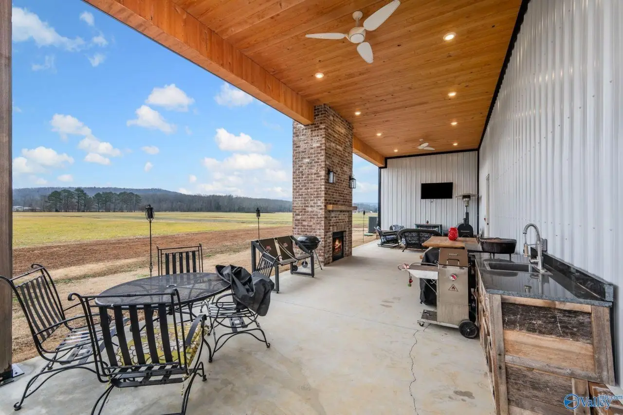This stunning custom-built barndominium offers the perfect blend of rustic charm and modern luxury. Featuring 4 bedrooms, 5 baths, and a versatile floor plan, this home boasts custom woodwork throughout, a spacious master suite with a large walk-in closet and bathroom, and an office. The open-concept living area centers around a double-sided fireplace and a large island, ideal for entertaining. The 2,500 sq. ft. 6-door shop includes a workshop with a garage door. Enjoy outdoor living with a cozy patio fireplace.
