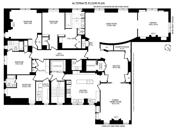 Apartment 12 at esteemed 1020 Fifth Avenue is a full floor home with approximately 3500 square feet comprised of nine rooms with stunning open views in four directions including Central Park, and the Metropolitan Museum. 1020 Fifth was completed in 1925 and was designed and built by Warren and Wetmore- most notable for their work as the co-architects of Grand Central Terminal and many noteworthy properties in New York and beyond. 1020 is one of a very few Fifth Avenue co-ops with one home per floor, to ensure that one has the feeling of living in a private home- with full service convenience and security. The 12th floor is notable for its antique English paneled library with wood burning fireplace overlooking the Park, oblong grand foyer, and gracefully curved living room- offering distinctive and unique architecture. Above all, the 12th floor has the distinction of four open exposures offering beautiful natural light at every time of day, and glorious views. A private elevator landing brings you to a salon sized entry foyer - to the north- a corner formal dining room with Park views and a wood burning fireplace, is graciously proportioned for formal dining. To the south, the 27 foot long living room offers Park and Museum views and is the ideal environment for entertaining with multiple seating areas. To the west, the handsome corner English wood paneled library with wood burning fireplace is a true sanctuary- showcasing picture postcard Park and Museum views. A discreet powder room completes the public rooms of this home. The bedroom wing to the south, east and north includes a 31 foot long double primary suite with wood burning fireplace, dressing room, and en-suite marble bathroom. Formerly two bedrooms now combined to create a grand suite- it may again become two bedrooms each with en-suite baths creating a four bedroom home. Two additional bedrooms have two private baths and wonderful natural light and city views. The spacious kitchen features lovely northern city views, vented stove, endless storage and pantry space, and will easily accommodate a dining banquette. Additional features of this sumptuous home include central air conditioning, restored herringbone flooring, impeccably maintained millwork and plasterwork, and a separate windowed laundry room. 1020 Fifth Avenue features 13 apartments over 14 floors, and provides the service of 24 doormen, resident manager, and porters, to provide gracious service to its shareholders. Please note that a 2% flip tax is payable by the purchaser and financing is not permitted and pets are welcome.