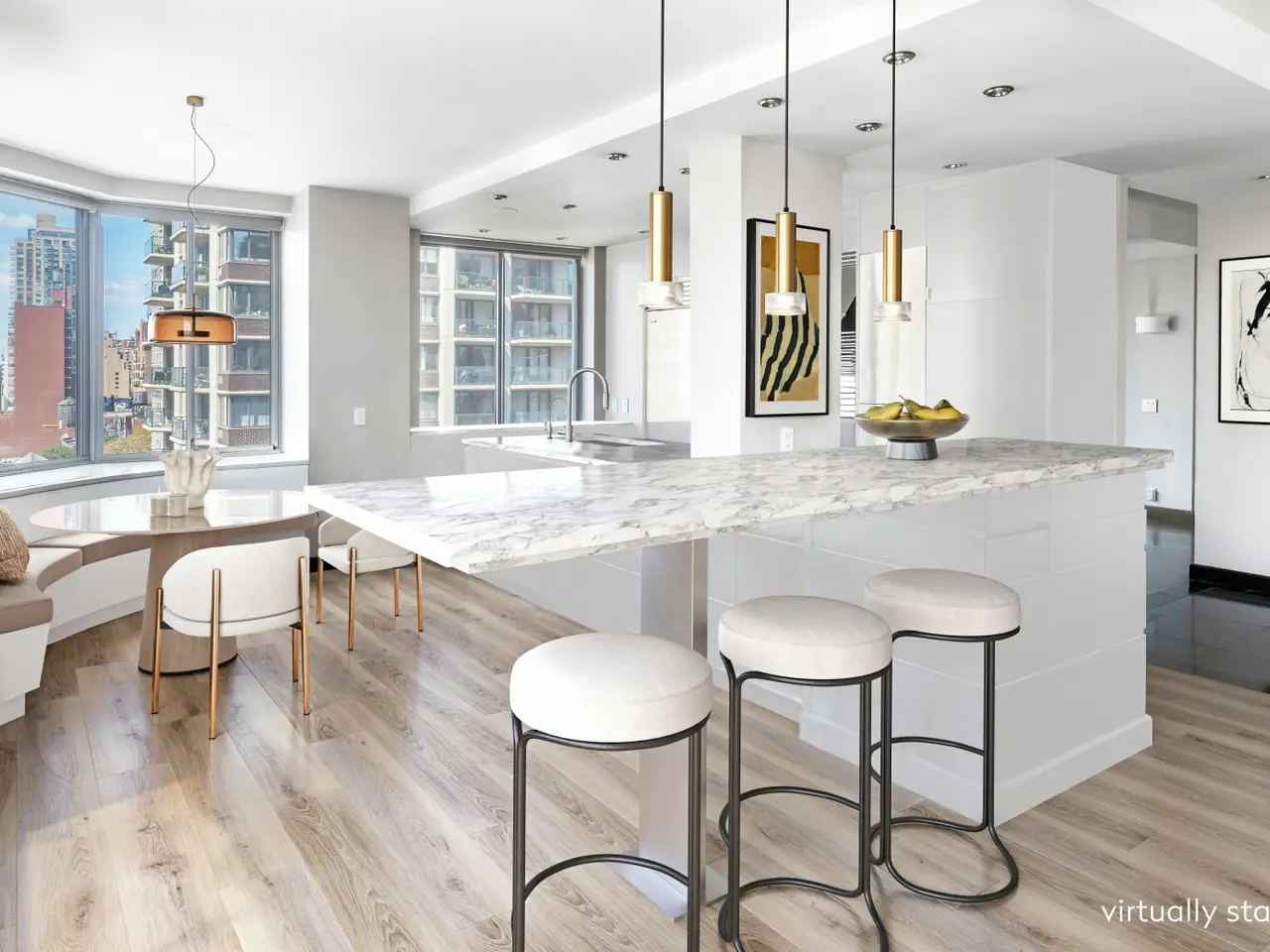 Expansive and Glamorous UES Duplex with Private Outdoor Space Measuring over 3,000 interior square feet and boasting an unbelievable five private outdoor spaces, this sensational duplex combines the scale of a townhouse with the light, views, and elevation of a high-floor home on the Upper East Side-housed in an impeccably run full-service condo with amenities. Every room opens to greenery or skyline vistas. Balconies extend from each bedroom, with additional terraces off the living and dining rooms-rare in any Manhattan residence. To the west, tree-lined 84th Street offers a glimpse of the Park. The main level is designed for entertaining, with fluid transitions that define the living, dining, lounge, and kitchen spaces while preserving an airy, loft-like openness. Light and views flow poetically across the rooms and out to multiple terraces-ideal for relaxing in the sun or grilling. At the heart of the home, the chef's kitchen is anchored by an oversized L-shaped island with seating for six, complemented by a banquette dining nook. Dark-stained cabinetry with stainless-steel accents conceals an appliance garage, built-in spice rack, and abundant storage. Appliances include a Sub-Zero 30" Classic Refrigerator, Wolf six-burner range and oven, Miele dishwasher, and multiple Sub-Zero beverage drawers. The adjoining formal dining room spans nearly 18 feet and opens to a balcony with an electric grill. With space for large gatherings and two Sub-Zero wine refrigerators, the main level was designed for entertaining. Completing this level is a secondary suite generous enough to rival many primaries. This flexible suite includes a home office with built-ins and a spacious guest bedroom or alternative primary with sitting area. The floor also features a discreet powder room and an additional bedroom with a full bath and dressing room. A dramatic floating staircase with a sculptural steel railing anchors the living space and leads gracefully to the upper level, basking in double-height city views. On the upper landing, a built-in desk for two, bathed in natural light, serves as a central home office hub, while a proper laundry closet with a Miele washer/dryer and shelving adds convenience. The primary suite is a private sanctuary of exceptional scale, framed by a terrace and a windowed seating area that invites slower starts to the day-perfect for coffee, reading, or even a light-filled mini gym or lounge. Expansive custom storage, including a walk-in closet, enhances both functionality and elegance. Two full bathrooms complete this retreat, a rare luxury in any home. One offers a Jacuzzi soaking tub and glass stall shower set beside a large window overlooking the city. The second features a walk-in shower and generous counter space. Both include radiant heated floors and sophisticated tilework. Across the landing, another generous bedroom with a windowed en-suite bathroom and excellent storage completes the upper level. Additional highlights include hammered metal sinks, curated architectural lighting, City Quiet Windows in the bedrooms, a generous pantry, and multiple walk-in closets. 401 East 84th Street offers the convenience of a full-time staff and resident manager, paired with a collection of amenities- all with no additional amenity fees. Residents enjoy a rooftop deck, fitness center, laundry facilities, children's playroom, and a versatile event space. The lobby was newly updated as well. The Dunhill all moments from the Q train, the neighborhood's dining scene, Carl Schurz Park, and top-rated private and public schools. Note: Buyer responsible for a reserve fund contribution equal to three months of common charges, due at purchase application submission. This sale uniquely includes ownership of 4 private storage units.