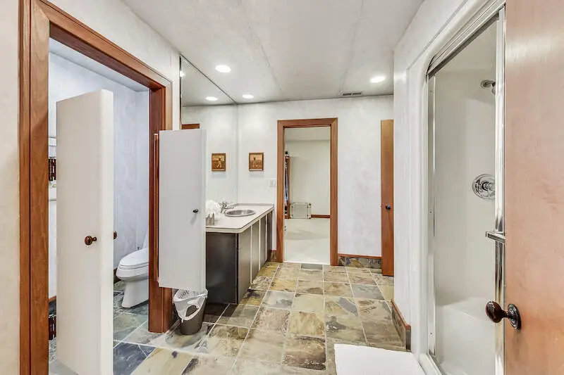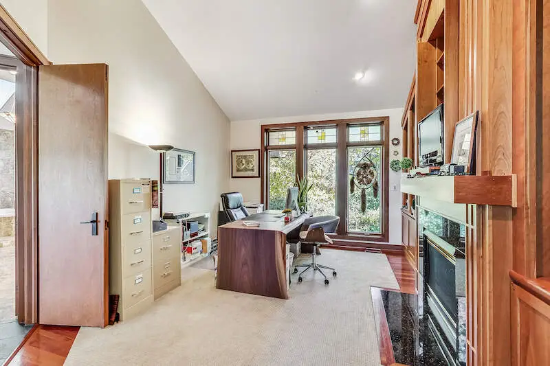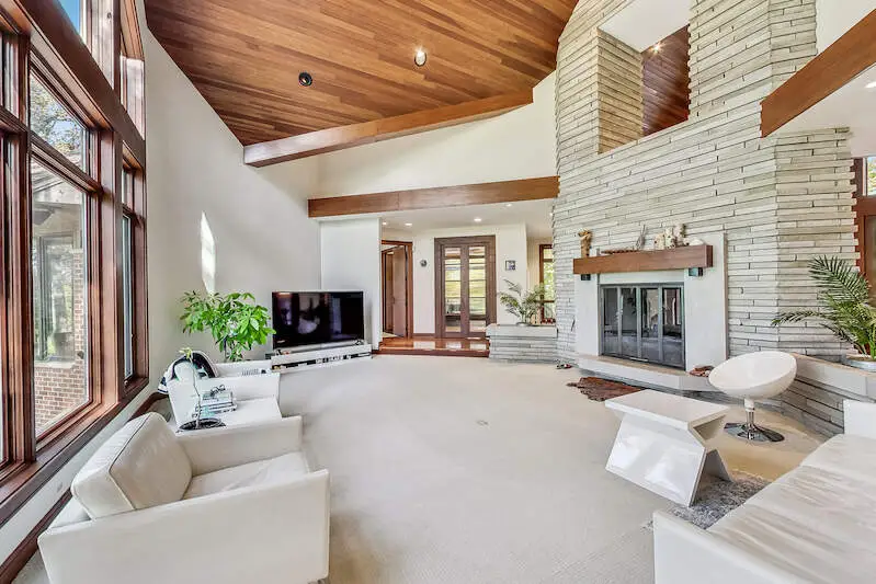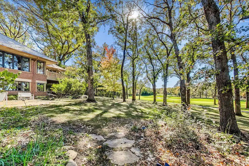 Designed by the talented and highly acclaimed architect, Ron McCormick. Iconic home situated on approximately 1.3 acres and overlooking the sweeping views of 16th fairway of Wynstone Golf Course. For those discriminating buyers desiring the finest of a unique custom built home with features including stone and woods incorporating the gorgeous oaks of outside and the contemporary oasis of the inside. One is welcomed by a dramatic entrance to almost 4000 square feet on the first floor! The layout and style of the home captures every aspect of the property. Ideal home for those seeking multi generational situation or more elegant and private guest space. Expansive primary suite on main level, blend of mid century and Frank Lloyd Wright tones in the kitchen, dining area, and great room with expensive flooring and wood touches. Upstairs provides the perfect guest quarters with living space, bedroom, and separate kitchenette area. The finished walkout emphasizes the openness of the home and highlights the floating staircase. Incredible spaciousness to entertain, enjoy the fine elements of the home, and the impressive property with towering trees. Recent HVAC replaced and one year new roof.