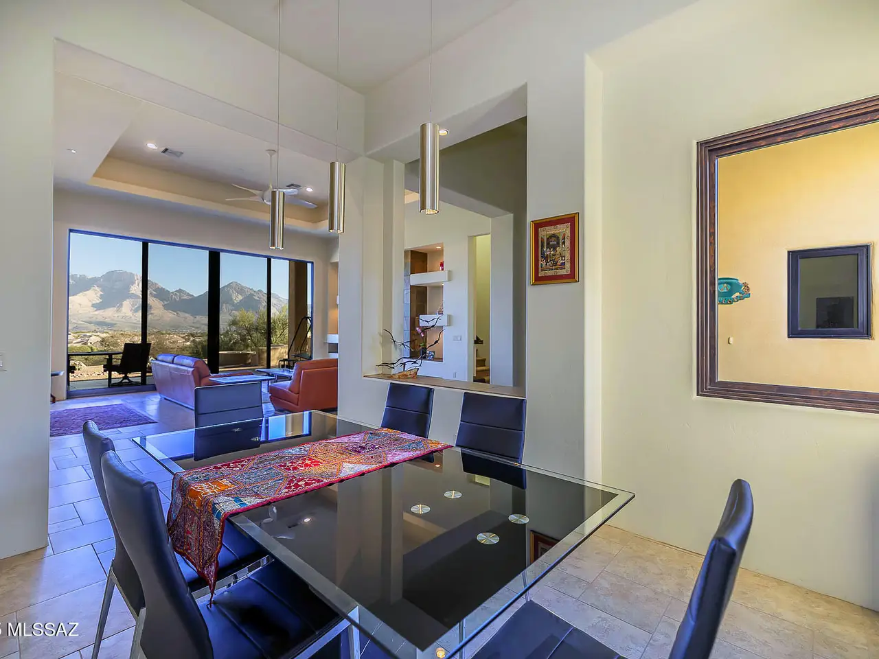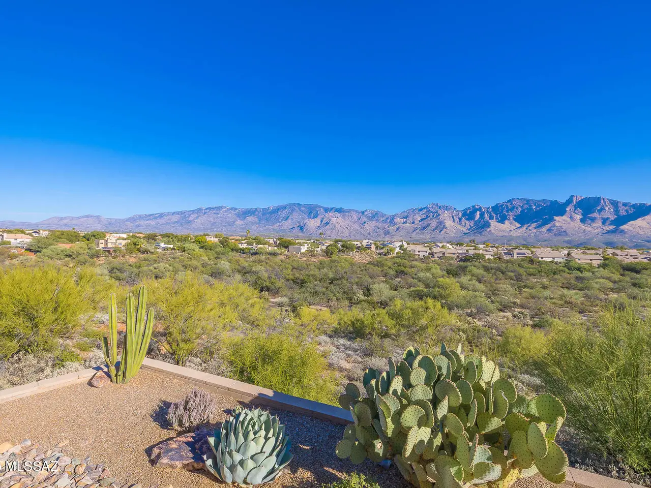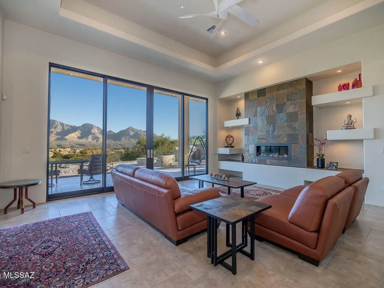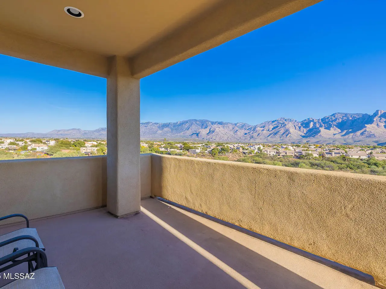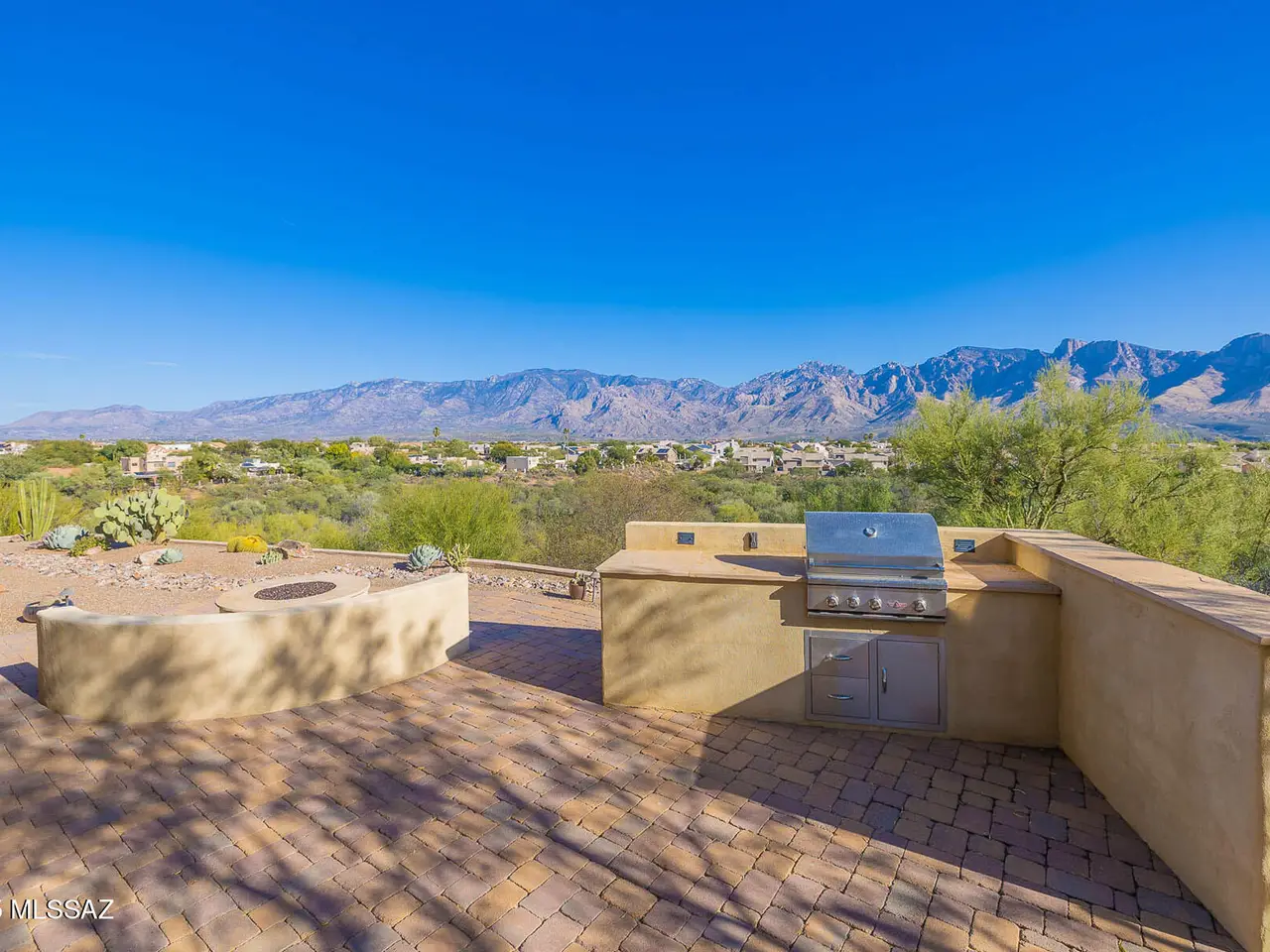 LUXURIOUS CUSTOM ESTATE nestled within the gated, picturesque community of Vistoso Pointe affords architectural detail, flexible living spaces plus uncompromising desert, mountain & city light views. Elevated, Premium East-facing lot with no one directly behind affords ultimate privacy. Featured are 4 bedrooms, 2.5 baths plus 3,531 sq ft of elegant living space including a spacious, upper level office/5th bedroom. Striking courtyard entry displays an expansive wrought iron gate with slate tile surround to welcome your guests. Inviting foyer flows effortlessly to formal dining room and large gathering room displaying a soaring, recessed ceiling, slate tiled fireplace flanked by art shelves, plus walls of windows accentuating the magnificent views. Gourmet kitchen hosts large center island, in-wall ovens and gas cooktop, open dining area with views plus outer island with wine cooler. Neutral stone floors highlight main living areas with granite countertops in kitchen, laundry & baths. Expansive Owner's Suite with rear patio access hosts a luxury spa bath with dual vanities, soaking tub, plus walk-in rain head shower and custom closet. Third bedroom is ideal as a Den/Media room while expansive upper-level Office accesses private balcony touting forever views. Extended laundry with sink adjoins powder room and 3-car garage with rustic iron doors and storage cabinets. Additional amenities include rich-hued cabinetry and doors, carpeted bedrooms, backlit art alcoves, fire sprinklers plus rolling sunshades off dining room. Retreat to a rear covered patio with outer cobblestone pavers, built-in grill station, firepit with curved bench seating, plus professional landscaping and spectacular views. Perfect for the most discerning buyer!
