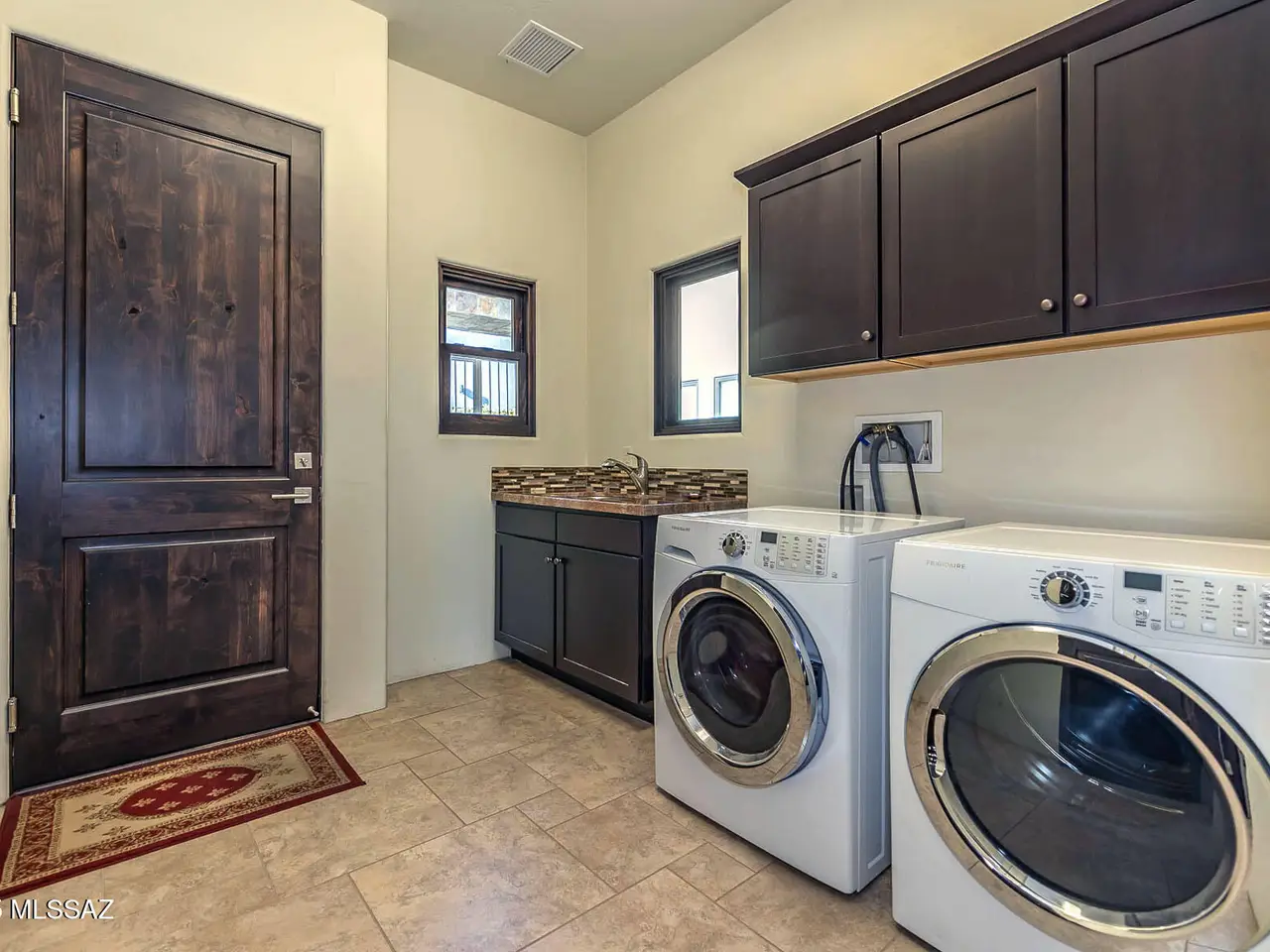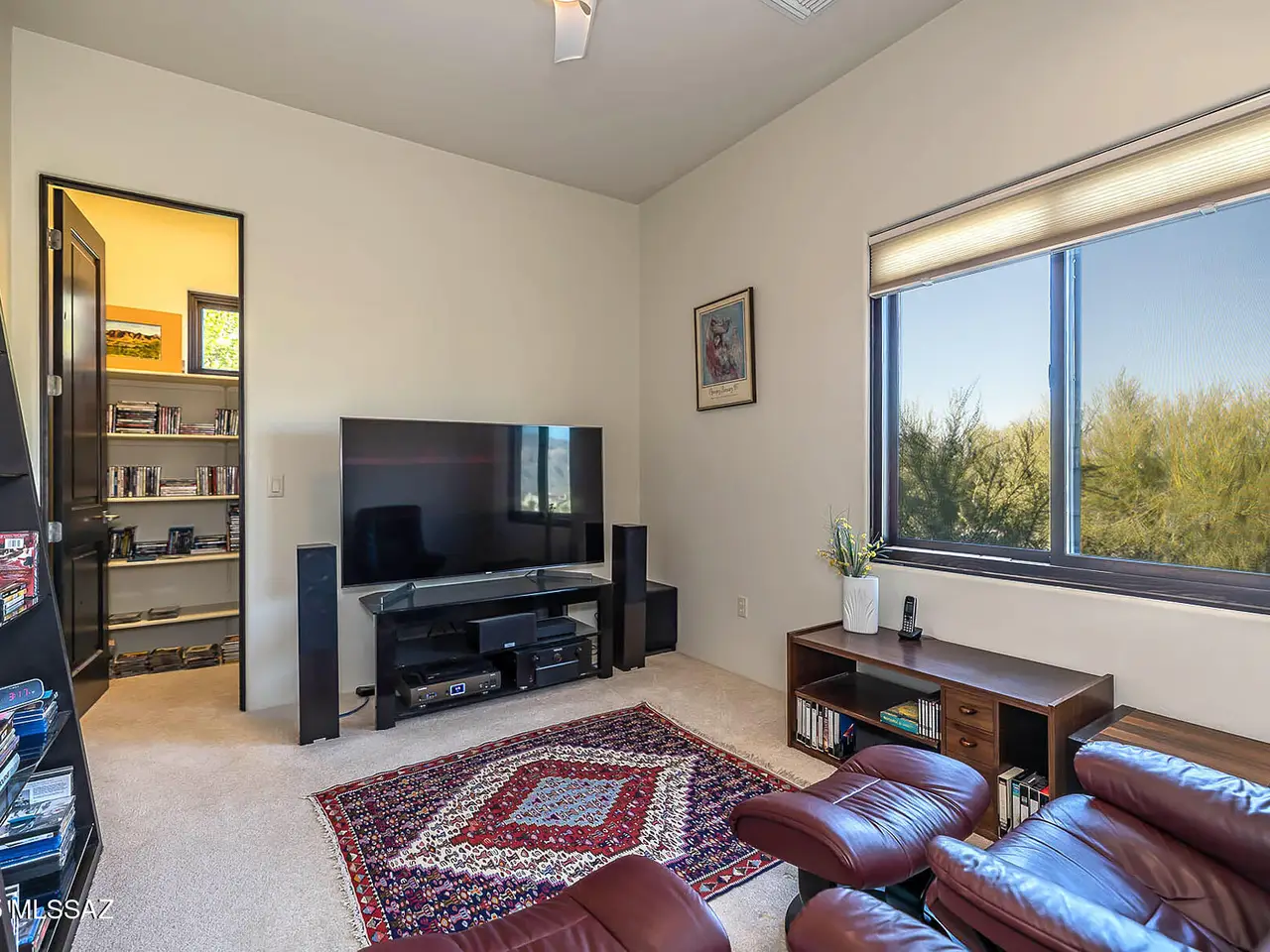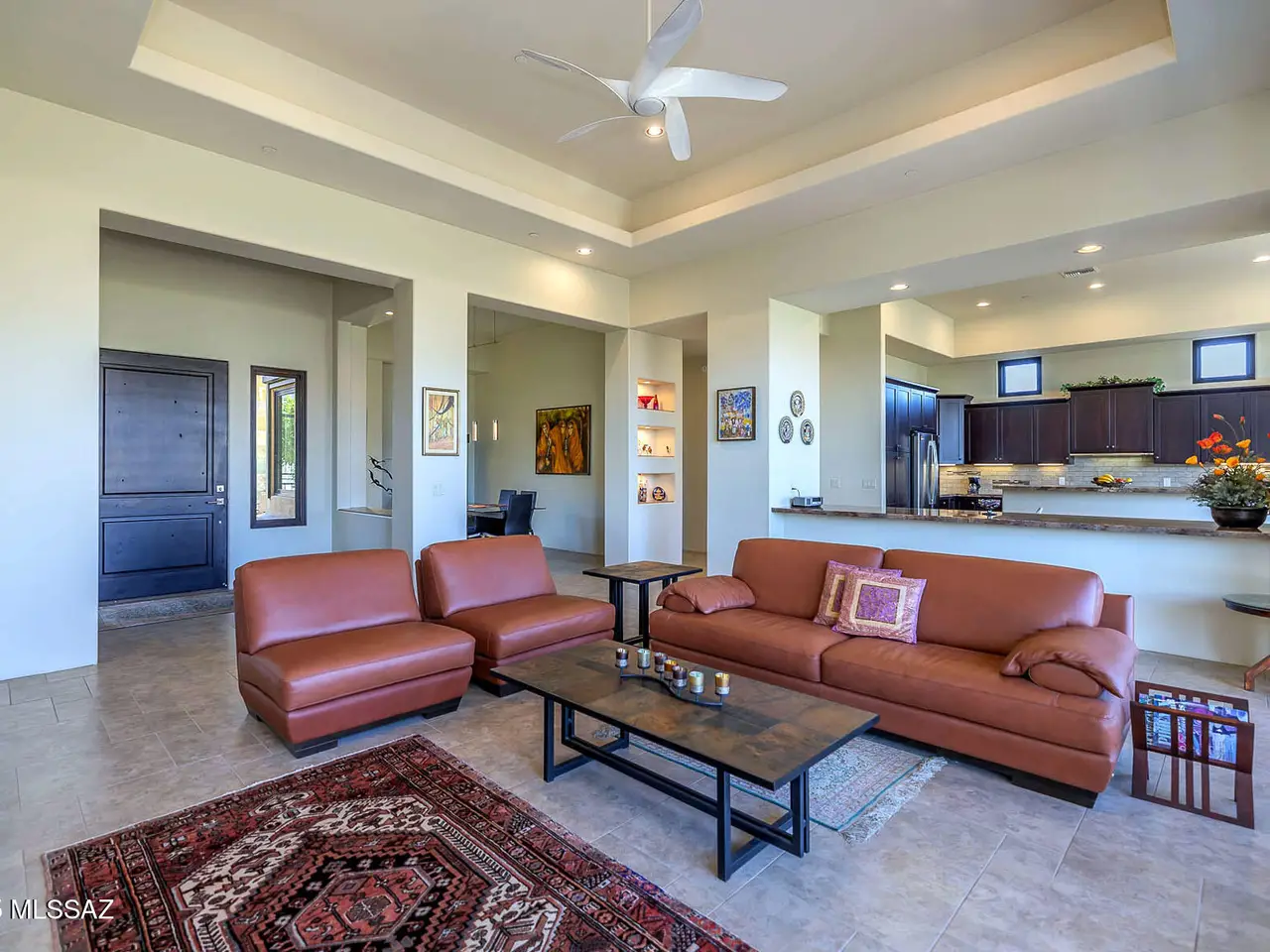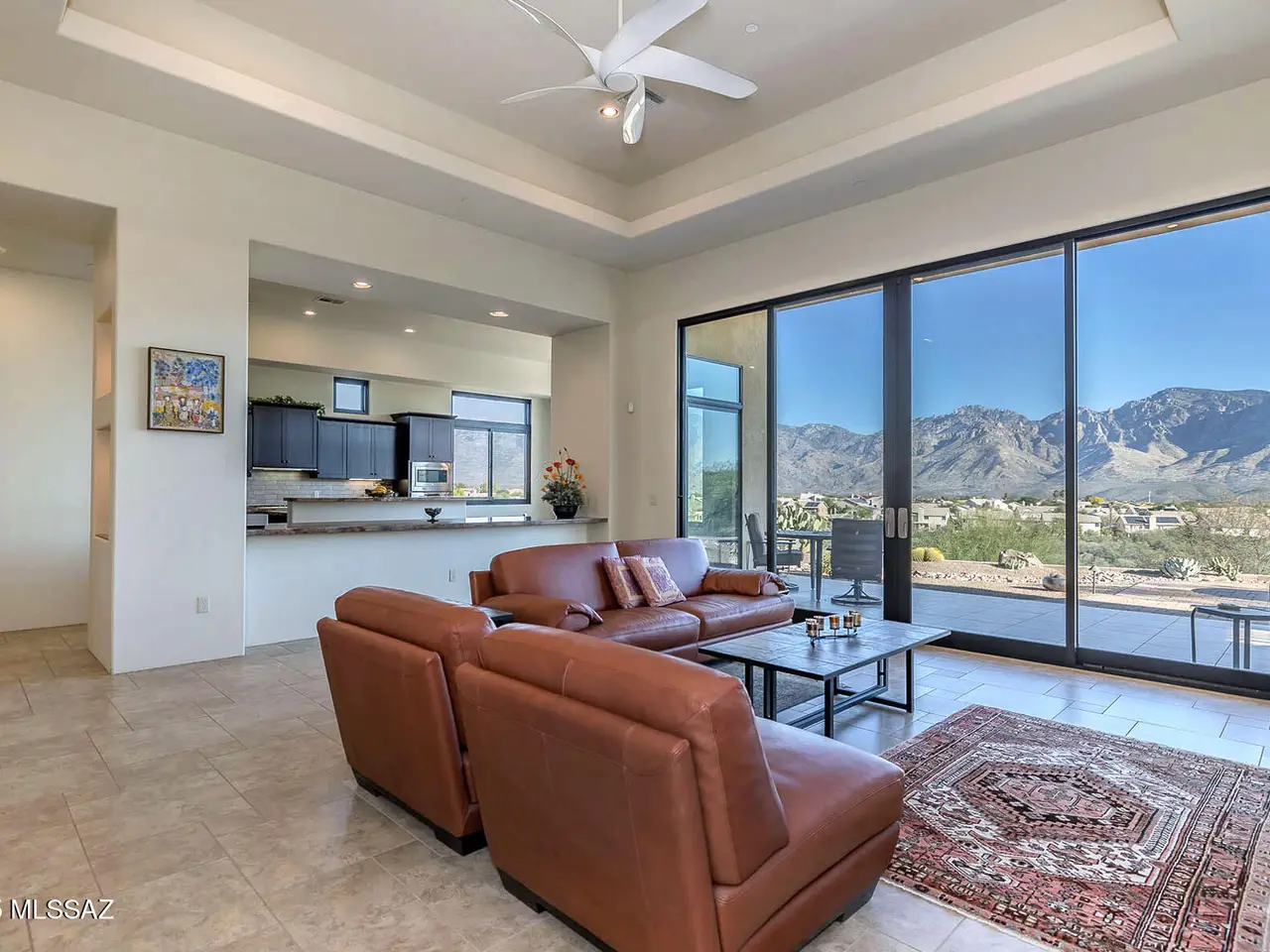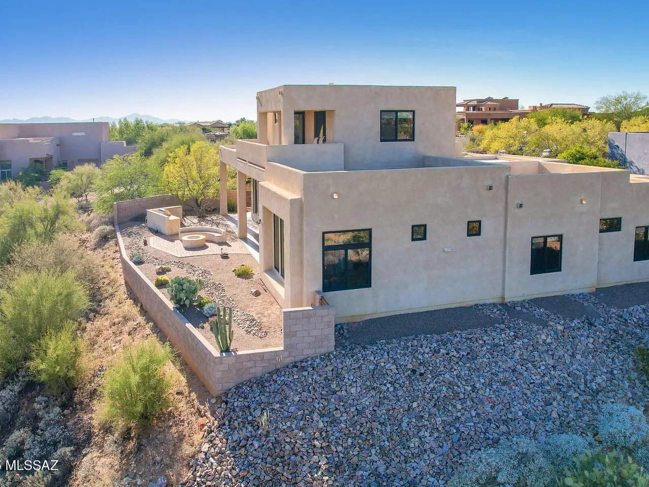 LUXURIOUS CUSTOM ESTATE nestled within the gated, picturesque community of Vistoso Pointe affords architectural detail, flexible living spaces plus uncompromising desert, mountain & city light views. Elevated, Premium East-facing lot with no one directly behind affords ultimate privacy. Featured are 4 bedrooms, 2.5 baths plus 3,531 sq ft of elegant living space including a spacious, upper level office/5th bedroom. Striking courtyard entry displays an expansive wrought iron gate with slate tile surround to welcome your guests. Inviting foyer flows effortlessly to formal dining room and large gathering room displaying a soaring, recessed ceiling, slate tiled fireplace flanked by art shelves, plus walls of windows accentuating the magnificent views. Gourmet kitchen hosts large center island, in-wall ovens and gas cooktop, open dining area with views plus outer island with wine cooler. Neutral stone floors highlight main living areas with granite countertops in kitchen, laundry & baths. Expansive Owner's Suite with rear patio access hosts a luxury spa bath with dual vanities, soaking tub, plus walk-in rain head shower and custom closet. Third bedroom is ideal as a Den/Media room while expansive upper-level Office accesses private balcony touting forever views. Extended laundry with sink adjoins powder room and 3-car garage with rustic iron doors and storage cabinets. Additional amenities include rich-hued cabinetry and doors, carpeted bedrooms, backlit art alcoves, fire sprinklers plus rolling sunshades off dining room. Retreat to a rear covered patio with outer cobblestone pavers, built-in grill station, firepit with curved bench seating, plus professional landscaping and spectacular views. Perfect for the most discerning buyer!