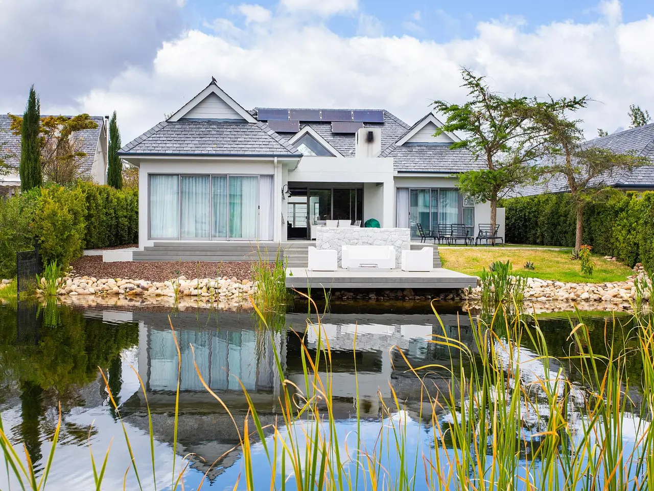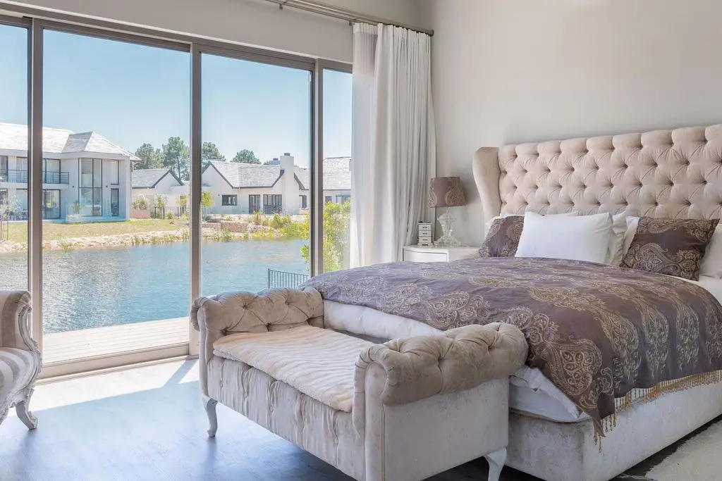 This elegant North facing lake home offers 4 bedrooms and 4 bathrooms. The spacious double volume living area includes wonderful entertainment spaces with a bar and dual gas and wood burning indoor braai. A covered patio and lakeside deck with boma braai add to the entertainer appeal. The home also offers an exquisite kitchen and scullery, study, unique loft room in the 4th bedroom and 3 garages. The setting is uniquely north-facing onto the water and guarantees spectacular views. A perfect home for outdoor living with its pool & entertainment areas - almost untouched by the south easterly wind. Extra Features: * Parking bay for golf cart behind gate * Additional parking for 7 cars on dirveway * Photo voltaic(PV) solar panels * 300 L twin geysers with heat pump * Pool with chlorinator and silent pump * Boma/fire pit on deck * Wifi hot zones and hard wired internet throughout home * USB ports on multi plugs throughout home * Smeg gas/electric hob and oven * Double glazing to all north and west facing windows * All floors are insulated with high density foam * All west facing walls have insulation in cavities