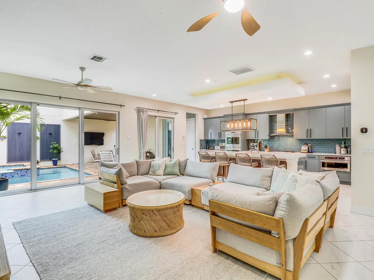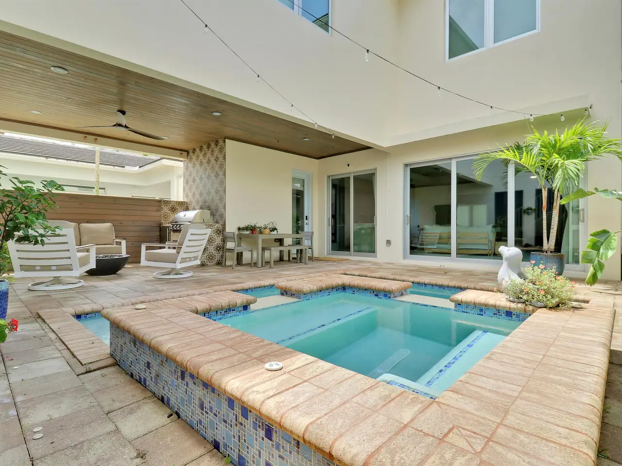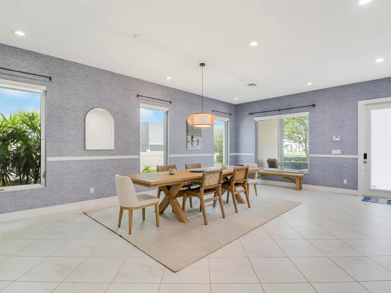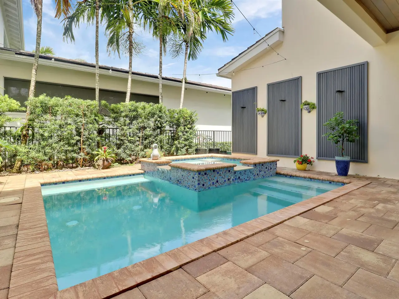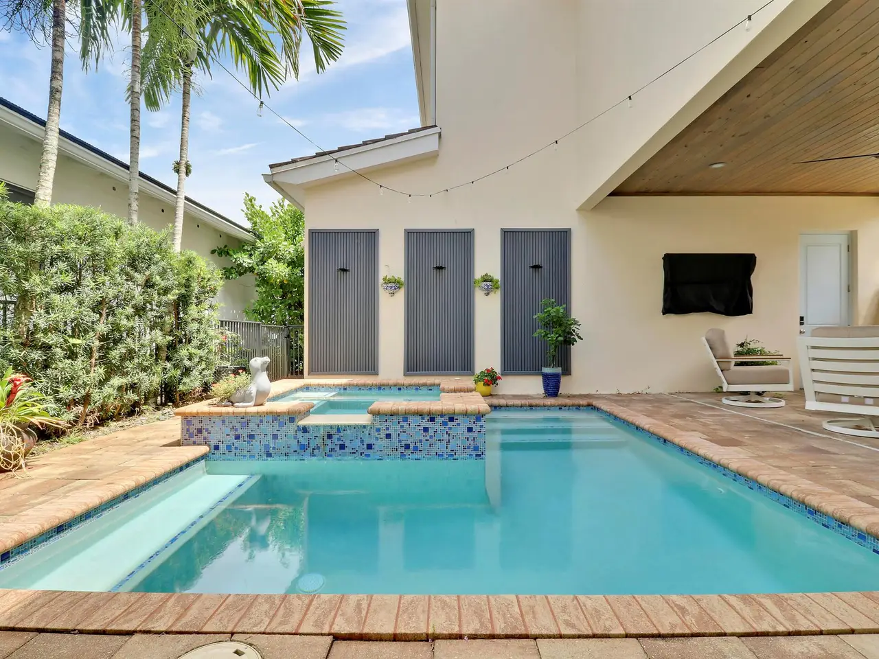 This stunning move-in ready home features porcelain floors downstairs, vinyl plank floors upstairs, custom wallpaper, designer paint, light fixtures, wood slat panels, and window treatments. The gourmet kitchen offers granite countertops, high-end appliances, and a built-in refrigerator. A stylish lounge with wet bar has replaced the downstairs office -- perfect for entertaining. Upstairs, the owner's suite includes two walk-in closets, a spa-style bathroom and a private balcony. There's also three additional bedrooms, plus a home gym and a 5th bedroom, currently used as an office. Enjoy a private outdoor oasis with pool, hot tub, and summer kitchen. A three-car garage offers ample storage, while security cameras and keypads provide peace of mind. Close to the I-95 and the Turnpike, 20 mins to PBI.