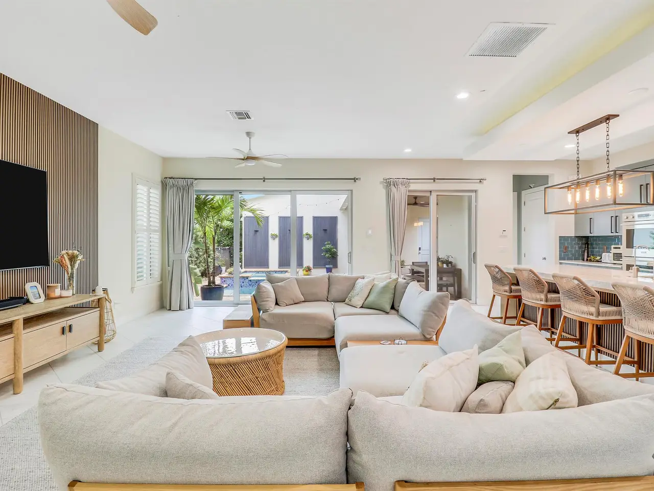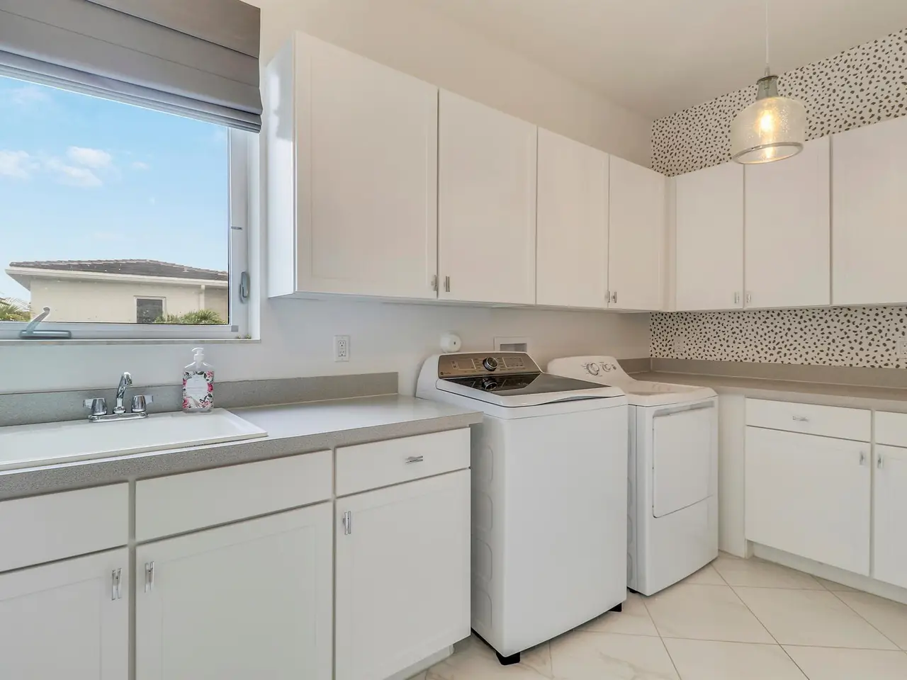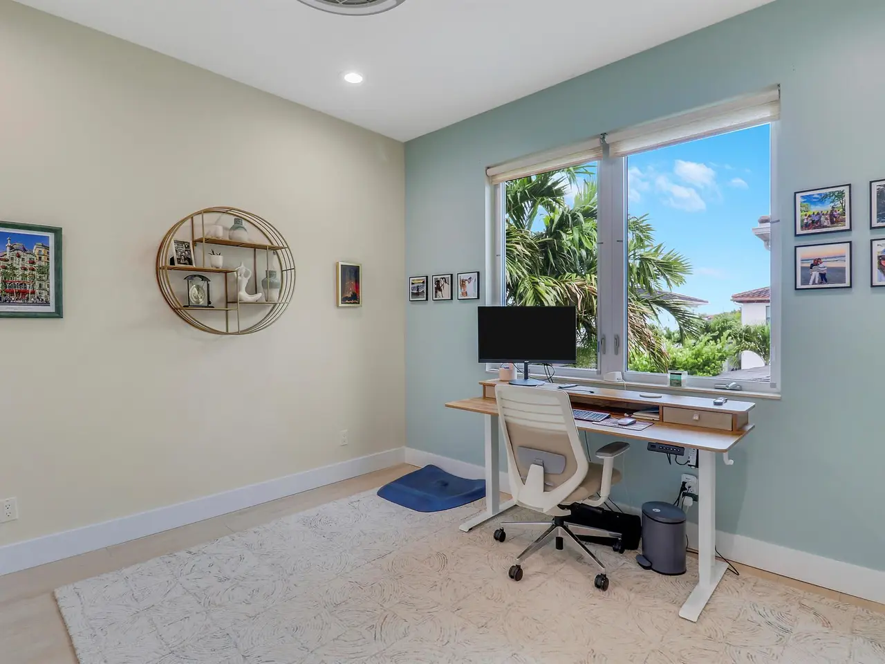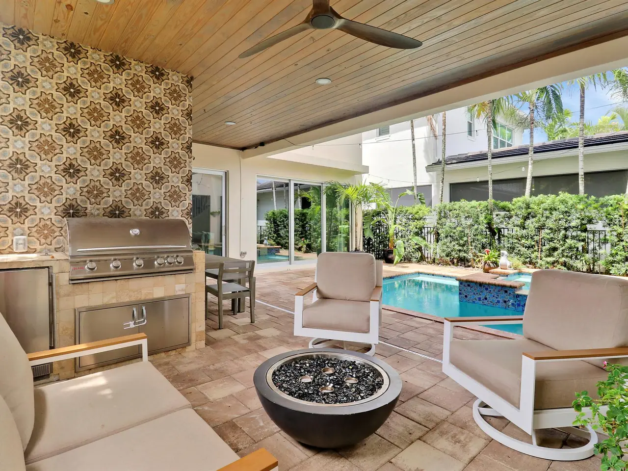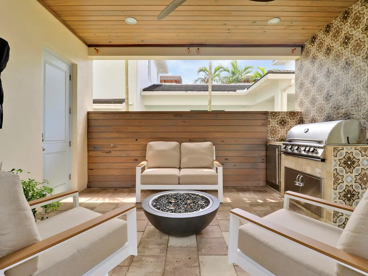 This stunning move-in ready home features porcelain floors downstairs, vinyl plank floors upstairs, custom wallpaper, designer paint, light fixtures, wood slat panels, and window treatments. The gourmet kitchen offers granite countertops, high-end appliances, and a built-in refrigerator. A stylish lounge with wet bar has replaced the downstairs office -- perfect for entertaining. Upstairs, the owner's suite includes two walk-in closets, a spa-style bathroom and a private balcony. There's also three additional bedrooms, plus a home gym and a 5th bedroom, currently used as an office. Enjoy a private outdoor oasis with pool, hot tub, and summer kitchen. A three-car garage offers ample storage, while security cameras and keypads provide peace of mind. Close to the I-95 and the Turnpike, 20 mins to PBI.