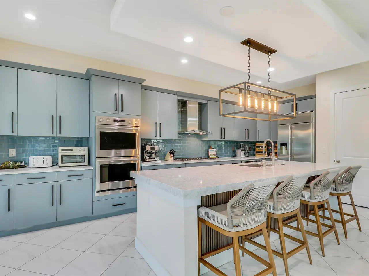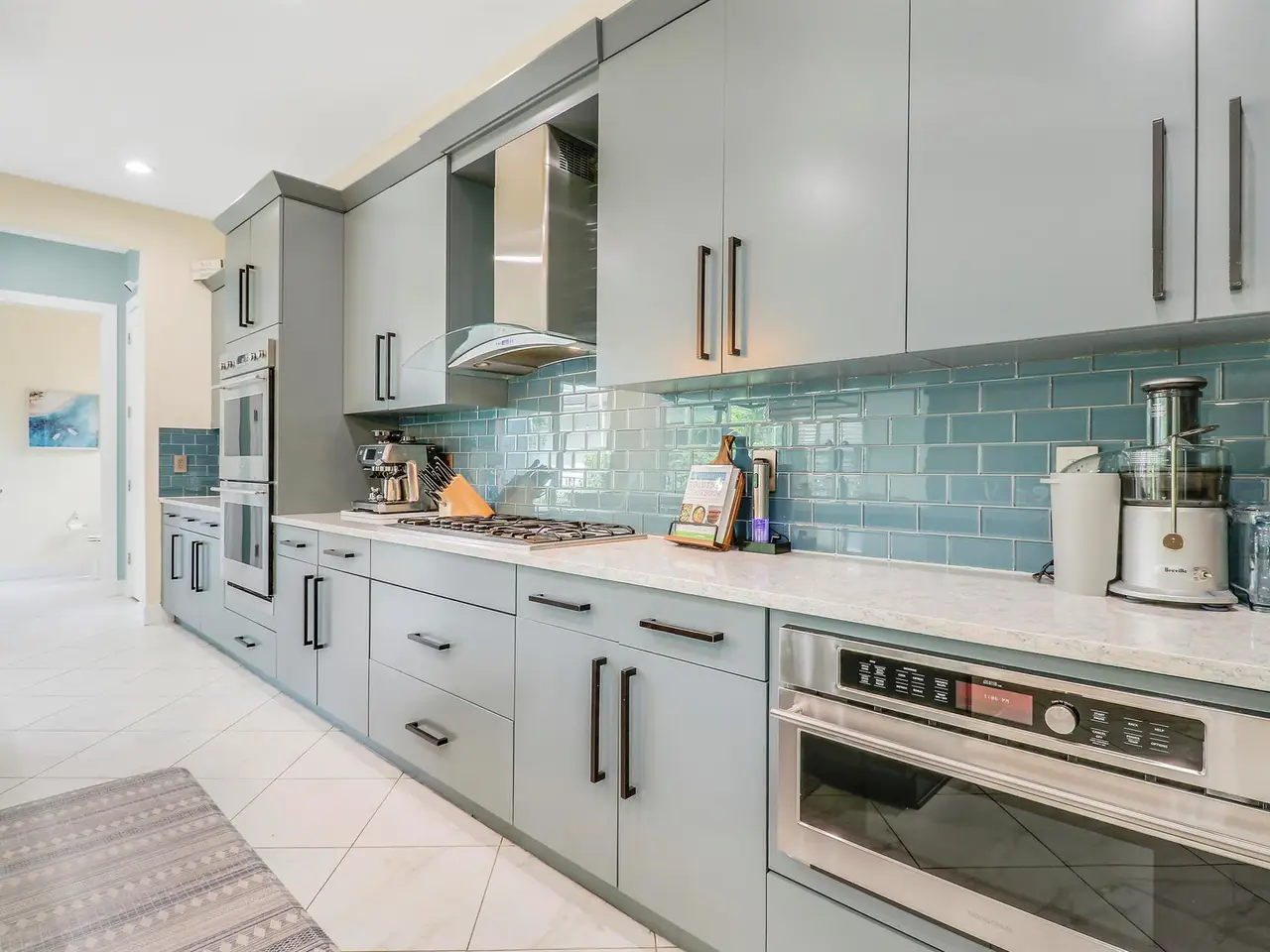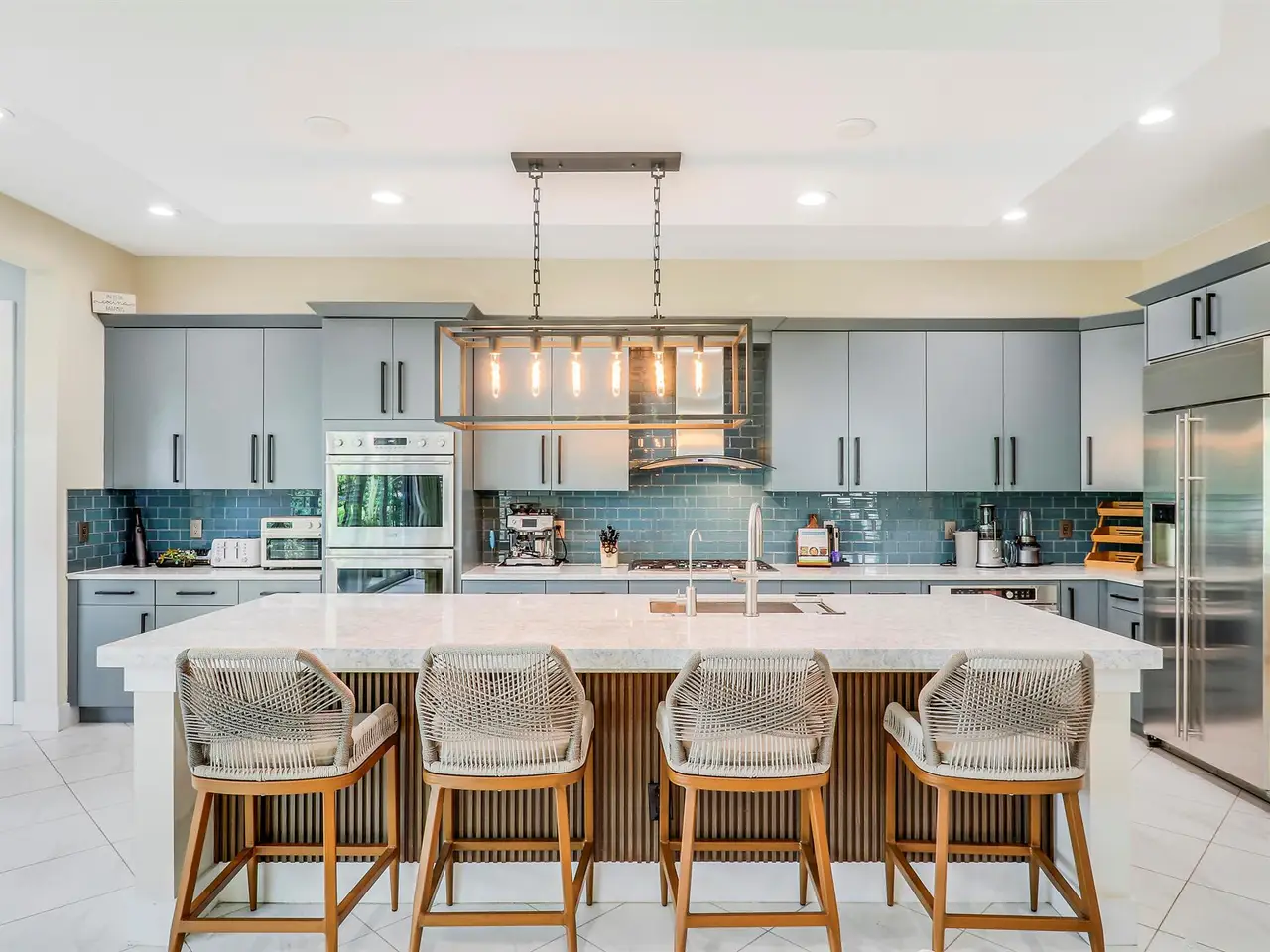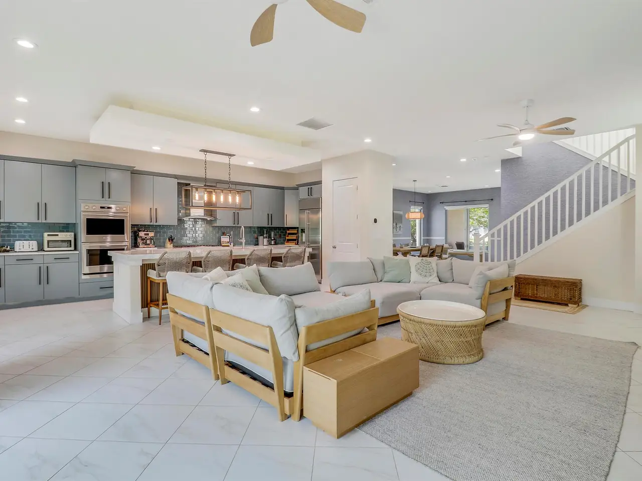 This stunning move-in ready home features porcelain floors downstairs, vinyl plank floors upstairs, custom wallpaper, designer paint, light fixtures, wood slat panels, and window treatments. The gourmet kitchen offers granite countertops, high-end appliances, and a built-in refrigerator. A stylish lounge with wet bar has replaced the downstairs office -- perfect for entertaining. Upstairs, the owner's suite includes two walk-in closets, a spa-style bathroom and a private balcony. There's also three additional bedrooms, plus a home gym and a 5th bedroom, currently used as an office. Enjoy a private outdoor oasis with pool, hot tub, and summer kitchen. A three-car garage offers ample storage, while security cameras and keypads provide peace of mind. Close to the I-95 and the Turnpike, 20 mins to PBI.
