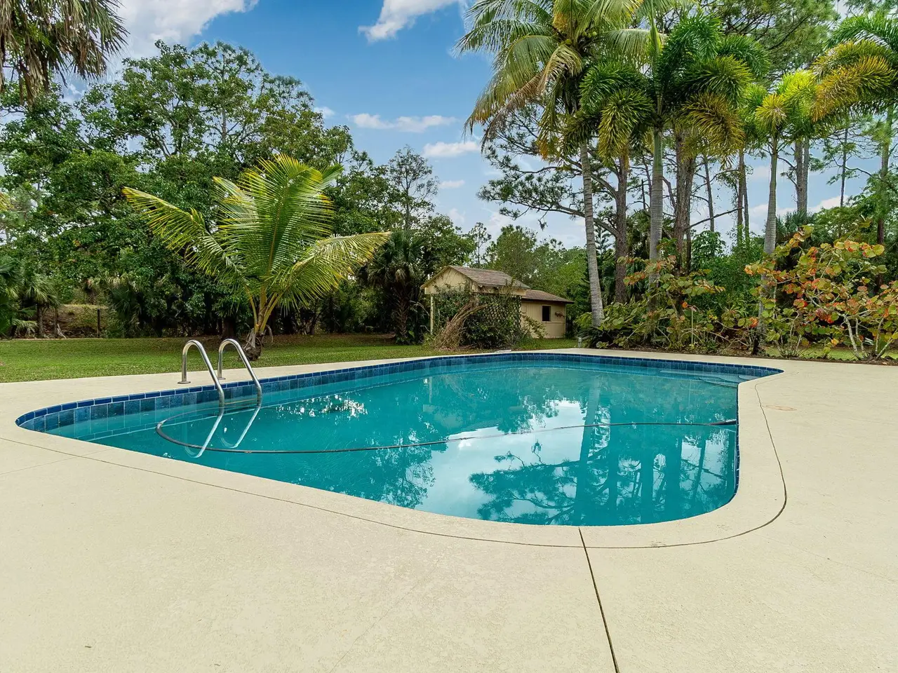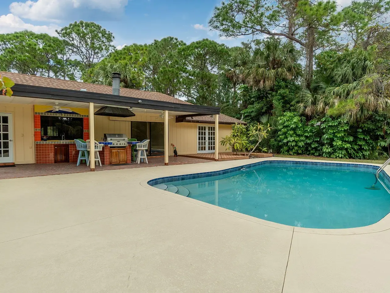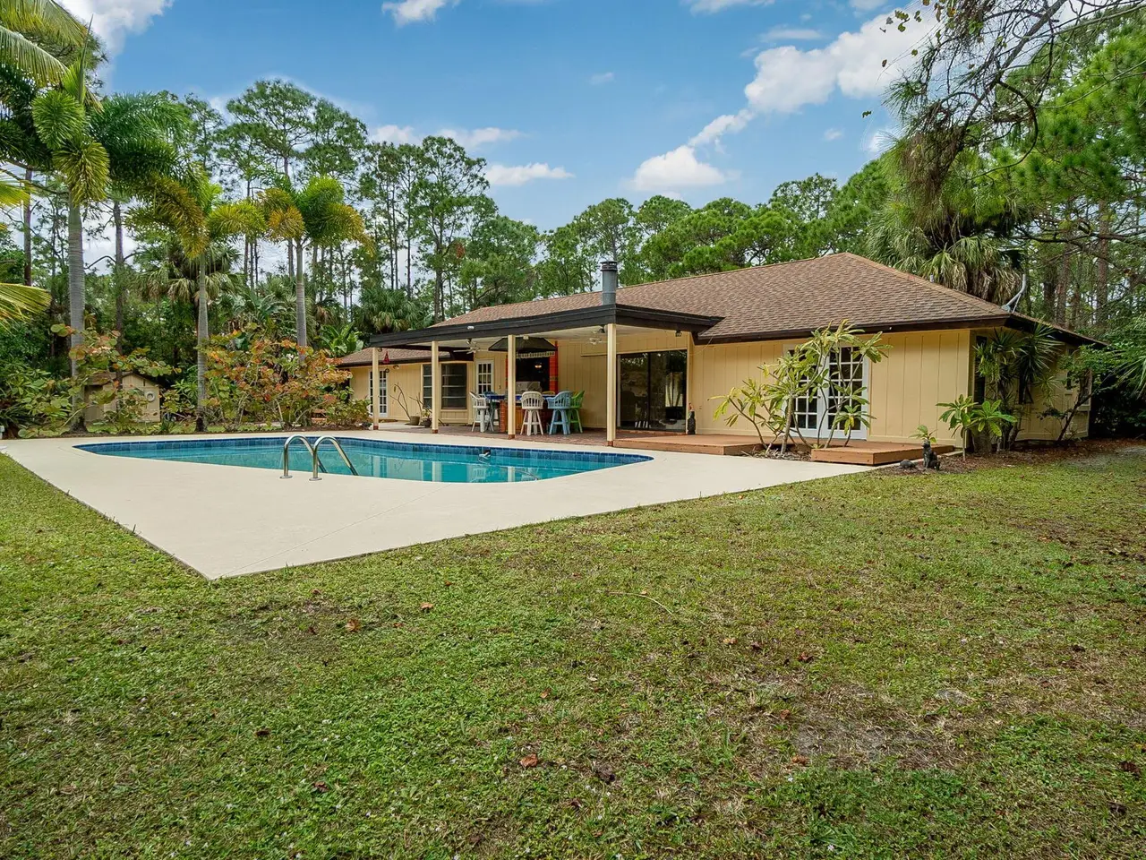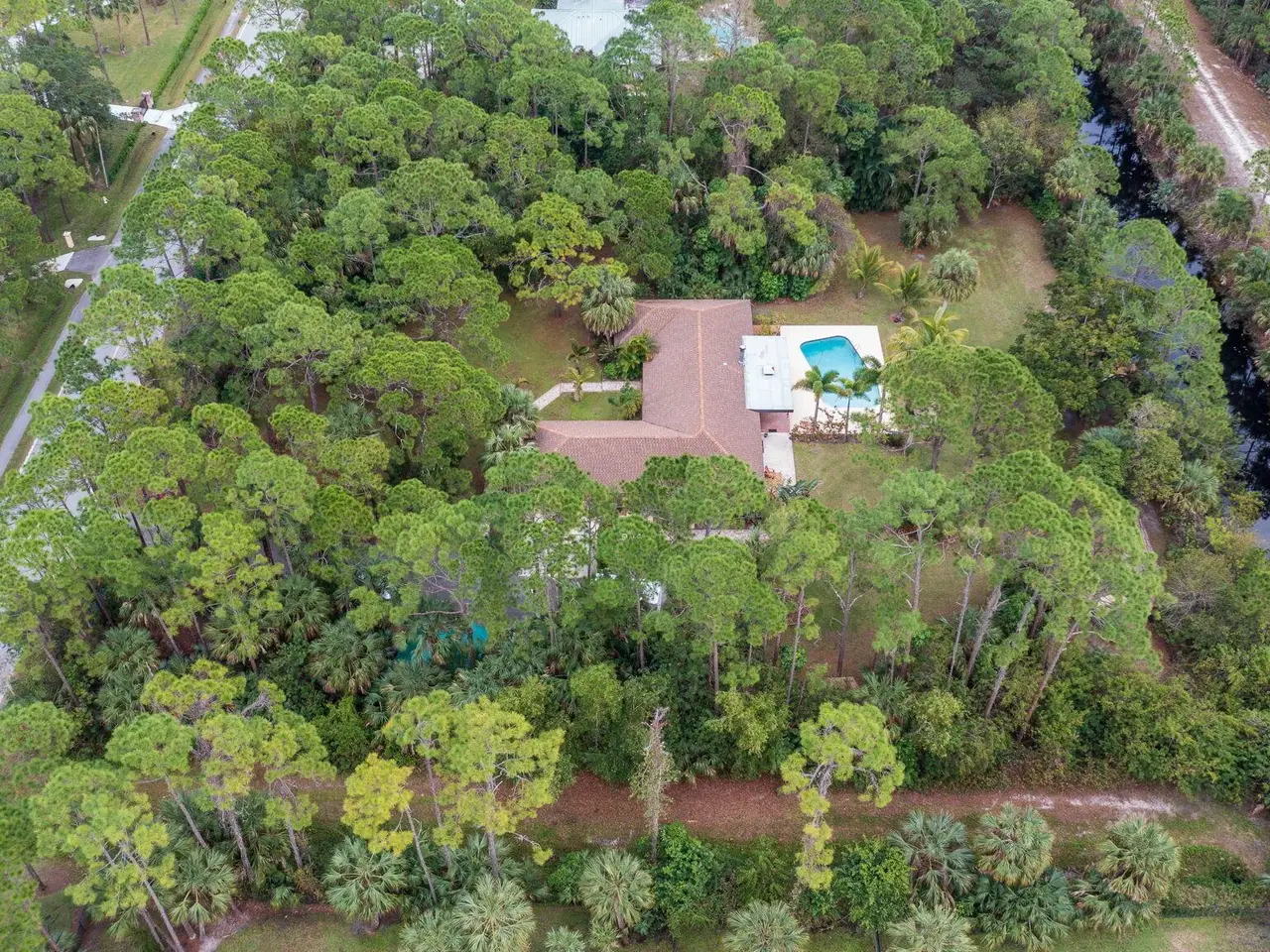 Rare find CANALFRONT four bed, two bath in Palm Beach Country Estates! This fabulous home backs up to a canal with a small private boat dock. This 1.34 acre private and secluded lot (as behind the canal is the 2,700-acre Sandhill Crane Wildlife Refuge PLUS there is a county 30-foot easement on the west side). The home features a newly refinished large pool and patio deck with 30-foot covered patio and summer kitchen with bar. Mexican tile throughout, large bedrooms, kitchen has stainless appliances, wood cabinets, granite countertop, pass thru to patio. Real wood burning fireplace, real wood exposed beams, interior laundry room, French doors, crown molding, large entry way, new epoxy garage floors. Plenty of storage with exterior shed and horse barn! Paved road! Owner has lived here for 35-plus years! No HOA! Must see!