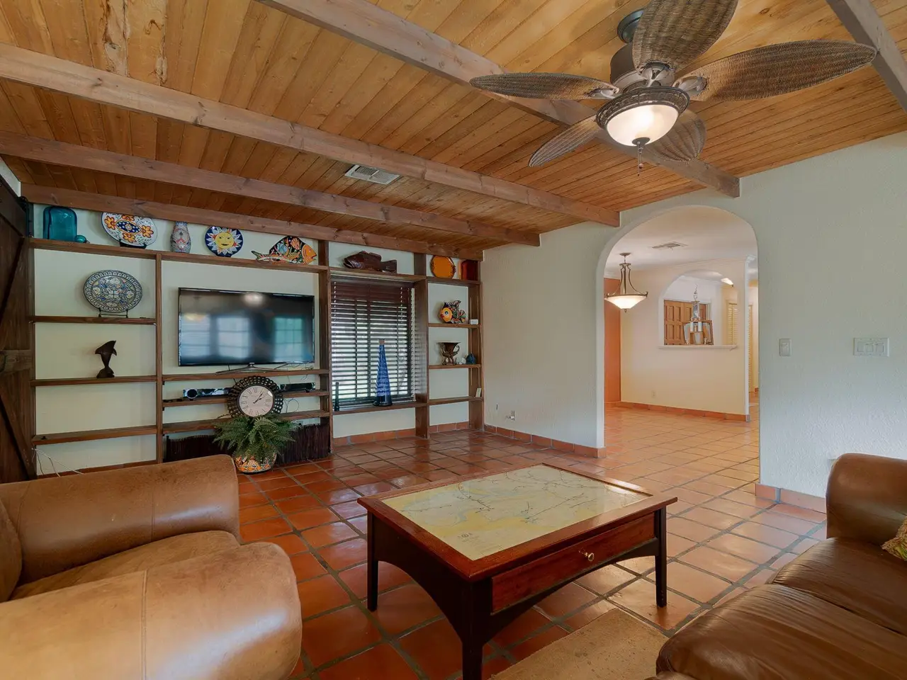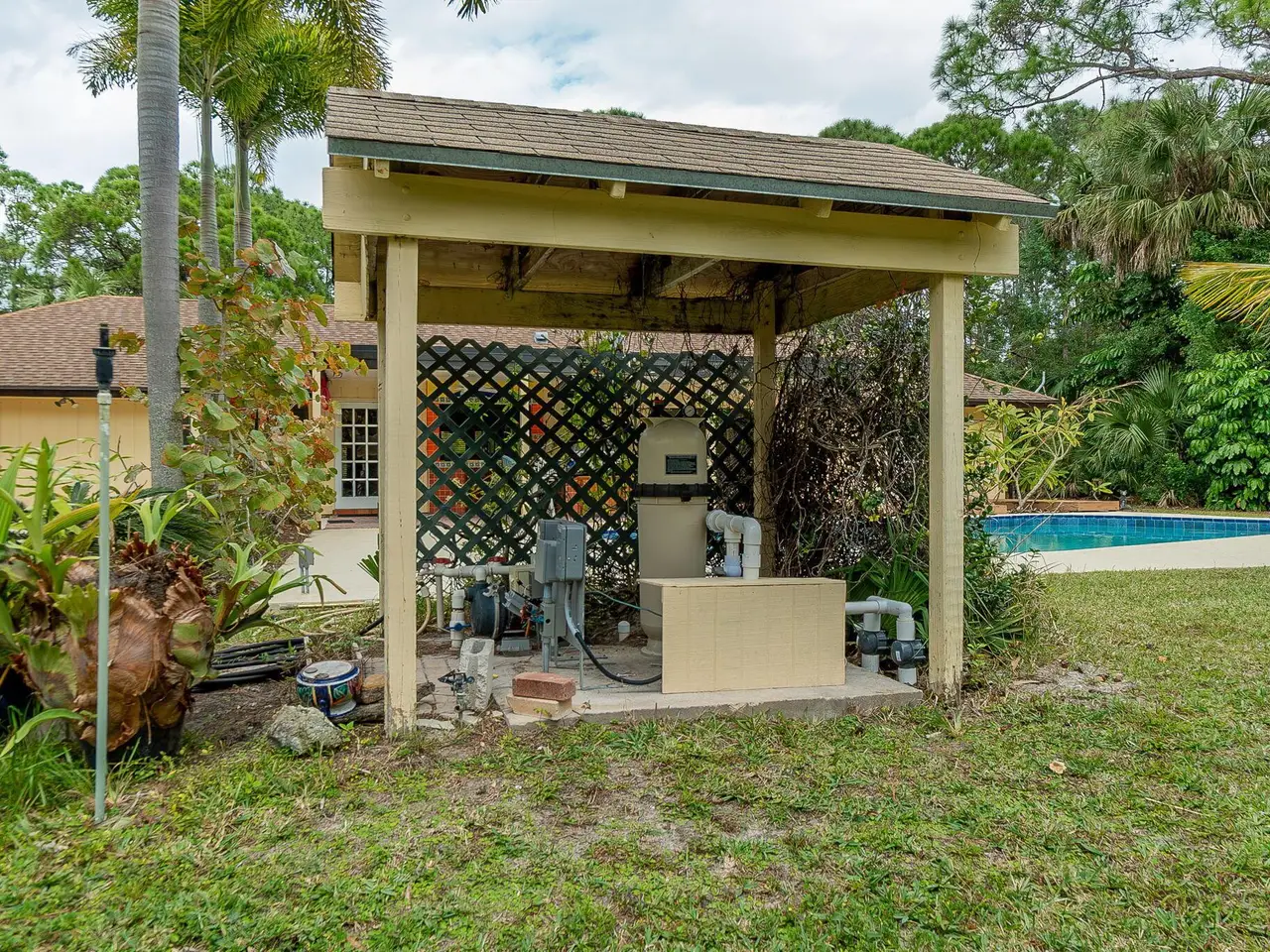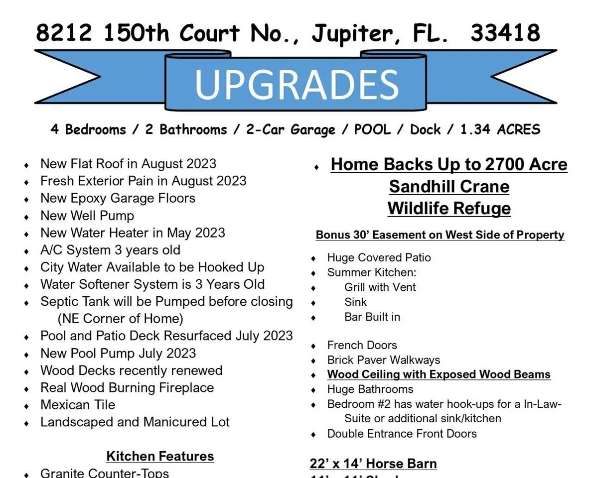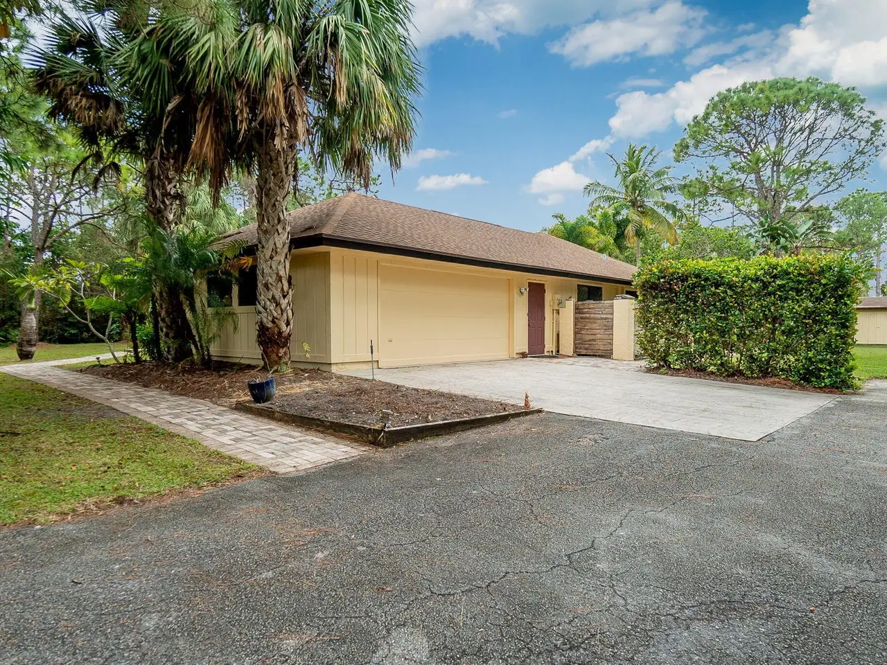 Rare find CANALFRONT four bed, two bath in Palm Beach Country Estates! This fabulous home backs up to a canal with a small private boat dock. This 1.34 acre private and secluded lot (as behind the canal is the 2,700-acre Sandhill Crane Wildlife Refuge PLUS there is a county 30-foot easement on the west side). The home features a newly refinished large pool and patio deck with 30-foot covered patio and summer kitchen with bar. Mexican tile throughout, large bedrooms, kitchen has stainless appliances, wood cabinets, granite countertop, pass thru to patio. Real wood burning fireplace, real wood exposed beams, interior laundry room, French doors, crown molding, large entry way, new epoxy garage floors. Plenty of storage with exterior shed and horse barn! Paved road! Owner has lived here for 35-plus years! No HOA! Must see!