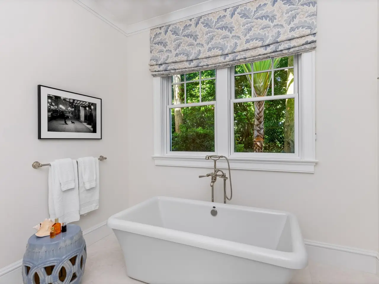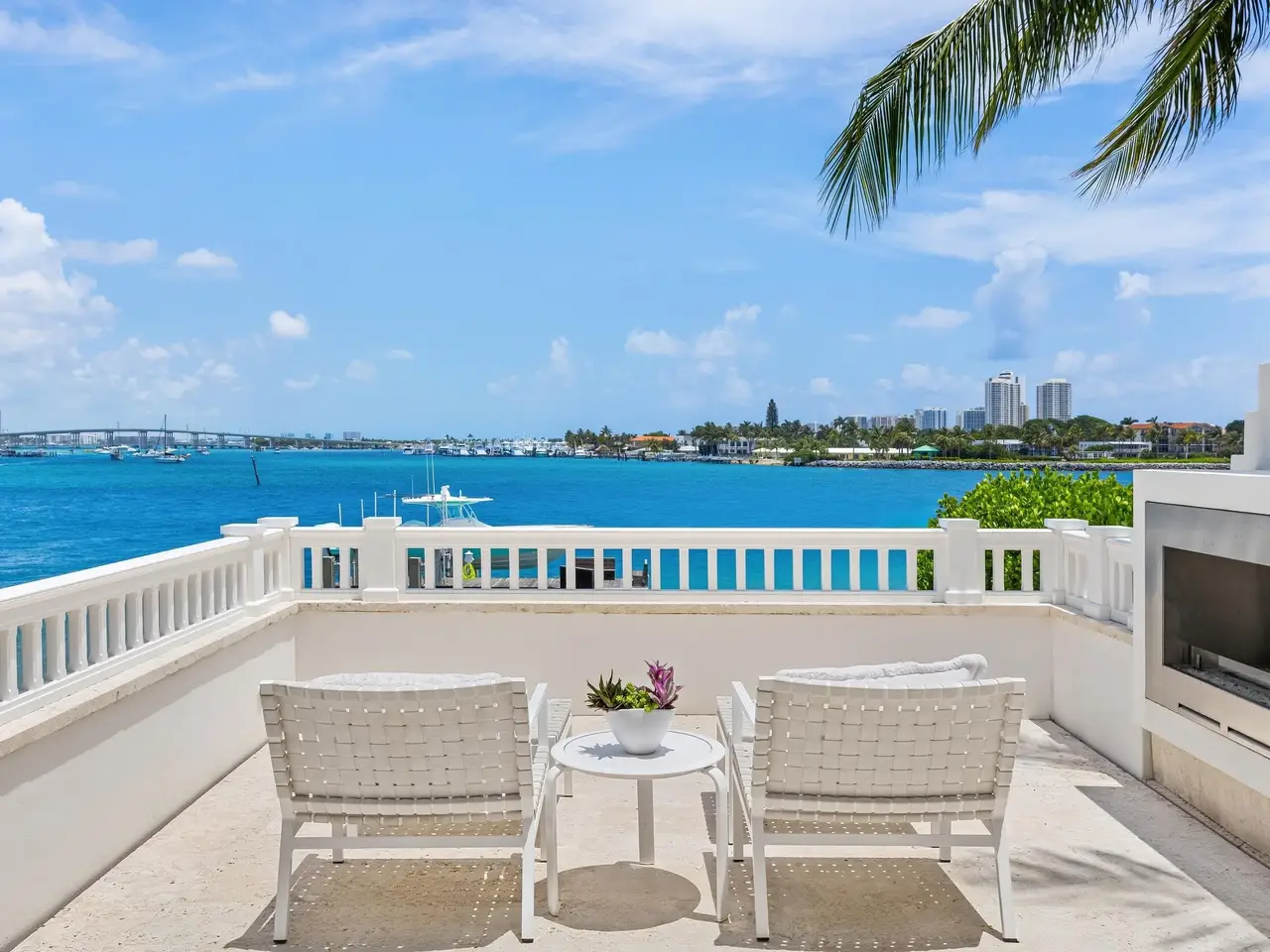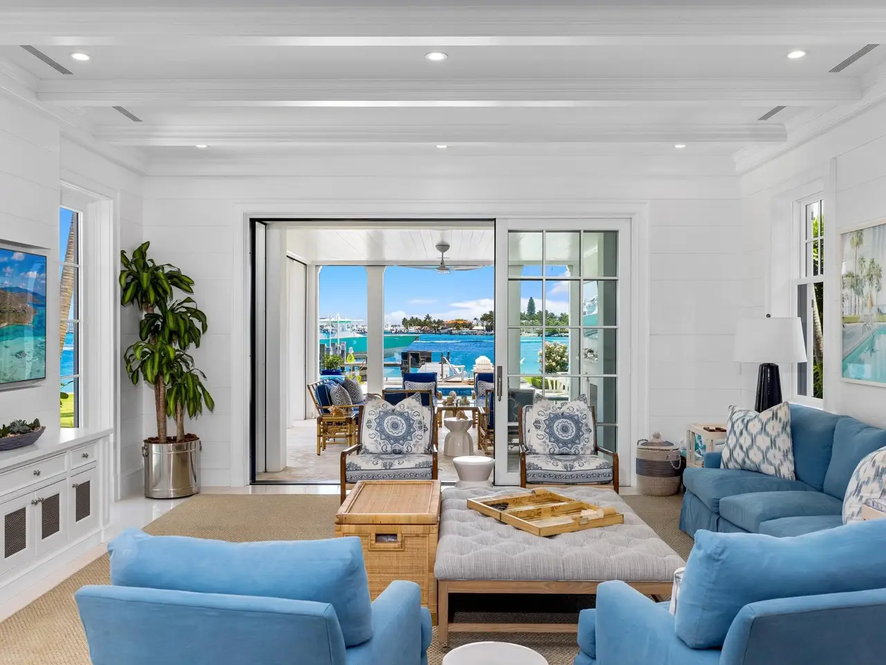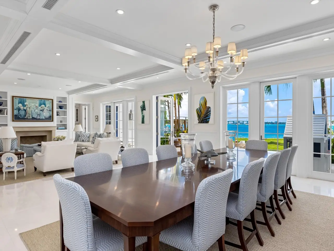 Stately fireplace with Bahamian blue water colors