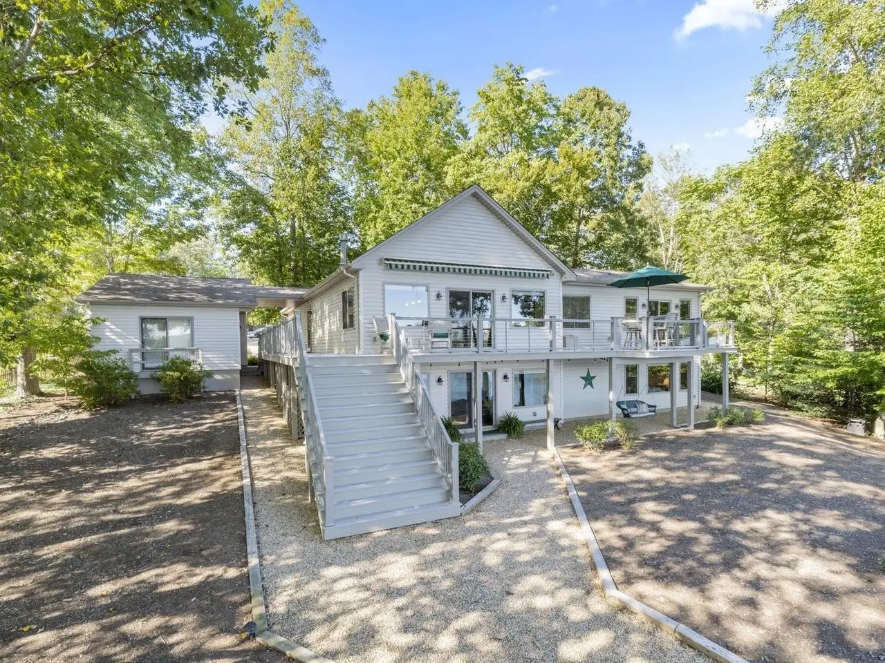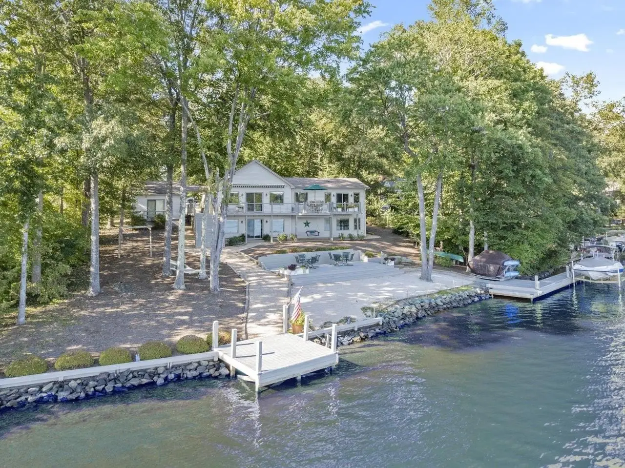 Exceptional lakefront living awaits with this beautifully remodeled and meticulously maintained residence, perfectly situated on 180 feet of pristine open water frontage. Designed for both elegance and enjoyment, the property offers breathtaking moonlit evenings from expansive outdoor living areas, including a spacious main deck, larger lower deck, and professionally landscaped grounds. The private waterfront features two docks, a boat lift, and a sandy beach ideal for recreation and gatherings. With its rare level lot, the walk to the water is effortless, enhancing both convenience and lifestyle. Inside, the home showcases thoughtful upgrades and tasteful finishes throughout, reflecting the highest standards of care and quality. Its prime location provides quick access to the main gate, clubhouse, beach, and playground?offering both privacy and proximity to community amenities. This distinguished property combines prestige, comfort, and unrivaled access to Lake Monticello?s most coveted open water setting.,Granite Counter,Fireplace in Great Room