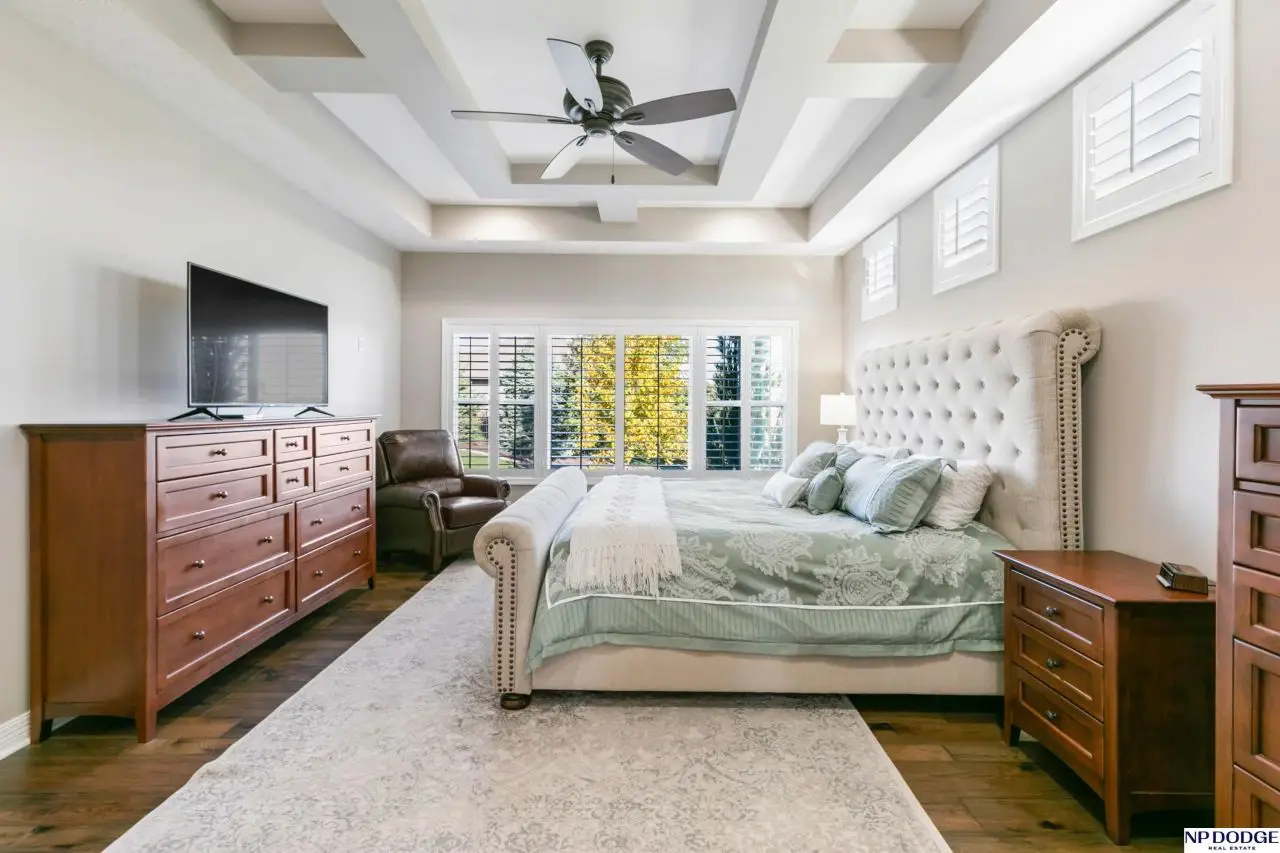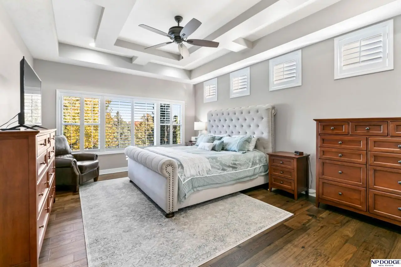 Ashbury Farm - Papillion's most prestigious neighborhood! Custom 1.5-story w/ 4 bd + office & exercise rm, 5 bath, 5,000+ SF. Main-floor primary suite w/ spa-like bath, built-in safe & custom cabinetry. Grand great rm w/ 20' coffered ceilings & stone fireplace. Gourmet kitchen w/ large island, wine fridge & walk-in pantry. Upstairs: 3 bd all w/ private baths & walk-in closets. Lower level made for entertaining - bar, pool/game rm or optional 5th bd, 3/4 bath & exercise rm. Outdoor living w/ covered patio, fireplace, custom firepit & landscaped fenced corner lot. Oversized 3-car garage. Unmatched value - better in person, a must-see!
