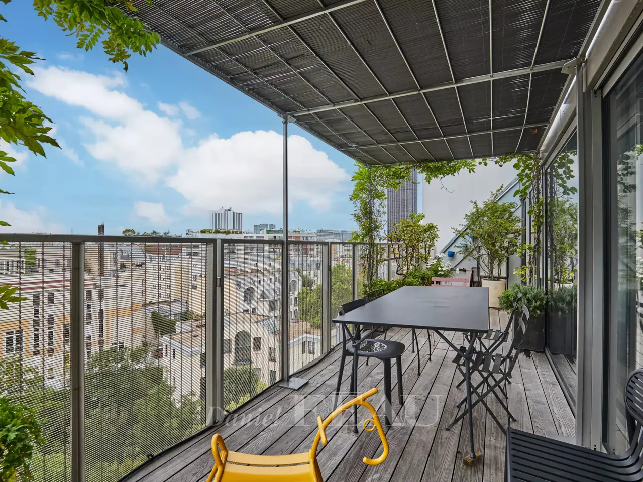 Campagne première neighbourhood. This peaceful 92 sqm apartment benefiting from a leafy 25 sqm terrace enjoying views of the capital is on the top floor of a recent building. Air-conditioned and in perfect condition, it includes a living room, a sitting room, a fitted and equipped kitchen with a dining area, two bedrooms, a bathroom and a shower room. With a cellar and a basement parking space.