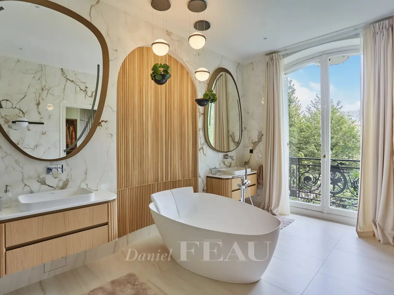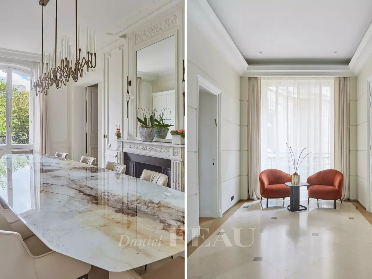 Avenue Foch. This exceptional near 375 sqm apartment on the 1st floor of a fine early 20th century building has been meticulously renovated throughout in a contemporary style. An entrance hall leads to a triple living/reception room overlooking leafy greenery, a study, a kitchen with dining facilities, a utility room, a mster bedroom with a bathroom/steam shower and a generous dressing room, three further bedrooms and two bathrooms. With a 17 sqm studio apartment, two 9 sqm maid’s bedrooms and three cellars. Air-conditioned throughout, and sold furnished.