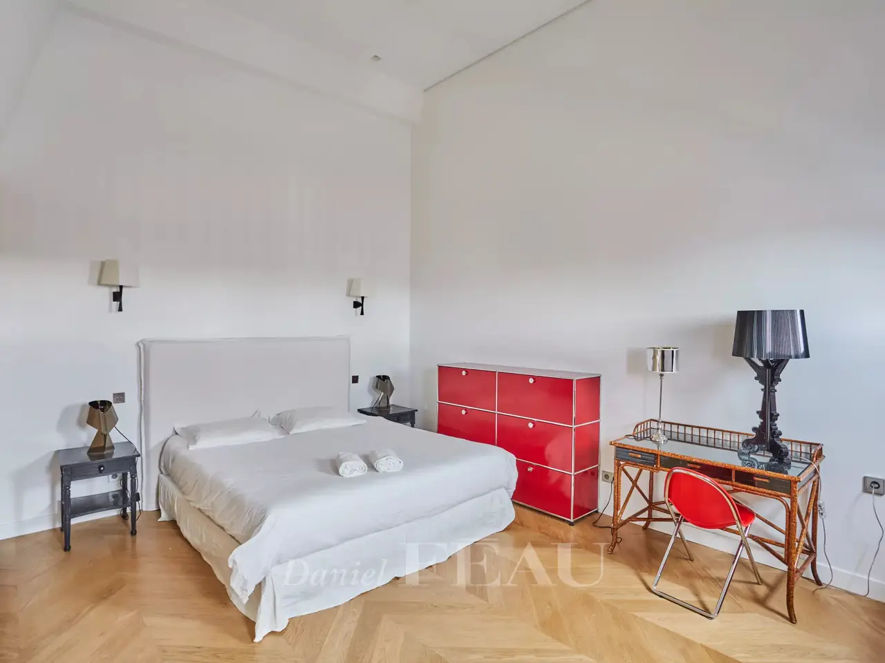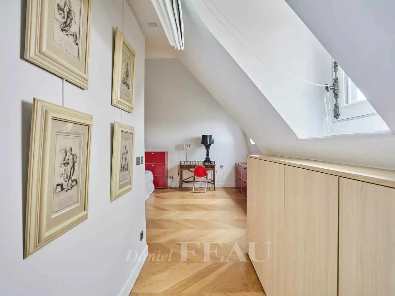 Flandrin neighbourhood. This split-level apartment offering 85.90 sqm of floor space and 76.50 sqm of living space as defined by the Carrez Law is on the 7th floor of an early 20th century building with lift. Renovated throughout by a renowned interior decorator, it includes a living/reception room and dining room, a separate kitchen, a superb master suite featuring an over 4-metre high ceiling, a shower room, a separate wc, and a study/guest bedroom enjoying a view of the Eiffel Tower. The apartment may be sold furnished. Individual heating, reversible air conditioning. Excellent insulation. A superb pied a terre.