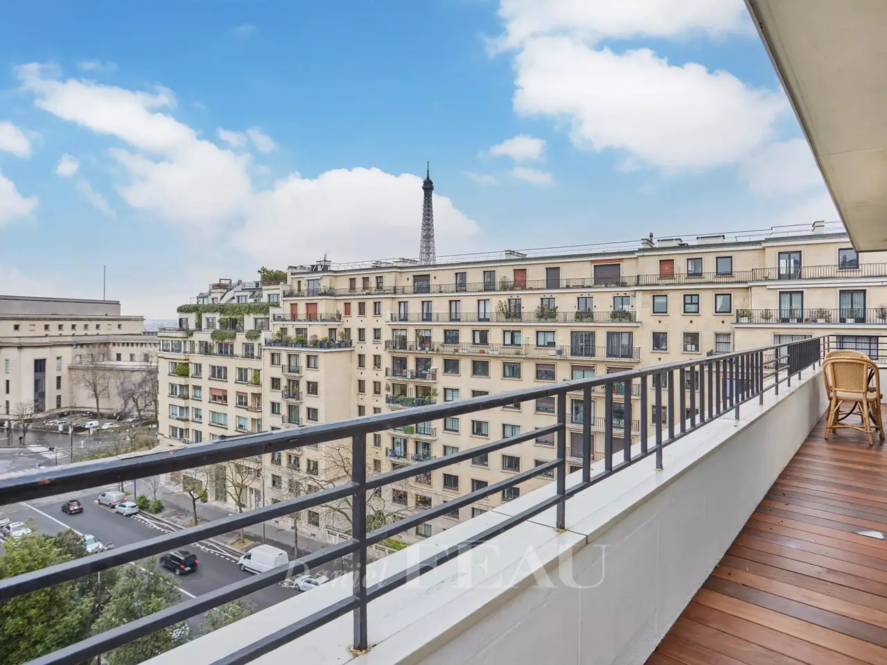 This exceptional 123 sqm apartment is on the 7th floor of a relatively recent building located a stone’s throw from Place du Trocadéro. Commanding open views, it includes a spacious living/reception room/kitchen/diing room opening onto a continuous balcony, two suites with shower rooms and dressing rooms, and a guest wc. Air-conditioning. Sold fully furnished. With a cellar and a parking space.