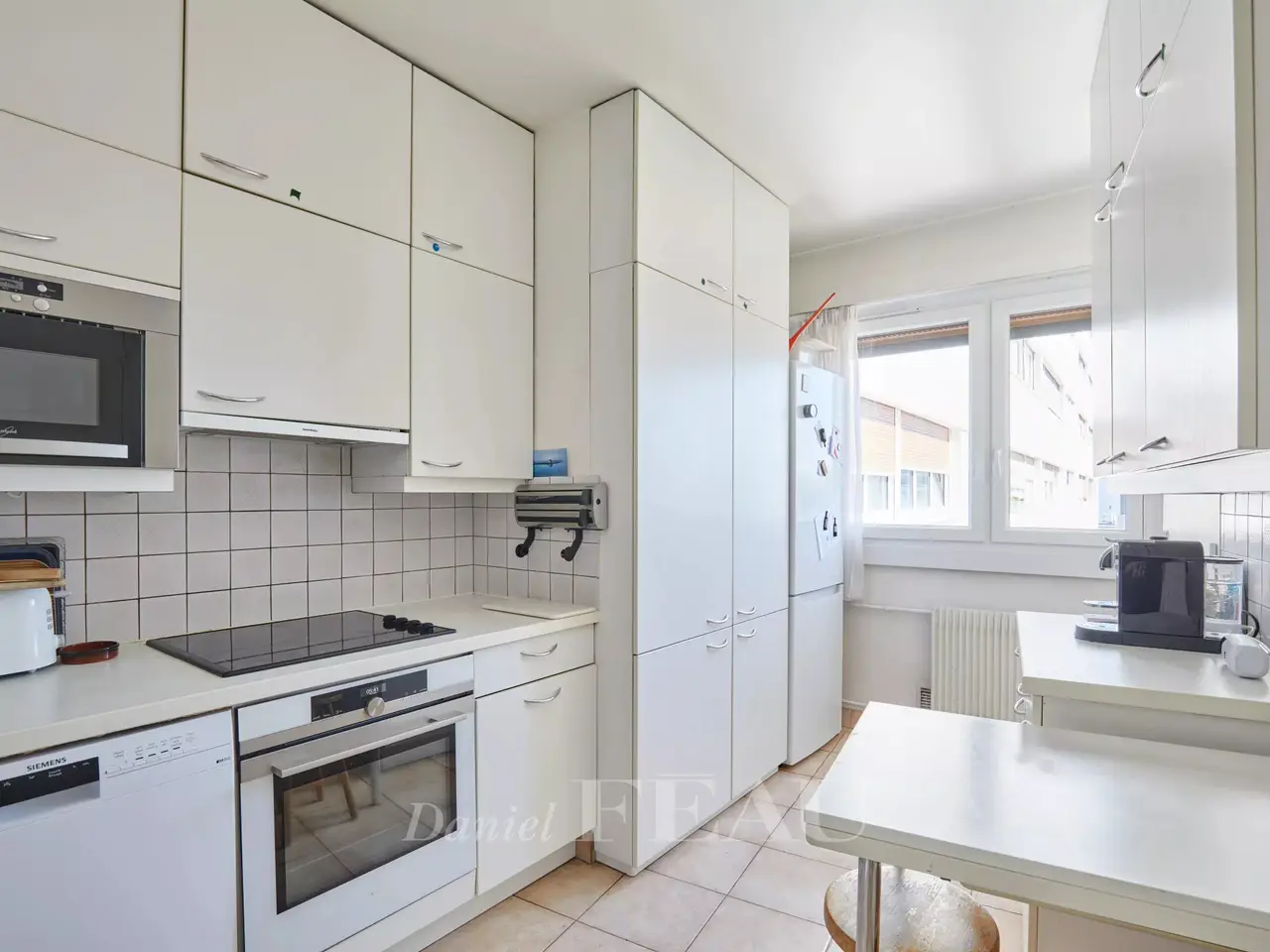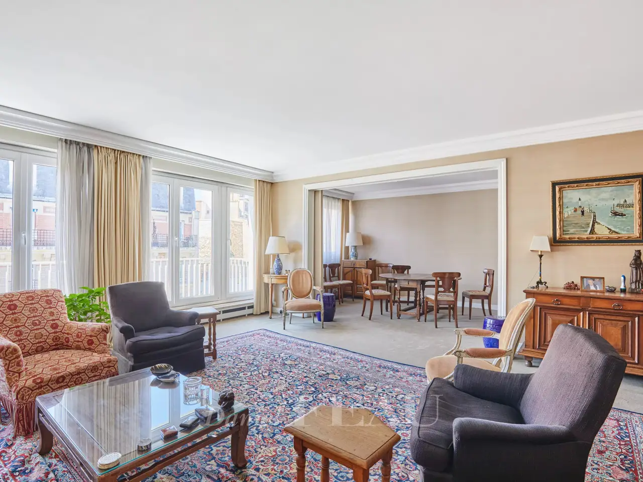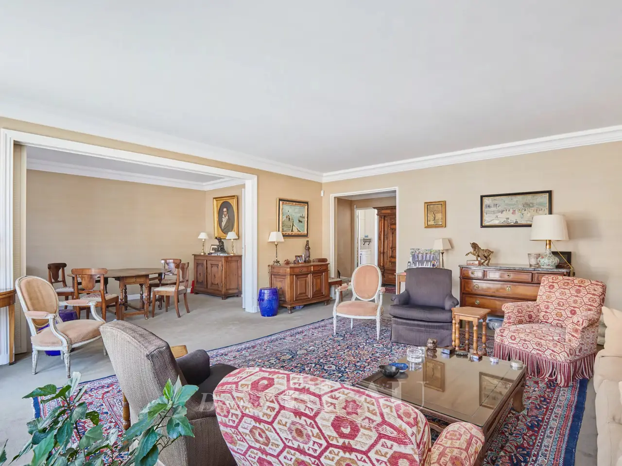 Sole Agent. Auteuil South, Exelmans neighbourhood. This bright 128 sqm family apartment is on the 6th floor of a well-maintained mid 20th century building. It includes a double living/reception room opening onto a wide continuous balcony, a dining room, a kitchen with a pantry and a utility area, three bedrooms one with a bathroom, a shower room/wc and a separate wc. The dining room could create a 4th bedroom if possible. Ample fitted storage space. With a cellar. A parking space in the building may be acquired.