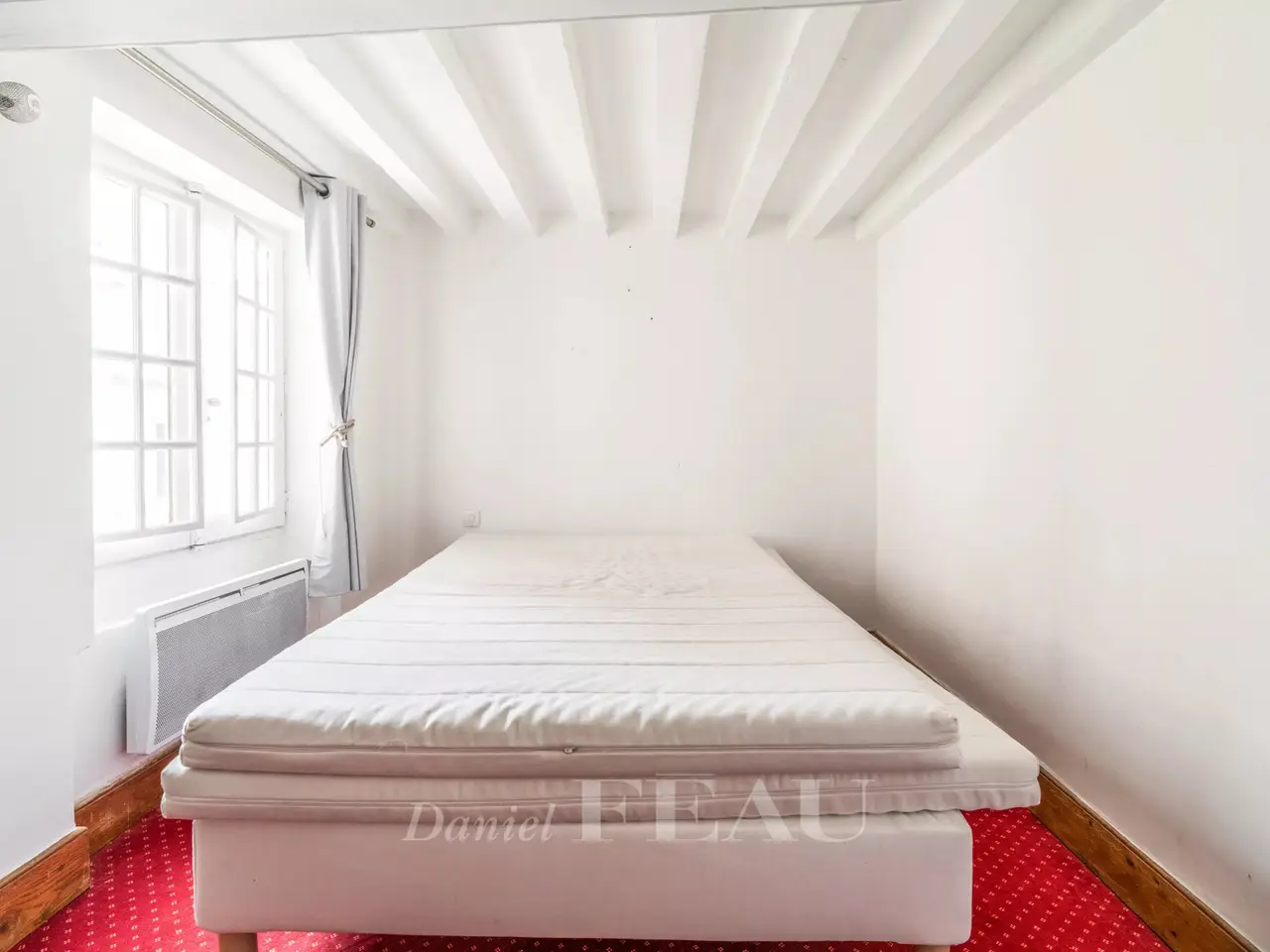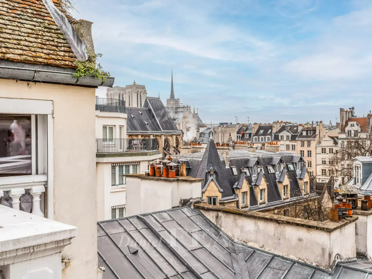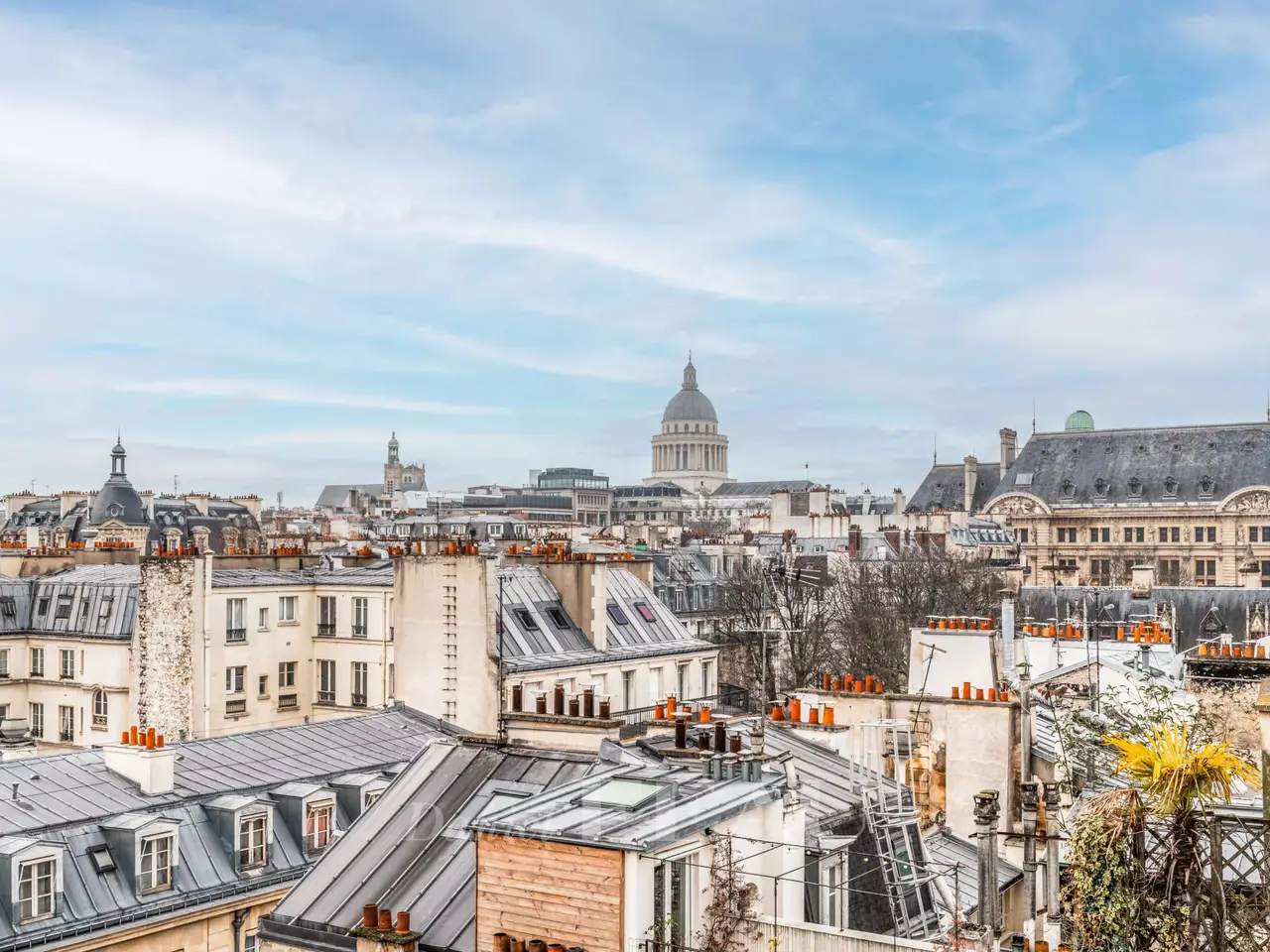 Between Notre Dame Cathedral and the Panthéon. This atypical apartment offering 118 sqm of bright and peaceful floor space and 108 sqm of living space as defined by the Carrez Law is on the 4th and top floor of a late 19th century building with a lift. Enjoying an open view over the rooftops, it includes a spacious living/reception room, a kitchen with dining facilities, a bedroom with a shower room, and a separate wc. Upstairs are two rooms including a master suite with a bathroom, both of which open onto a sunny terrace. A roof terrace commanding a panoramic view of the capital’s iconic landmarks is on the top floor. Henri IV catchment area.