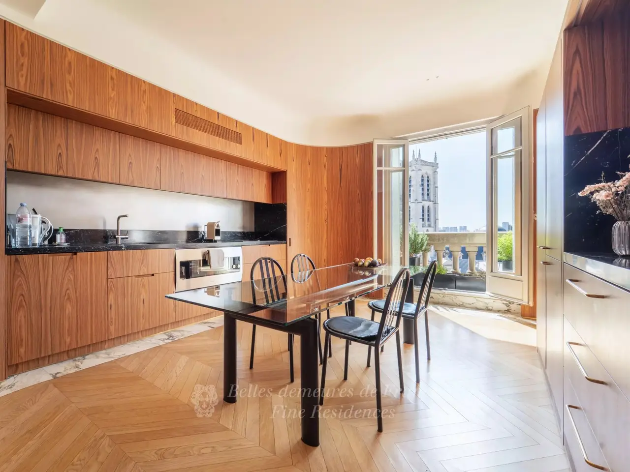 This magnificent 230 sqm apartment on the top floors of a luxurious late 1920s building includes a particularly sunny living/reception room opening onto balconies and commanding stunning views of Place du Pantheon and the church, a kitchen with dining facilities, two bedrooms with bathrooms, and a study. The upper floor boasts breathtaking views of the capital and its landmarks, and comprises a master bedroom opening onto two terraces, and a study/home cinema. A parking space nearby is available for purchase or rental. Henri IV catchment area.