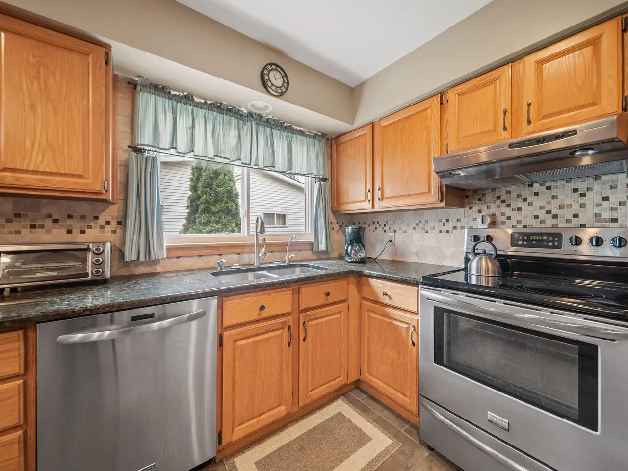• Warm wood cabinetry and stainless steel appliances